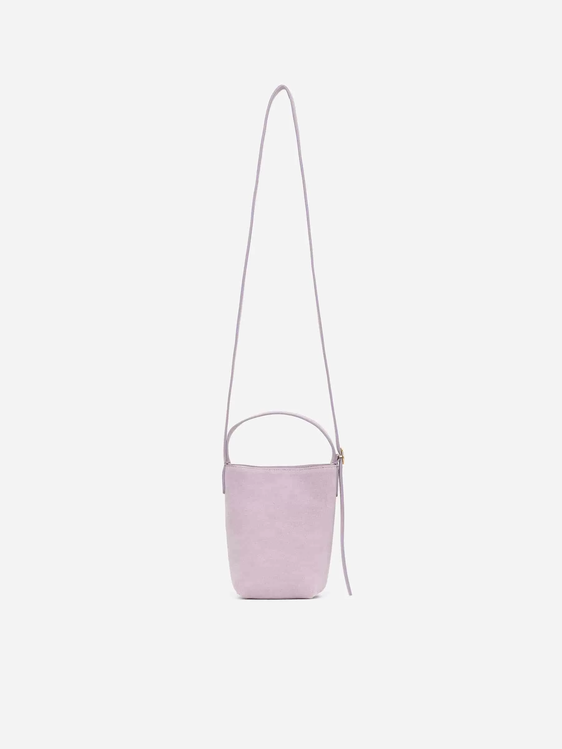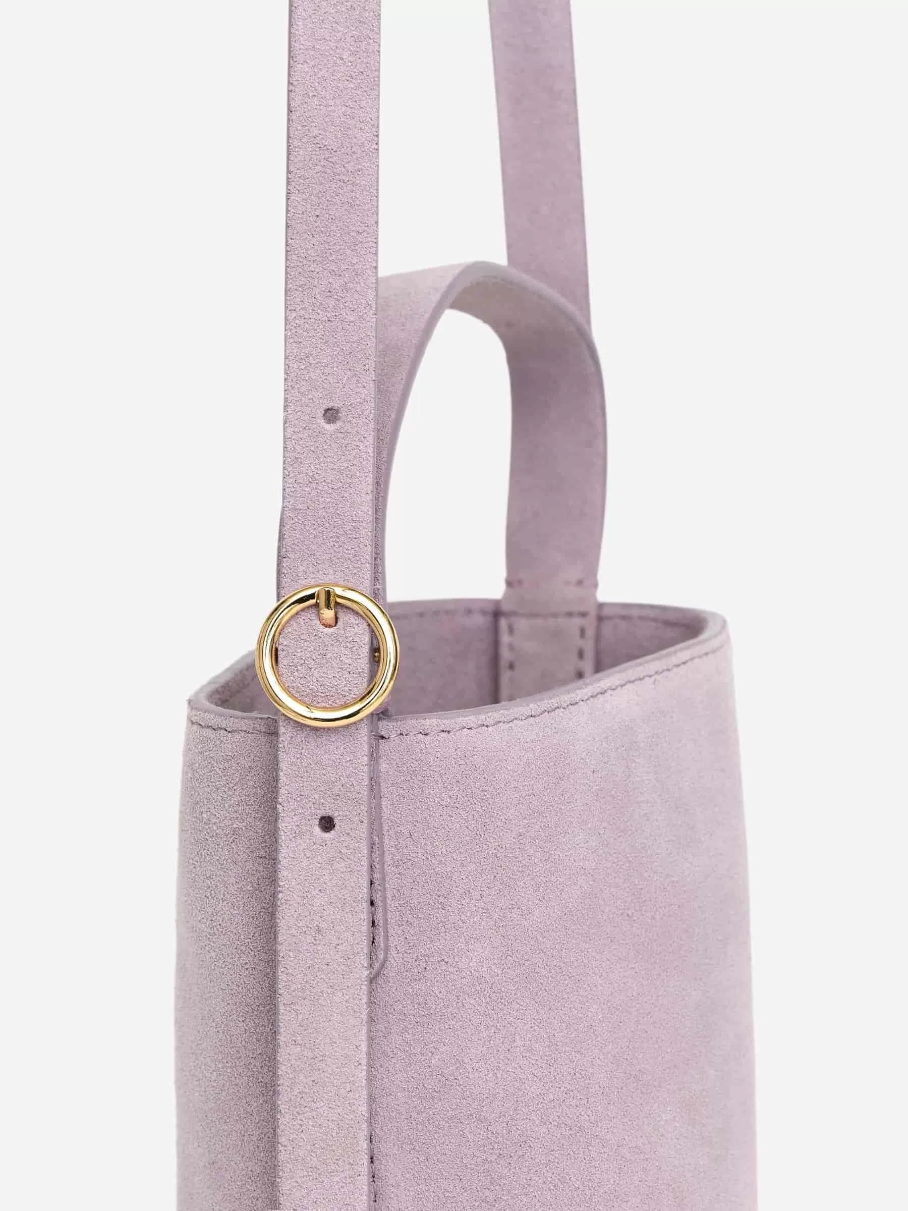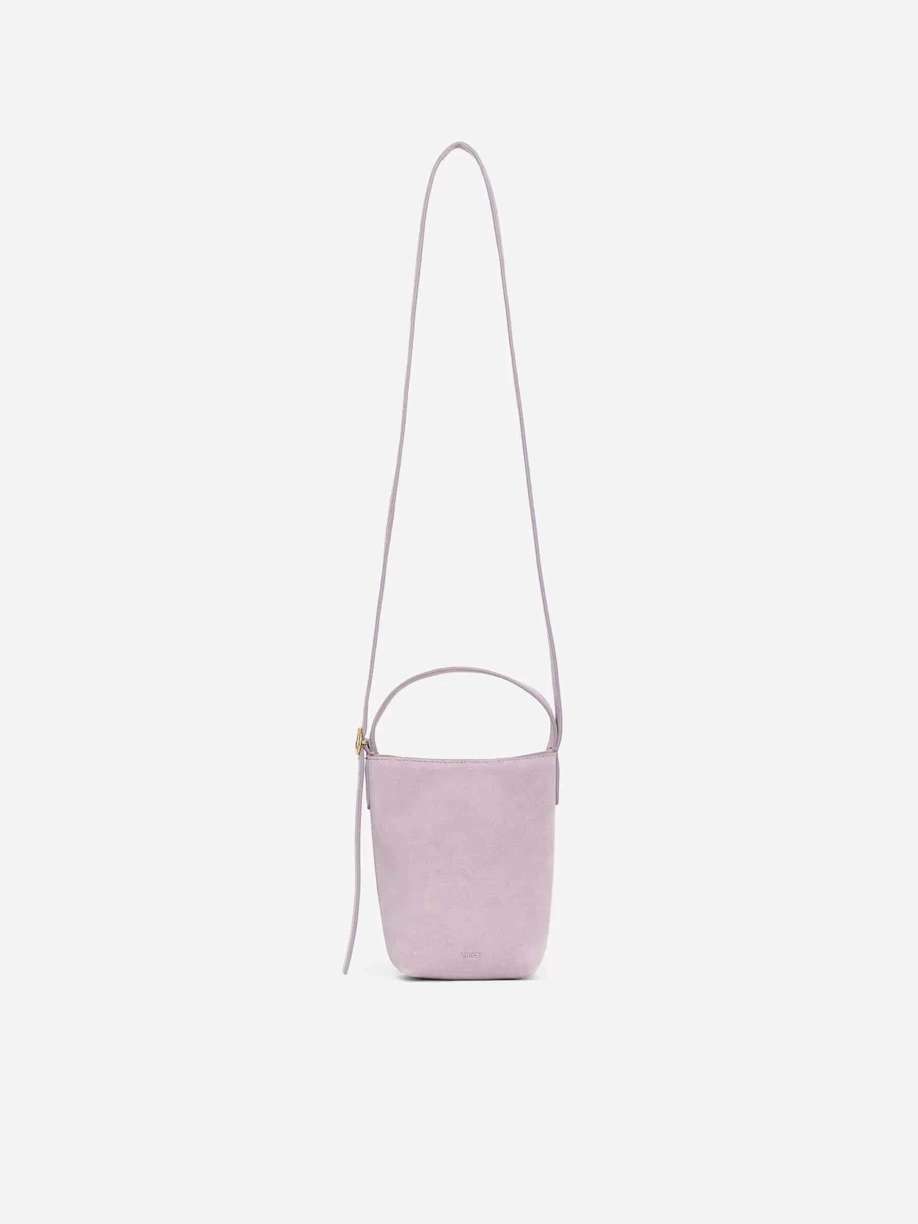 Kleine Umhängetasche aus chromfreiem Wildleder. Verstellbarer oberer Griff mit goldfarbener Schnalle. Schmaler Schultergurt, der bei Nichtgebrauch in der Tasche verstaut werden kann. Magnetverschluss. Breite 10,5 cm, Höhe 18,5 cm. Riemenlänge 55 cm.