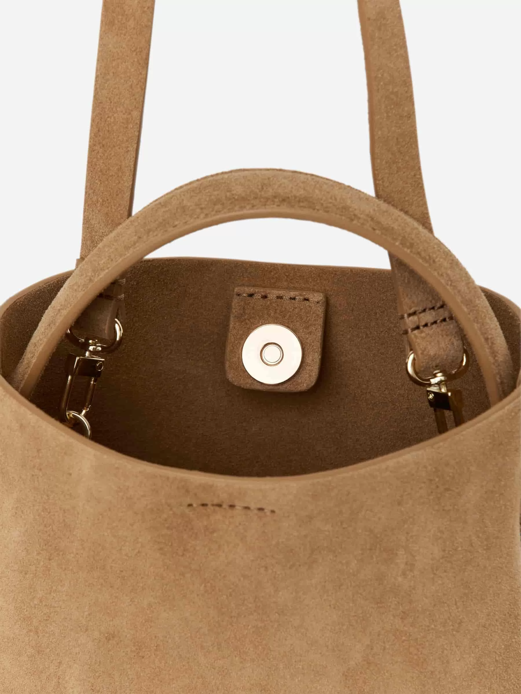 Mini-Umhängetasche aus doppeltem Wildleder, das einem chromfreien Gerbungsprozess unterzogen wurde. Ausgestattet mit einem Tragegriff oben und einem abnehmbaren Schultergurt. Magnetverschluss und eine Innentasche. Abmessungen: 14 cm x 17 cm x 6 cm.