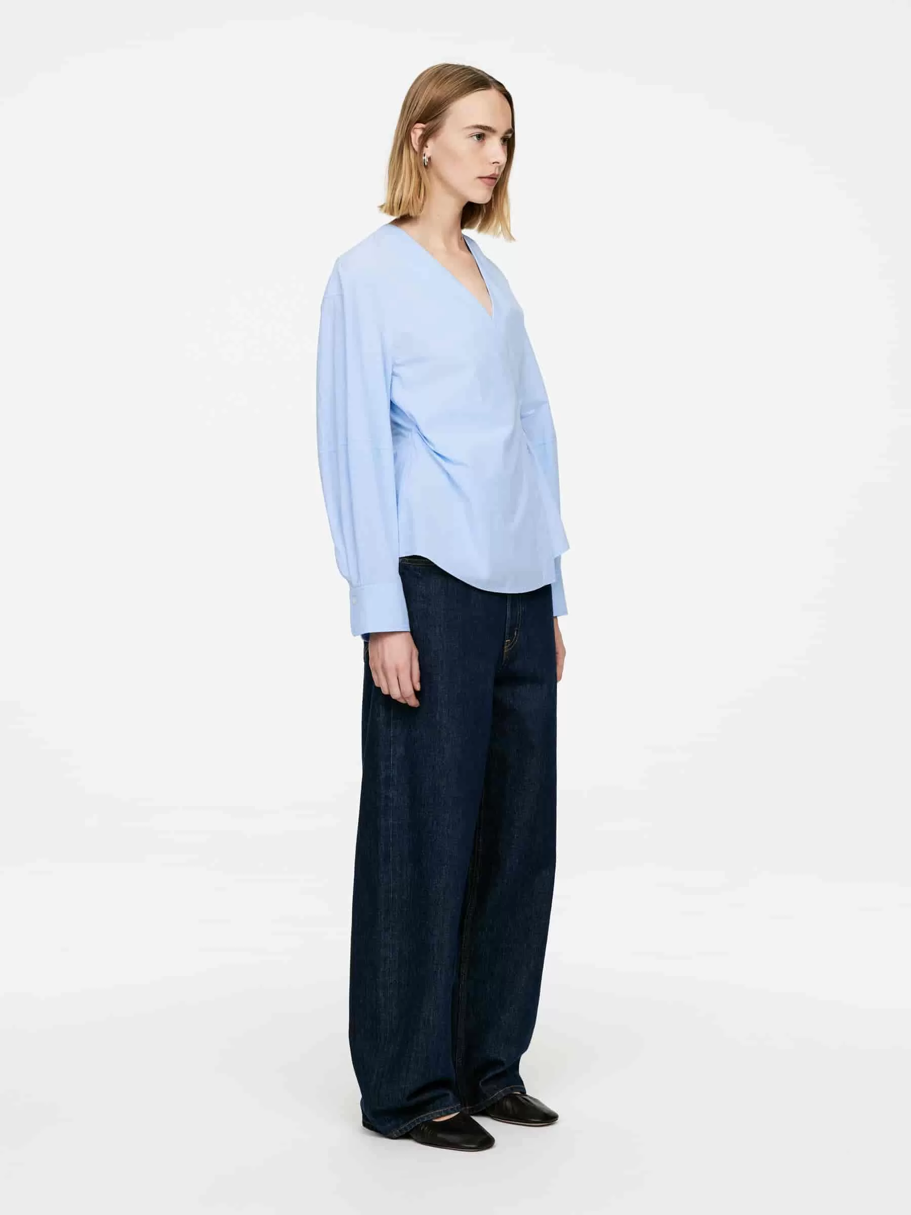 Wickeloberteil aus Baumwolle. Ein Modell mit V-Ausschnitt, überschnittenen Schultern, voluminösen Ärmeln und seitlichem Bindeband. Normale Passform.