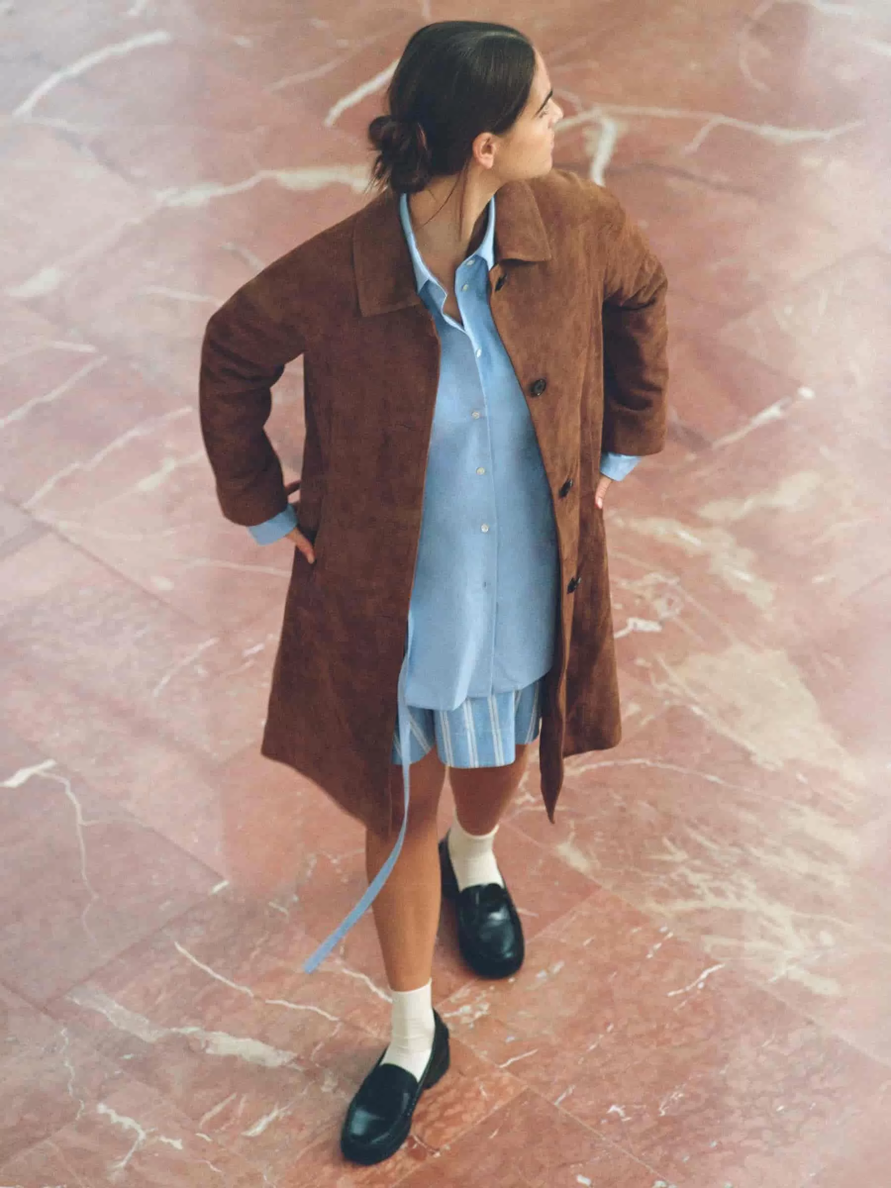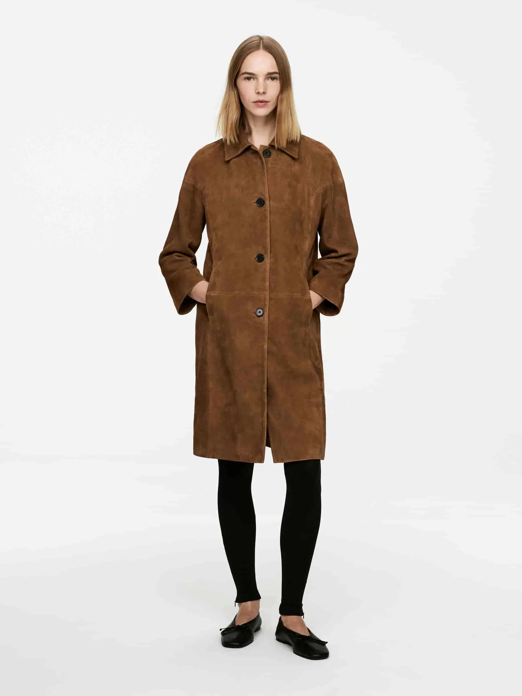 Wildledermantel mit Knopfverschluss und Hemdkragen. Ein vollständig gefütterter Stil mit Taschen in den Seitennähten.