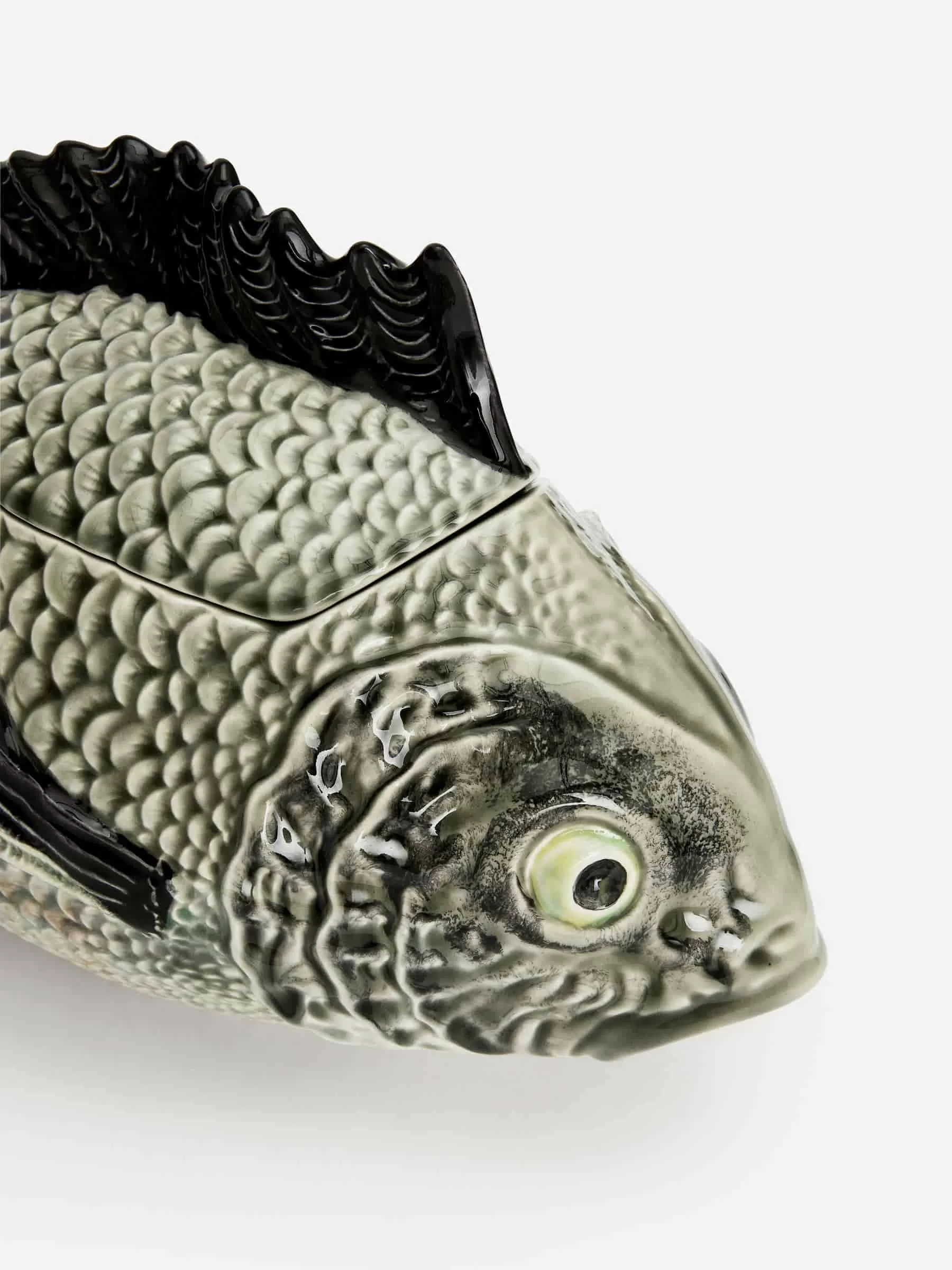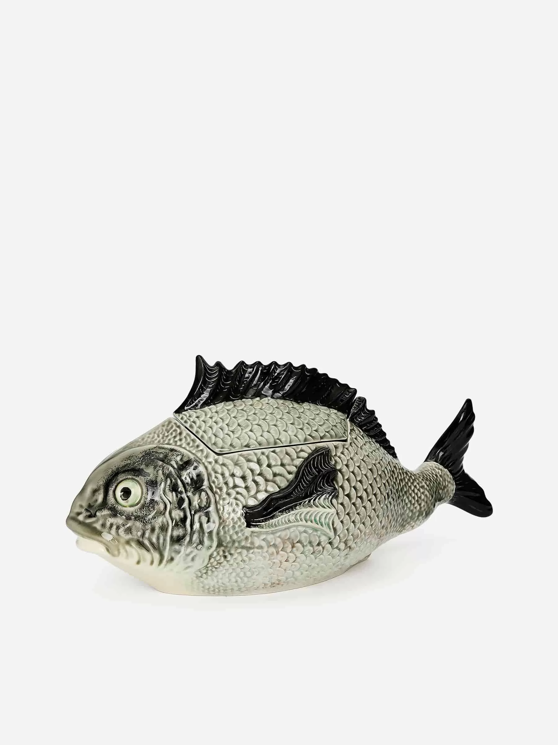 Große Terrine in Form eines Fisches. Ein Statement-Stück aus der beliebten Fischserie des portugiesischen Bordallo Pinheiro. Handbemaltes Steingut. Fassungsvermögen 3,3 Liter. Maße: 43 cm x 18 cm x 23 cm.