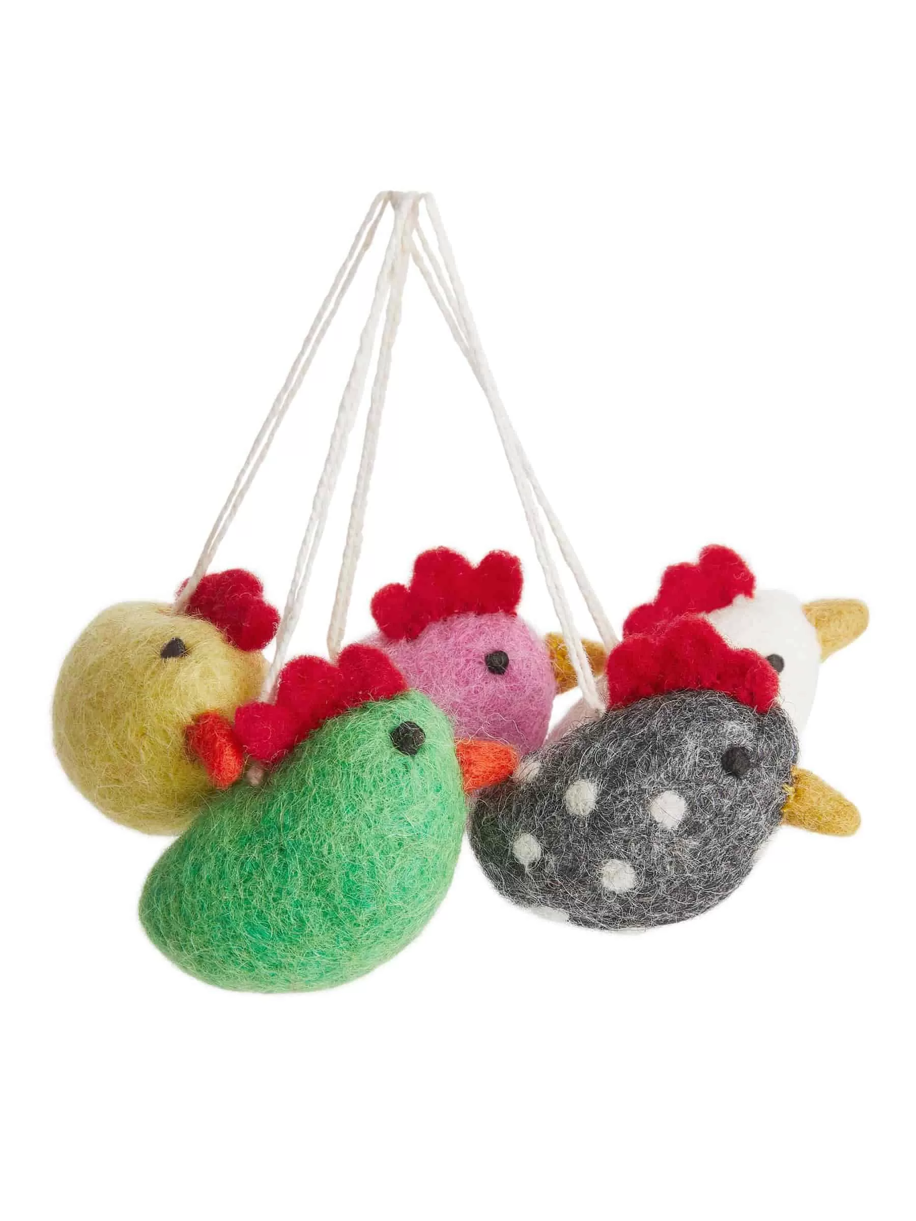 Diese festlichen Dekorationen werden von kleinen, ländlichen Unternehmen in Nepal handgefertigt und bestehen aus gefilzter Wolle. Im Set sind fünf kleine Hühner mit Aufhängeösen enthalten. Die Dekorationen lassen sich problemlos im ganzen Haus platzieren und können auch als Tischdekoration verwendet werden. Entworfen von der schwedischen Fairtrade-Marke A World of Craft. Ca. 4 cm x 5 cm.
