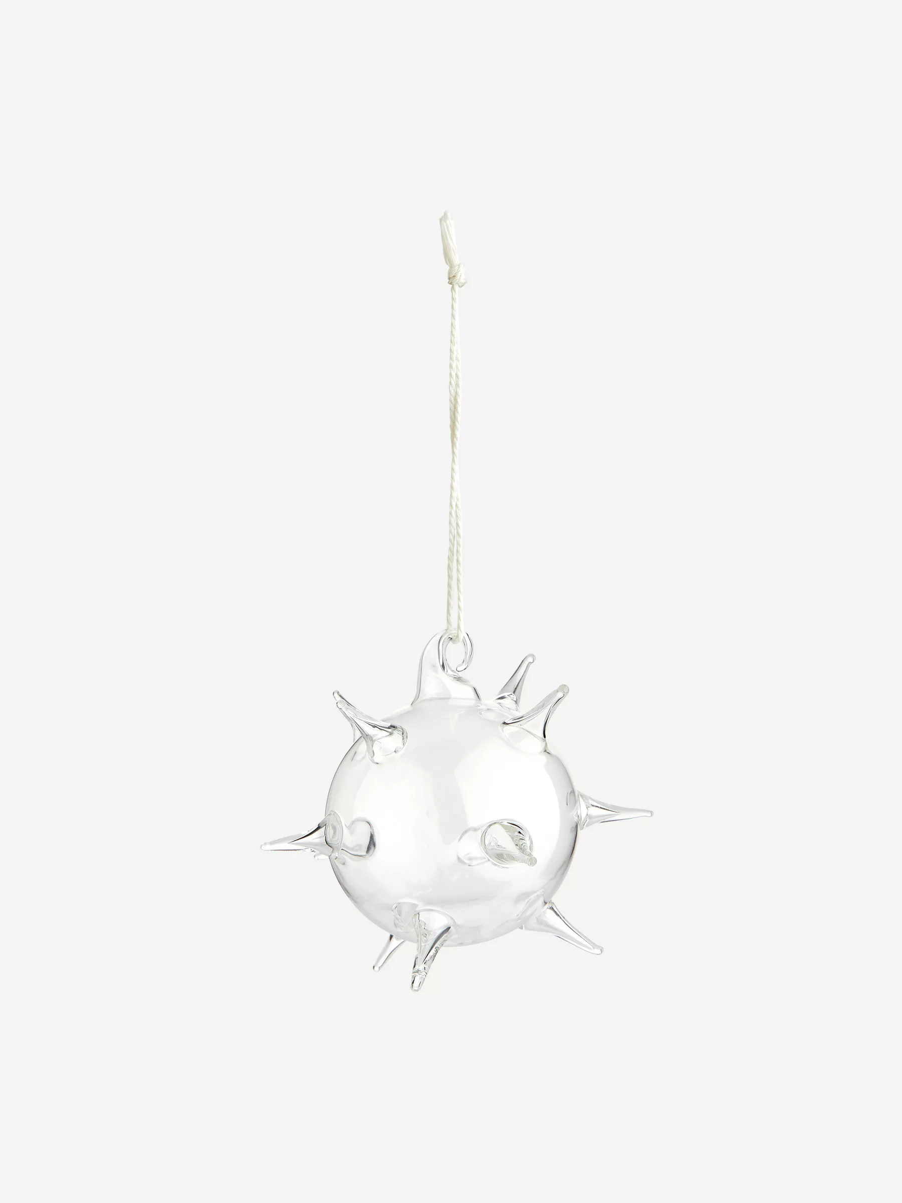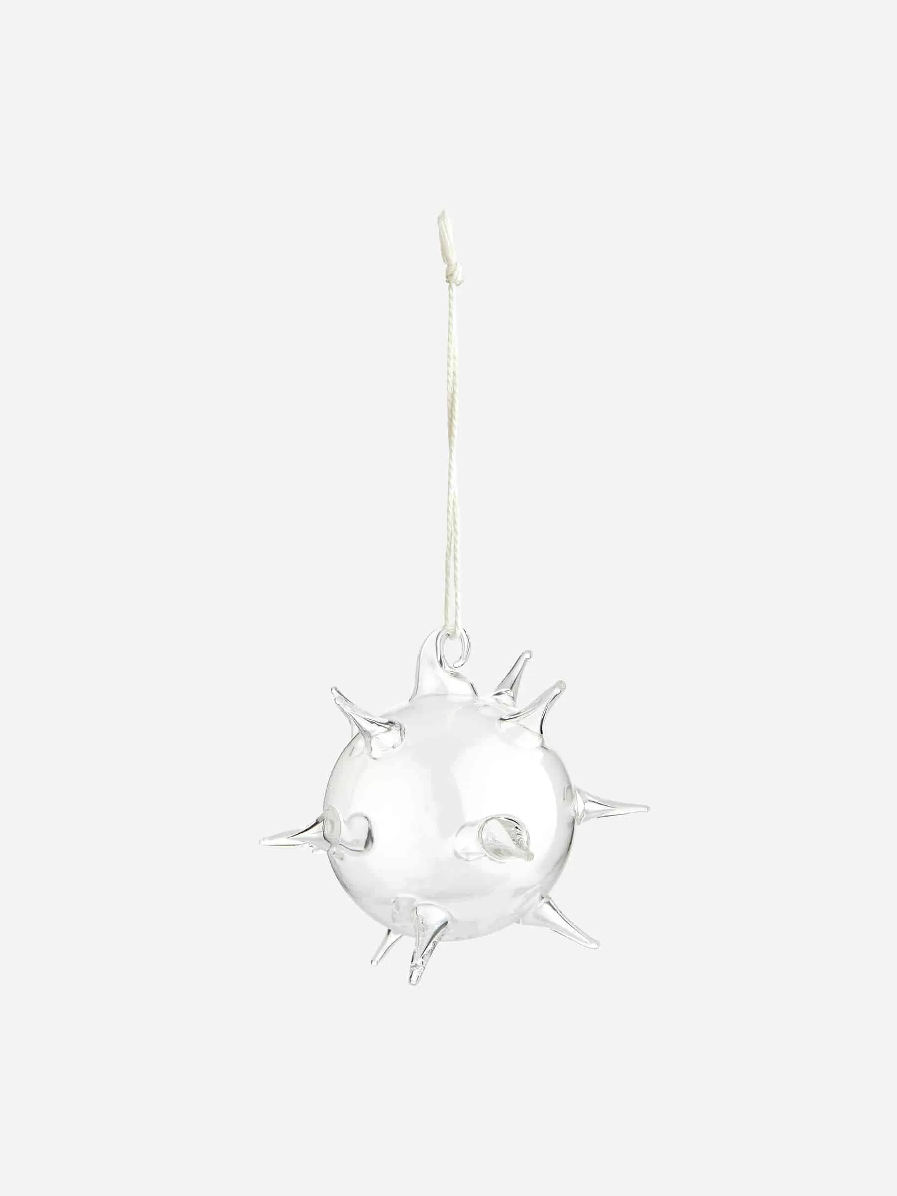 Glasornament mit unregelmäßig platzierten Spitzen. Durchmesser 6 cm. Baumwollschnur 8,5 cm.