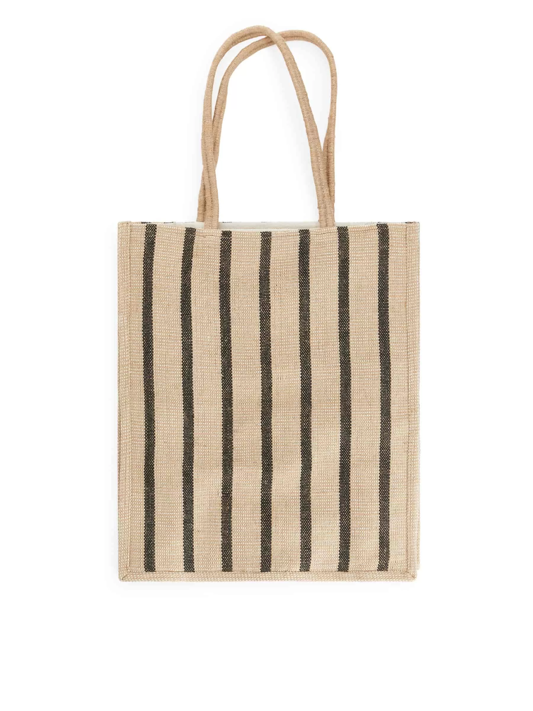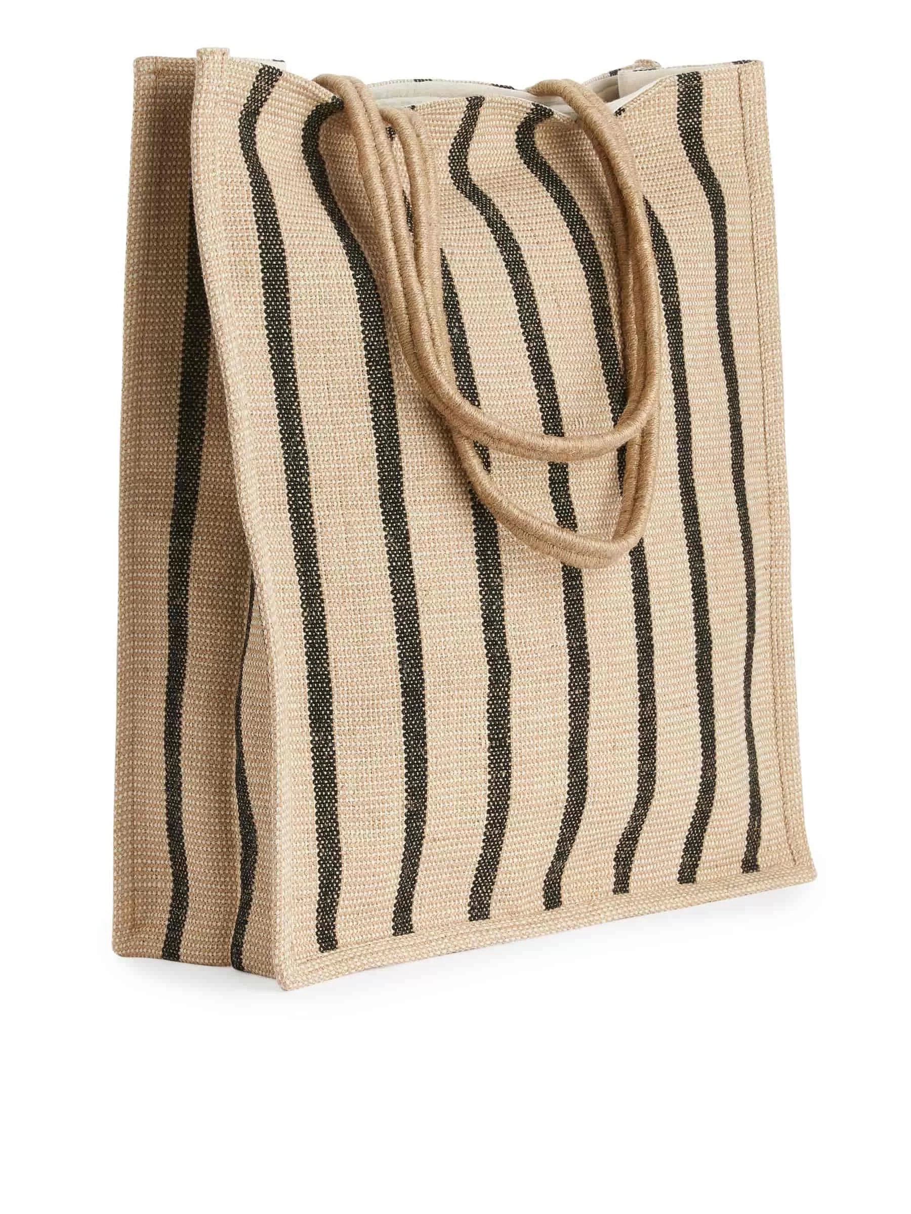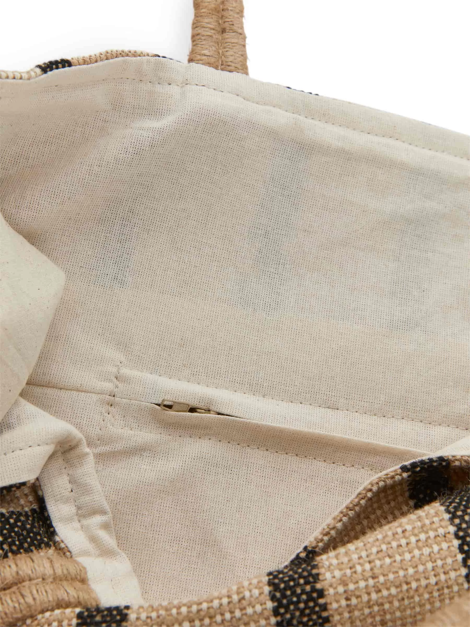 Gewebte Tragetasche aus Jute. Mit Doppelgriffen und Streifenmuster. Baumwollfutter und eine kleine Innentasche mit Reißverschluss. Abmessungen 48 cm x 40 cm.