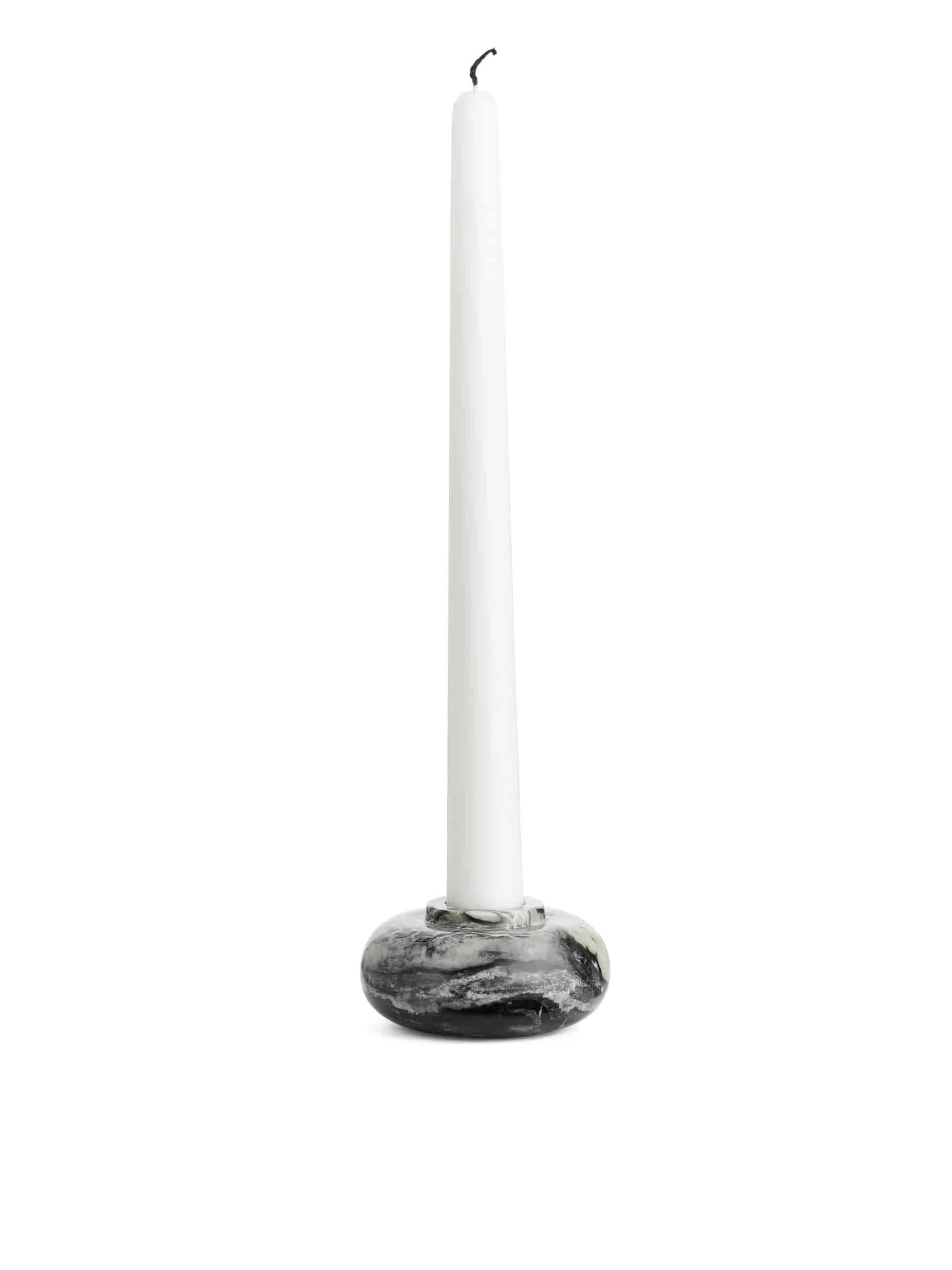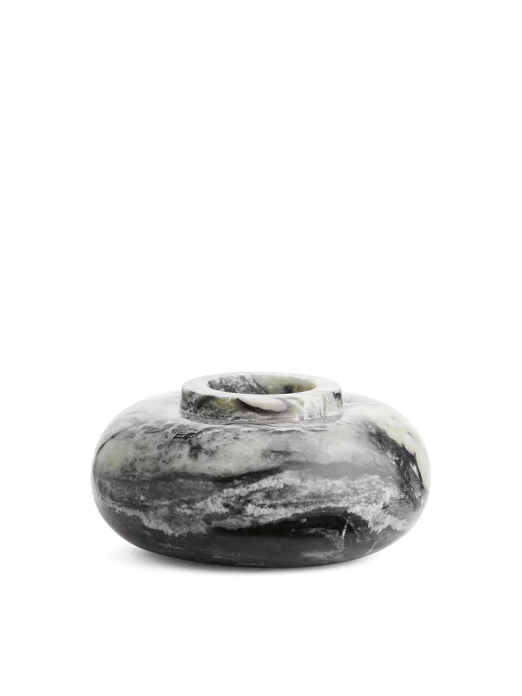 Schwerer Kerzenhalter aus Marmor. Stapelbar und kompatibel mit anderen Stilen derselben Serie für endlose Anordnungsmöglichkeiten. Breite 6,9 cm, Höhe 3,4 cm. Aufgrund der natürlichen Variationen des Marmors erhält jedes Stück ein einzigartiges Aussehen.