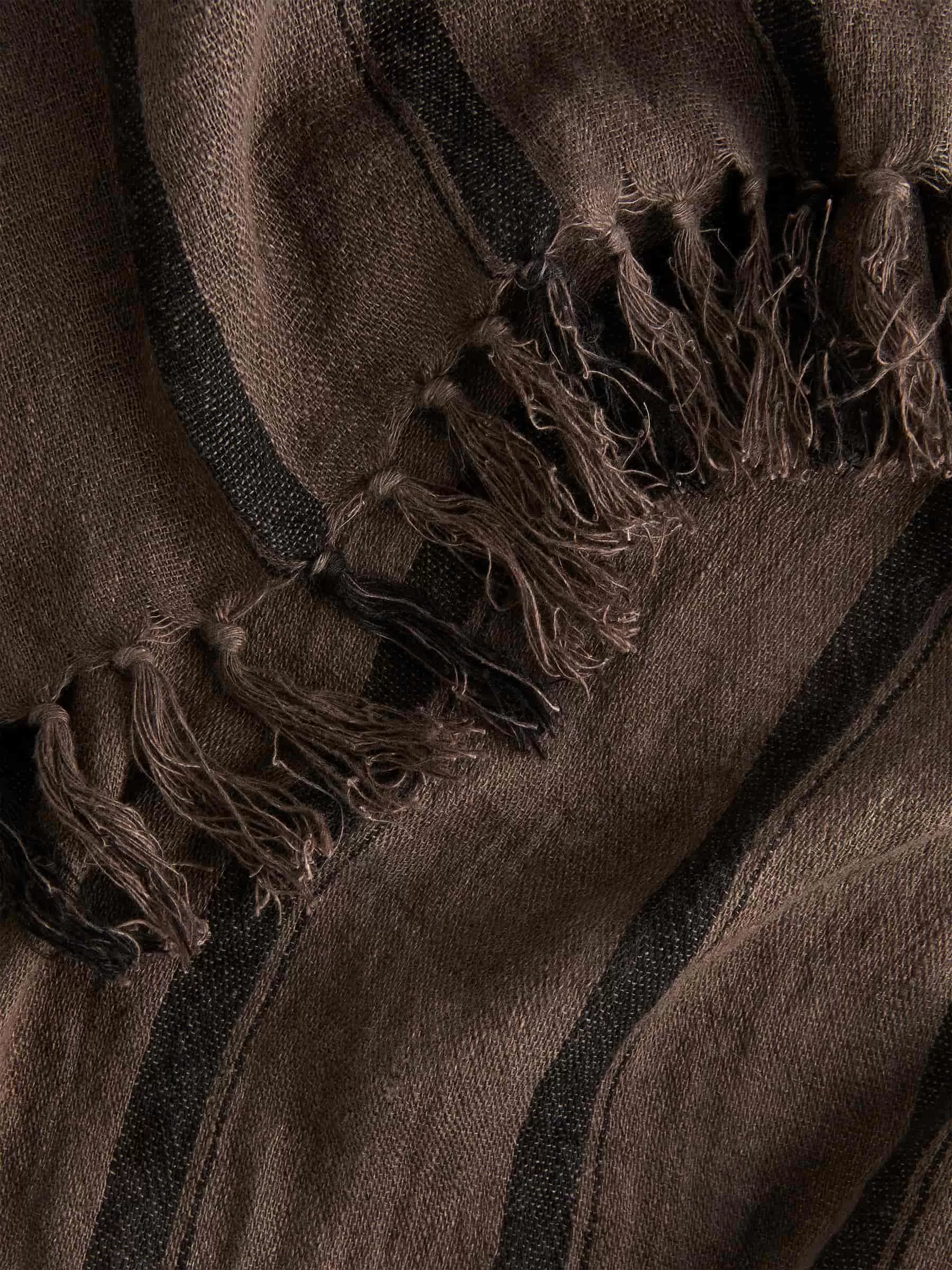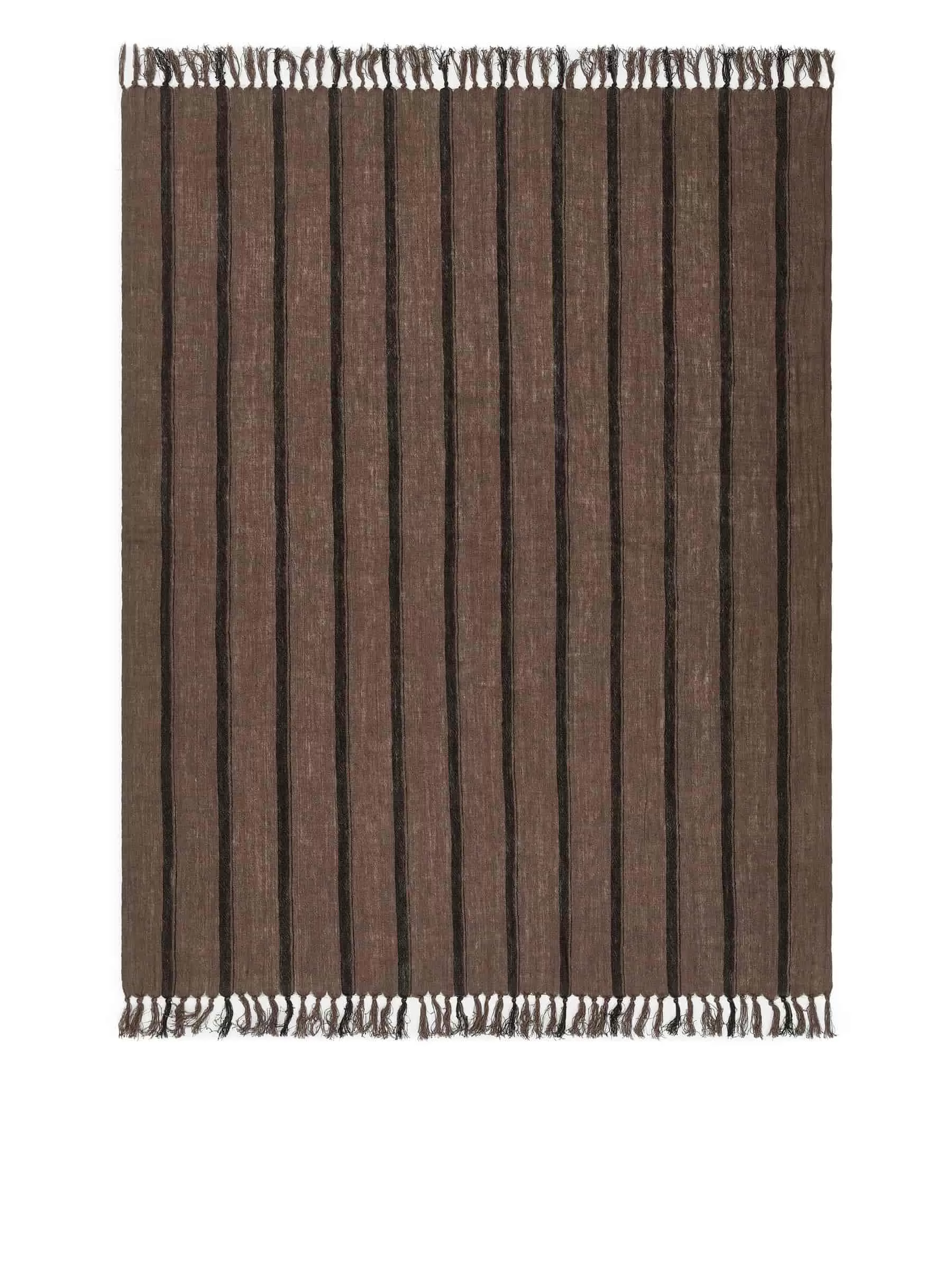 Gewebte Leinendecke mit einem Muster aus garngefärbten Streifen. Fransen an den kürzeren Kanten. Abmessungen 130 cm x 170 cm.