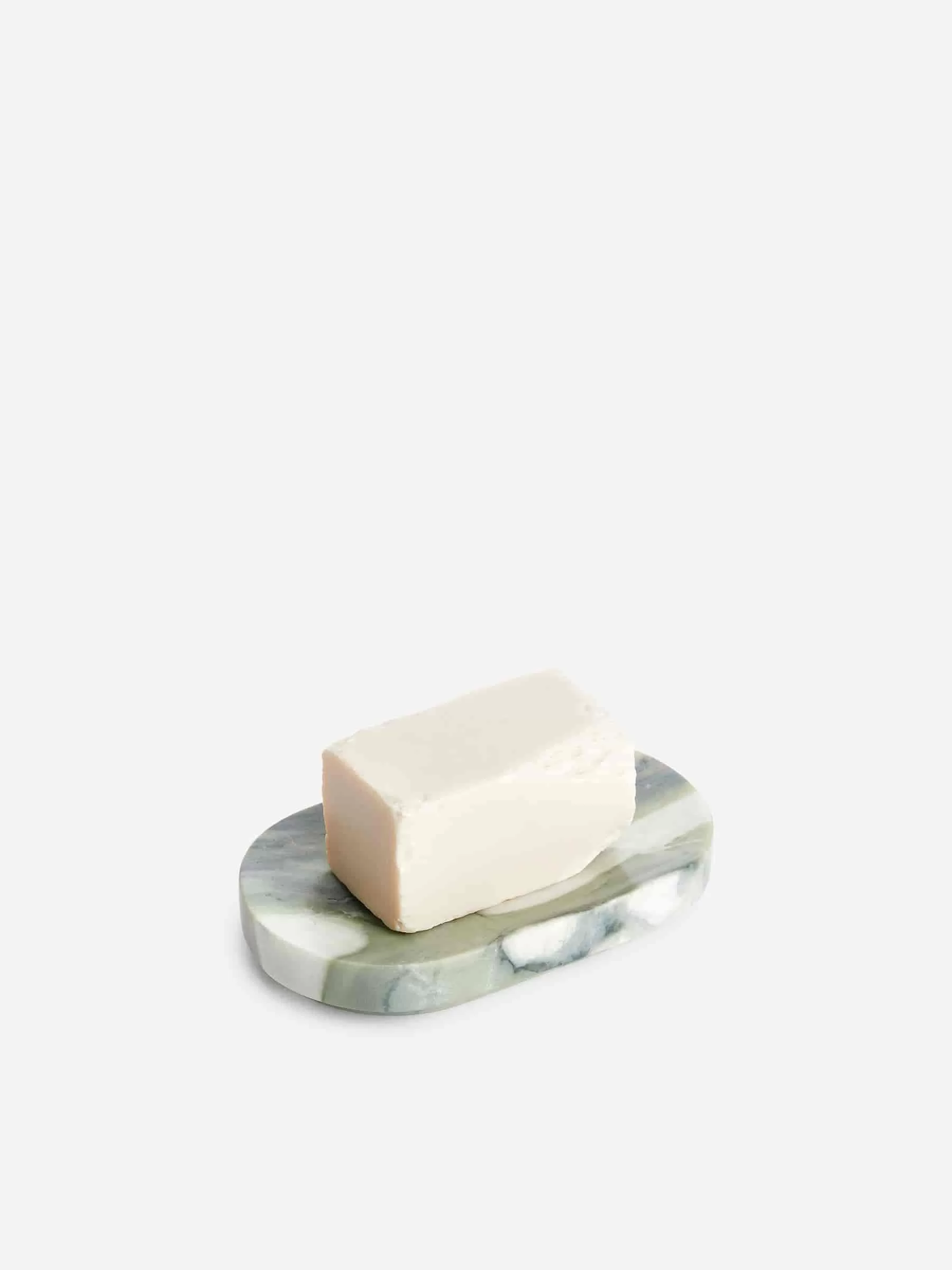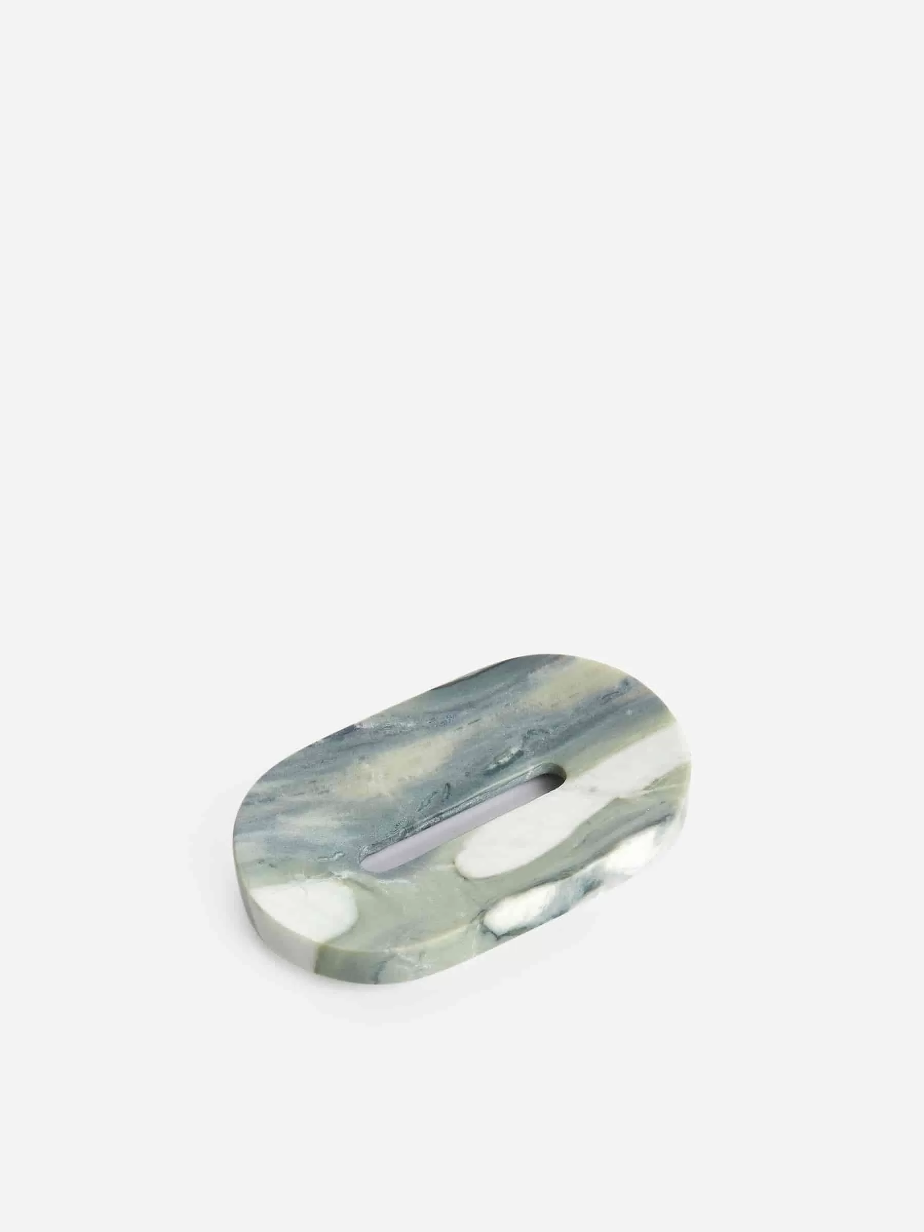 Seifenschale aus Marmor. Aufgrund der natürlichen Variationen des Marmors erhält jedes Stück ein einzigartiges Aussehen. Abmessungen 2 cm x 14 cm x 8,5 cm.