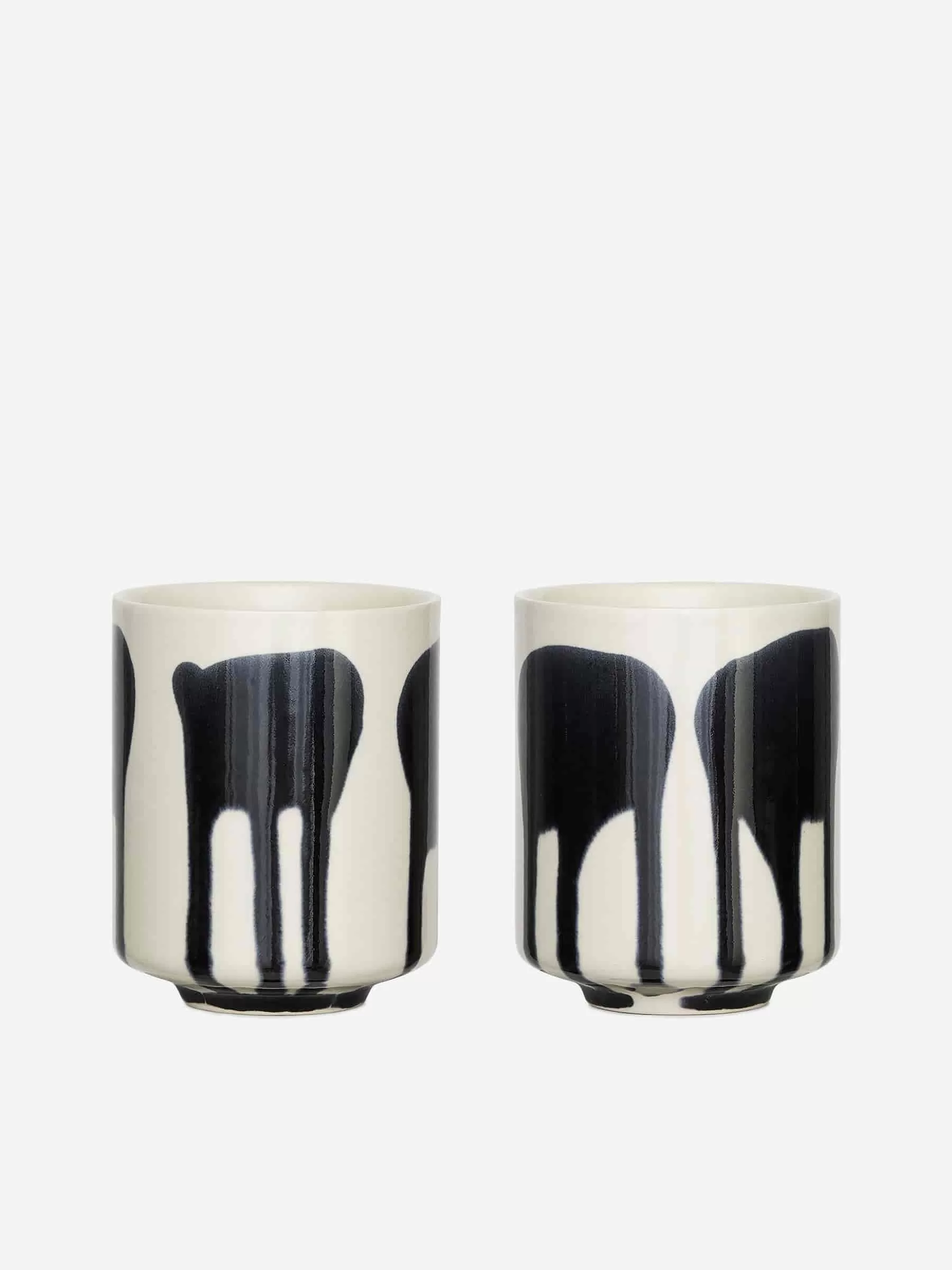 Becher aus vollglasiertem Steingut. Jedes Produkt hat ein einzigartiges Finish, da der Herstellungsprozess teilweise von Hand erfolgt. Höhe 10 cm, Durchmesser 7,7 cm. Verkauft als 2er-Set. Spülmaschinenfest.