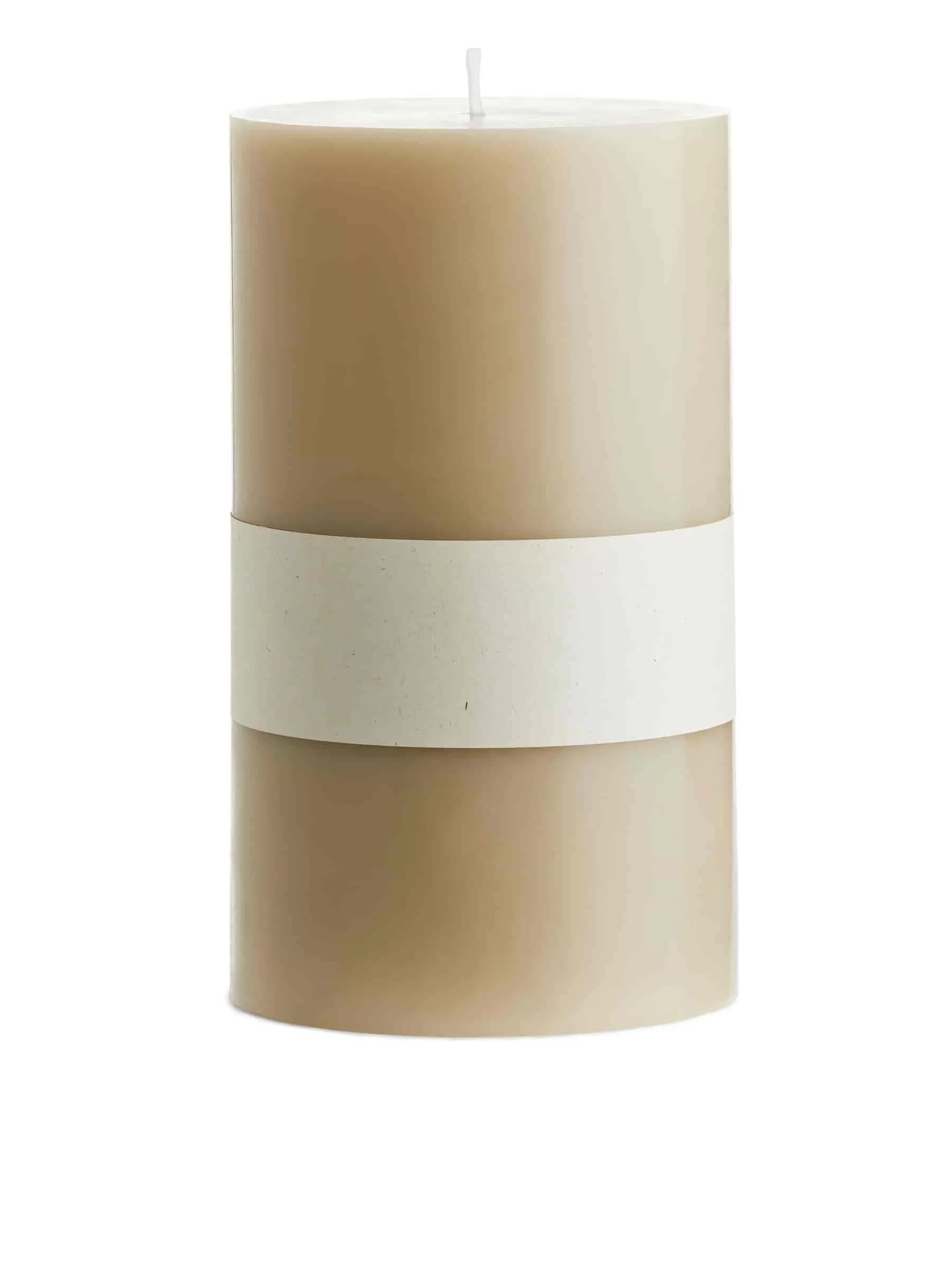 Stumpenkerze aus Wachs. Durchmesser 10 cm, Höhe 17,5 cm. Brenndauer 90 Stunden.