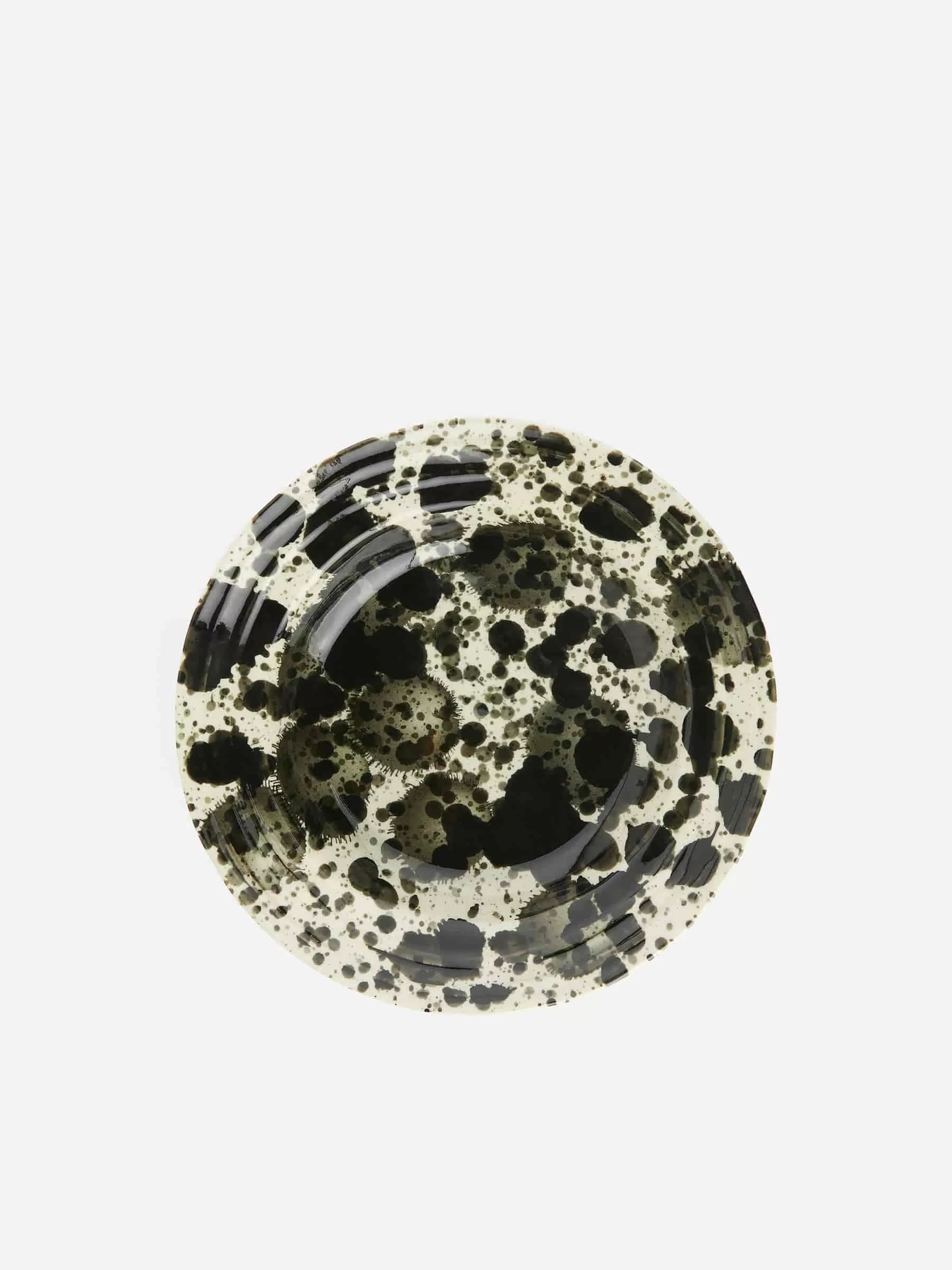 Tiefer Teller zum Essen und Servieren. Der Teller ist aus Steinzeug gefertigt und weist eine leicht unregelmäßige Form und ein handgemaltes Spritzermuster auf. Jedes Stück hat ein einzigartiges Finish. Durchmesser 21,5 cm, Höhe 3 cm.
