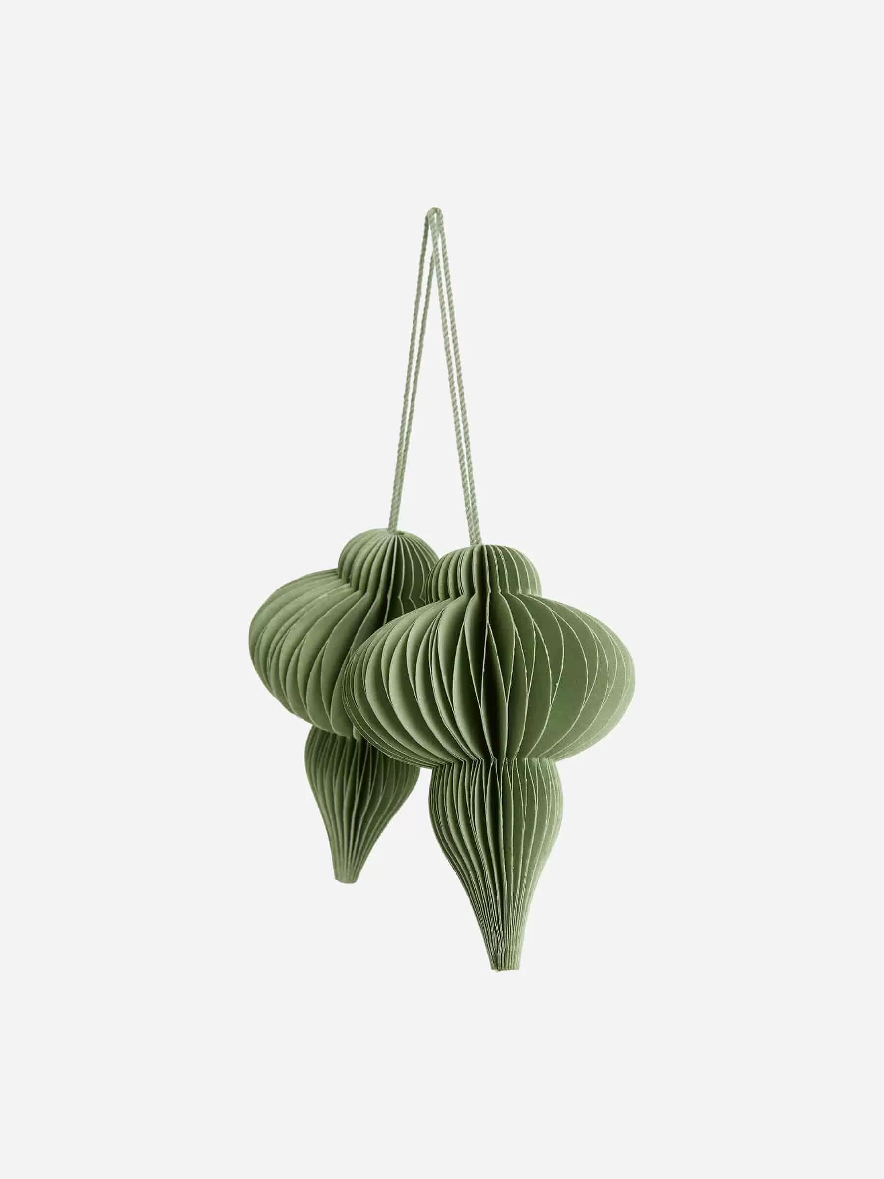 Wabenornamente, handgefertigt aus stabilem Papier. Eine Baumwollschnur zum einfachen Aufhängen. Zweier-Set. Höhe 9 cm.