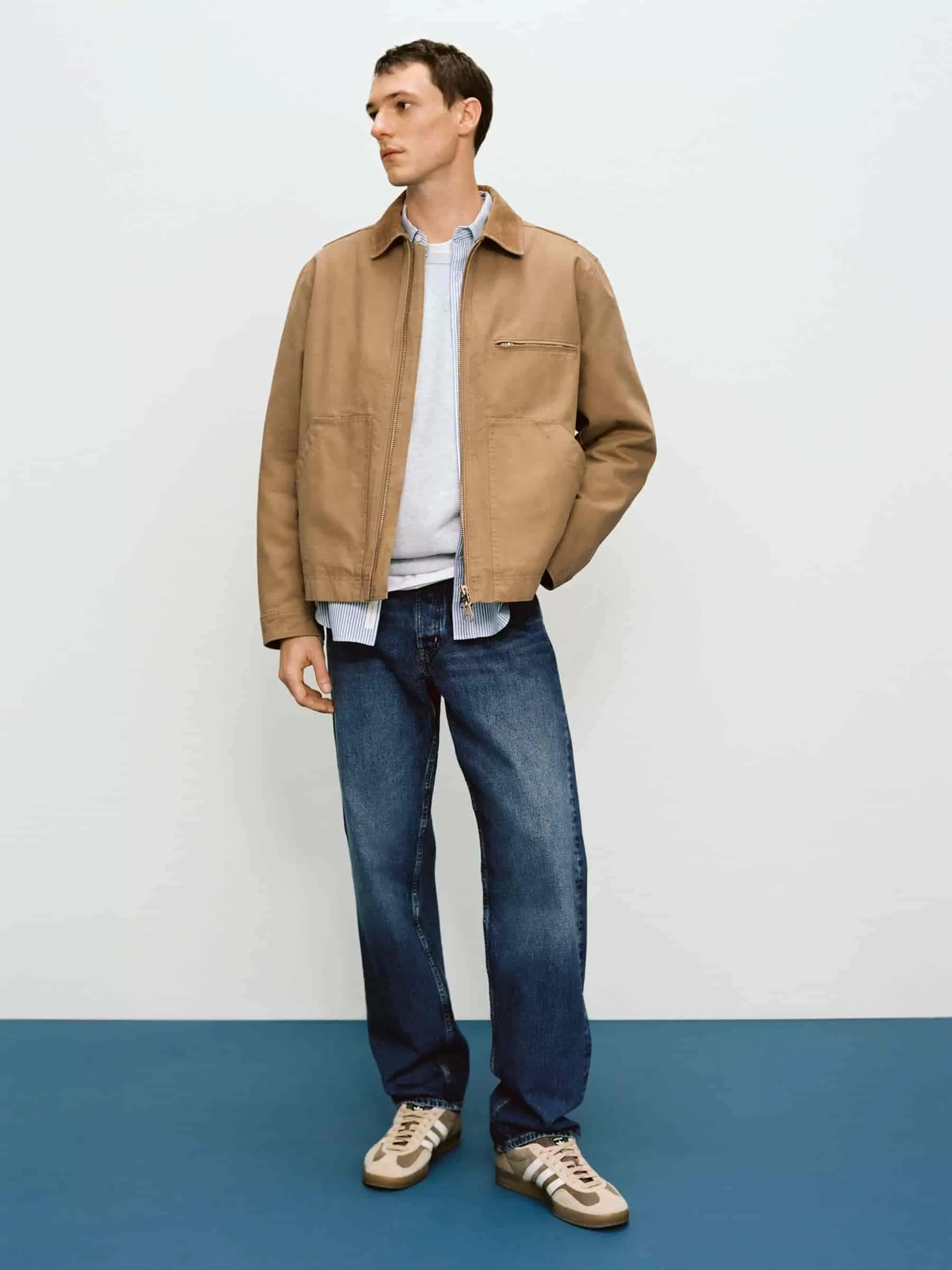 Jacke im Workwear-Stil aus Baumwoll-Canvas mit Kragen aus Cord. Mit Reißverschluss und geknöpften Manschetten. Detailliert mit einer einzelnen Paspeltasche mit Reißverschluss auf der Brust, schrägen Taschen vorne und einer Innentasche. Normale Passform.