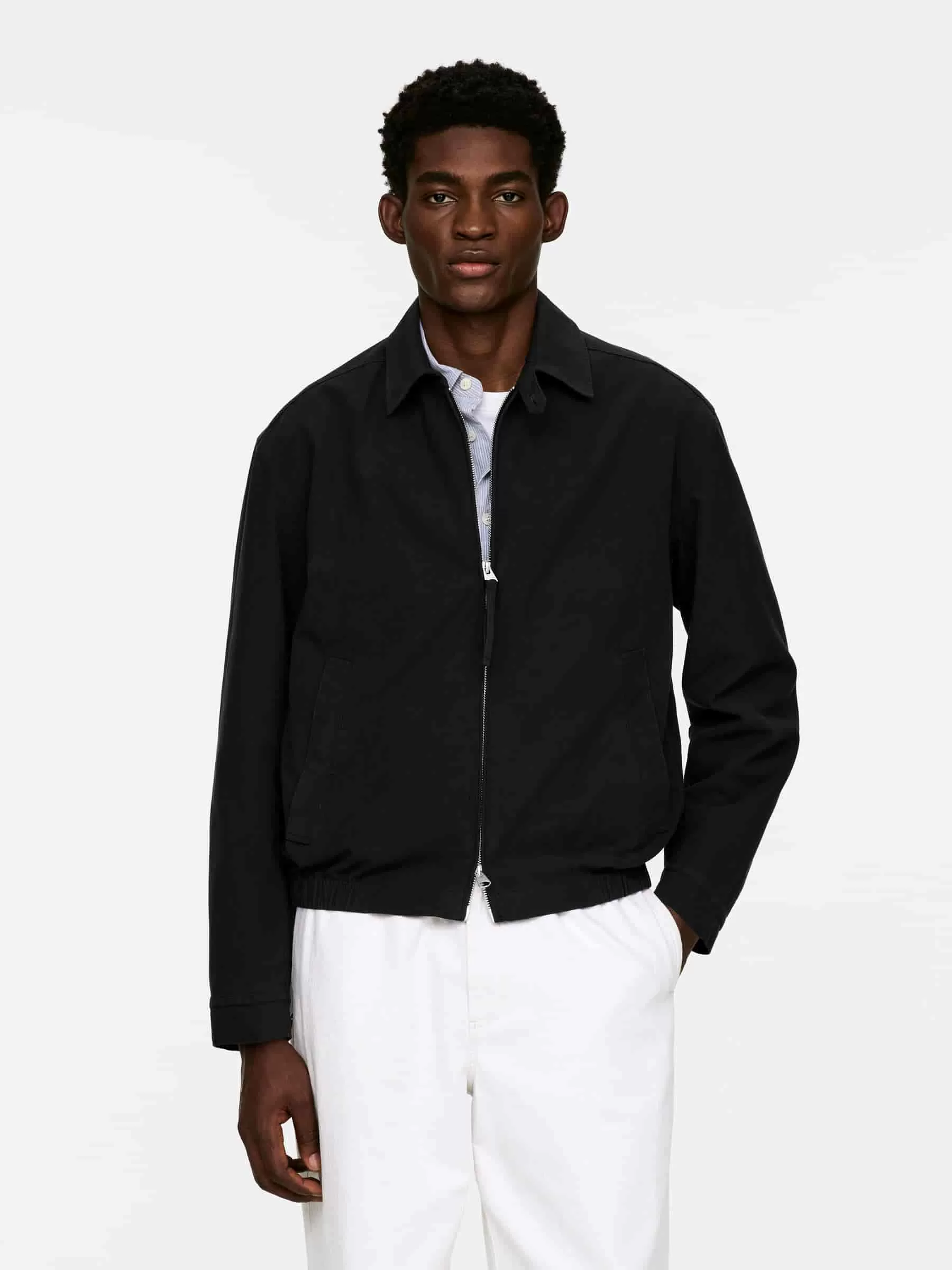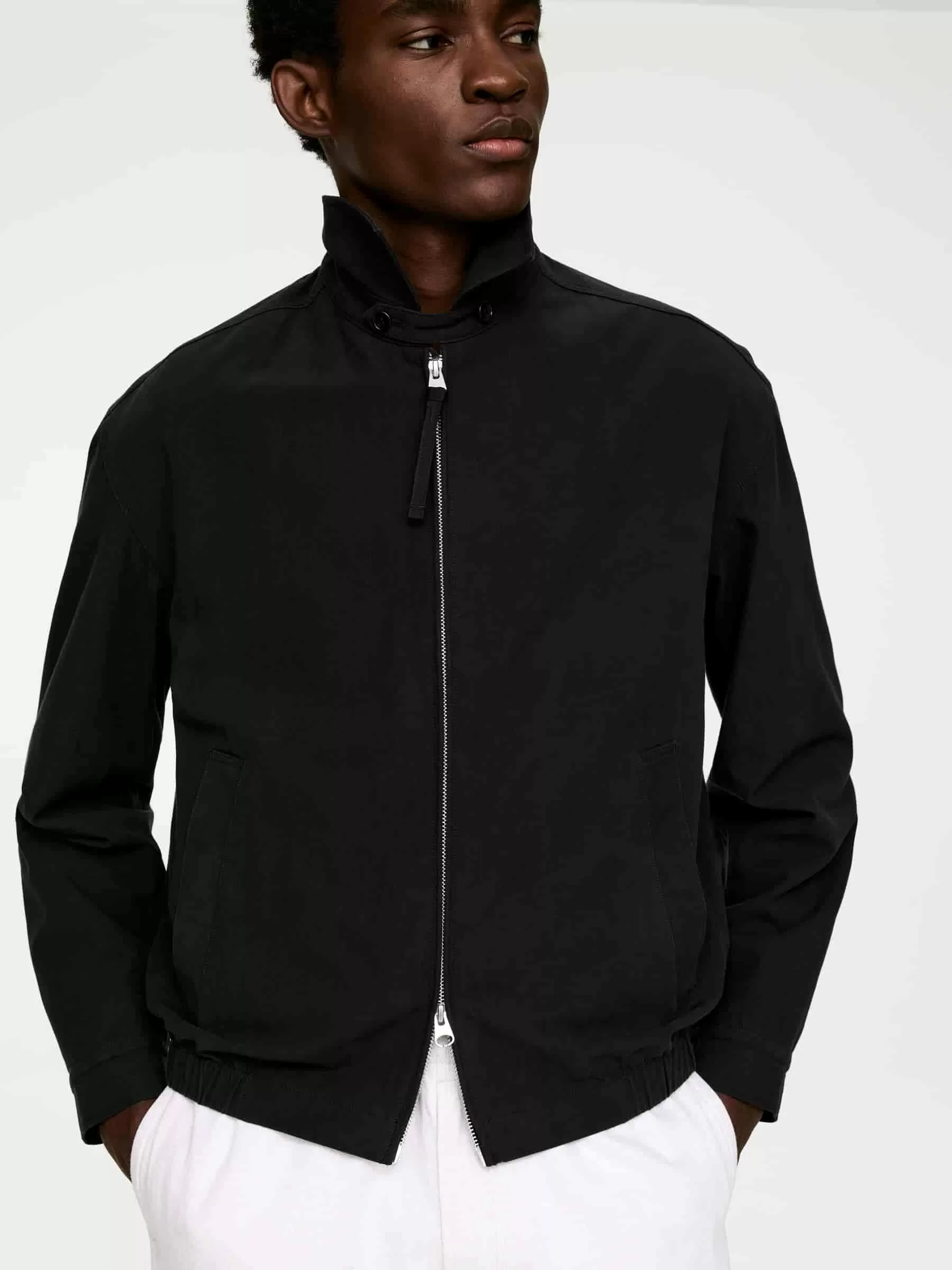 Blouson aus Baumwolltwill. Schnitt für normale Passform mit Gummizug am unteren Saum. Die Jacke hat einen regulären Kragen, einen Zwei-Wege-Reißverschluss vorne und schräge Leistentaschen mit verdeckten Druckknöpfen. Geknöpfte Manschetten. Zwei Innentaschen. Komplett gefüttert.