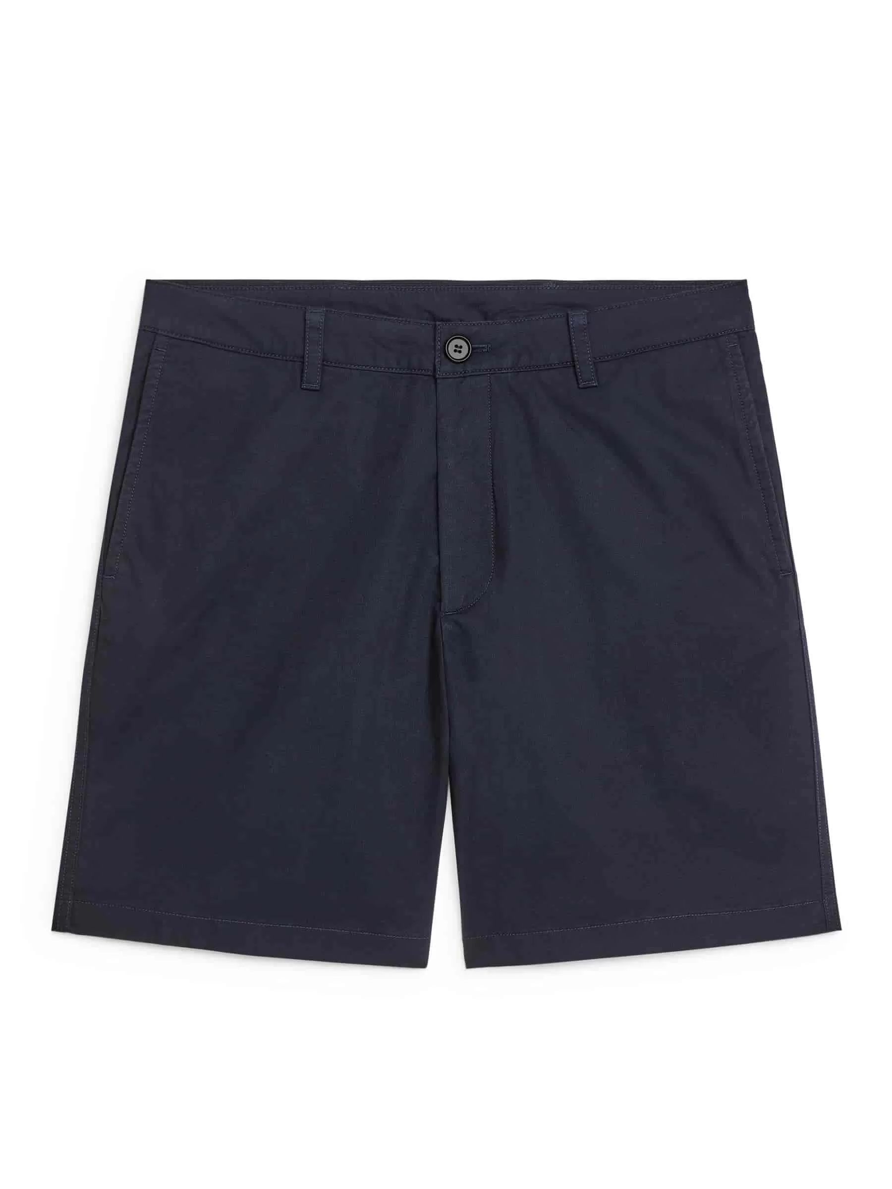 Baumwollshorts im Chino-Stil, die bis zur Mitte des Oberschenkels reichen. Ein leicht taillierter, aber lässiger Style mit schrägen Seitentaschen und zwei Leistentaschen hinten. Münzfach in der rechten Vordertasche. Hosenschlitz mit Reißverschluss. Corozo-Knopf, hergestellt aus Tagua-Nüssen.