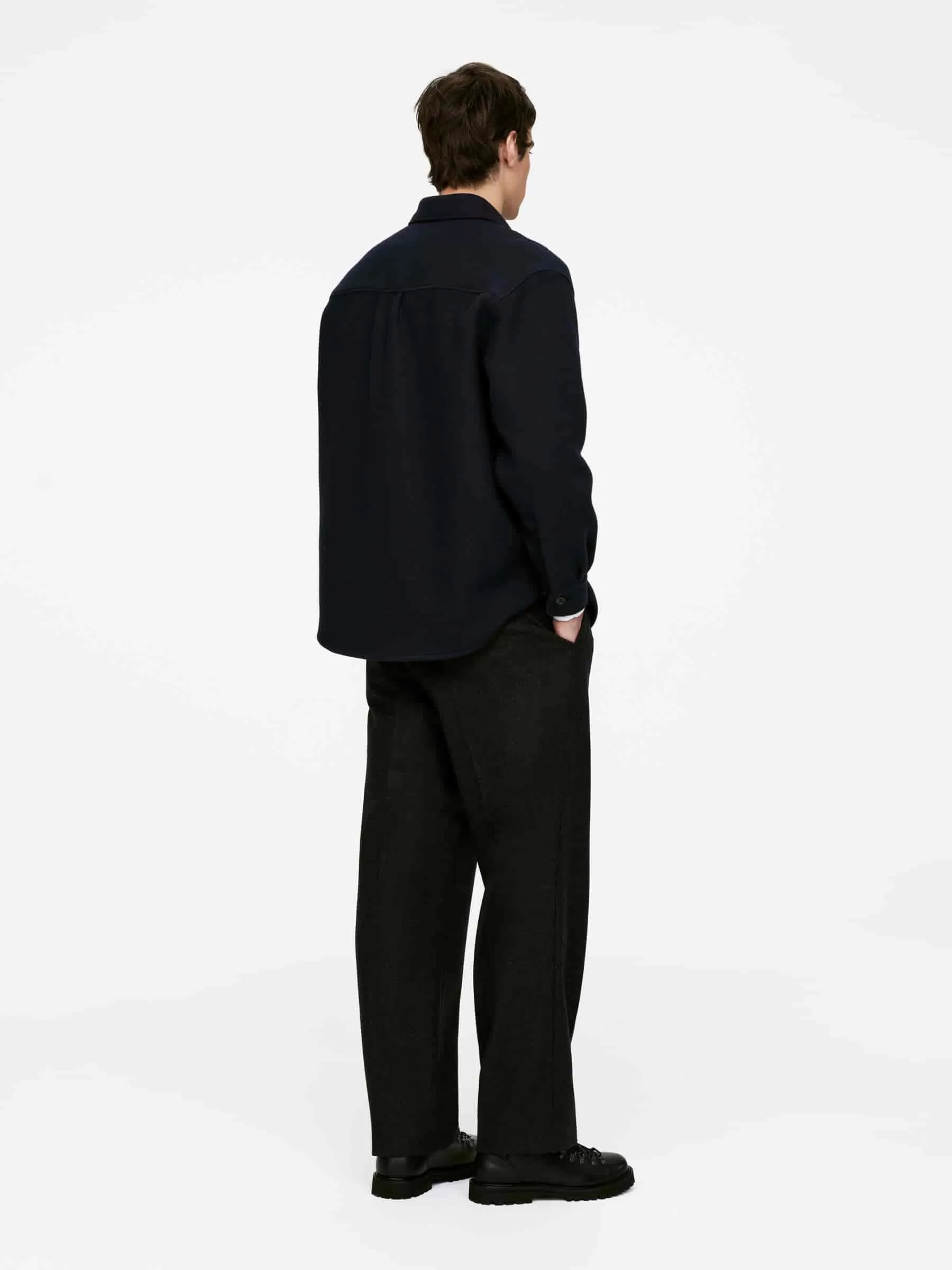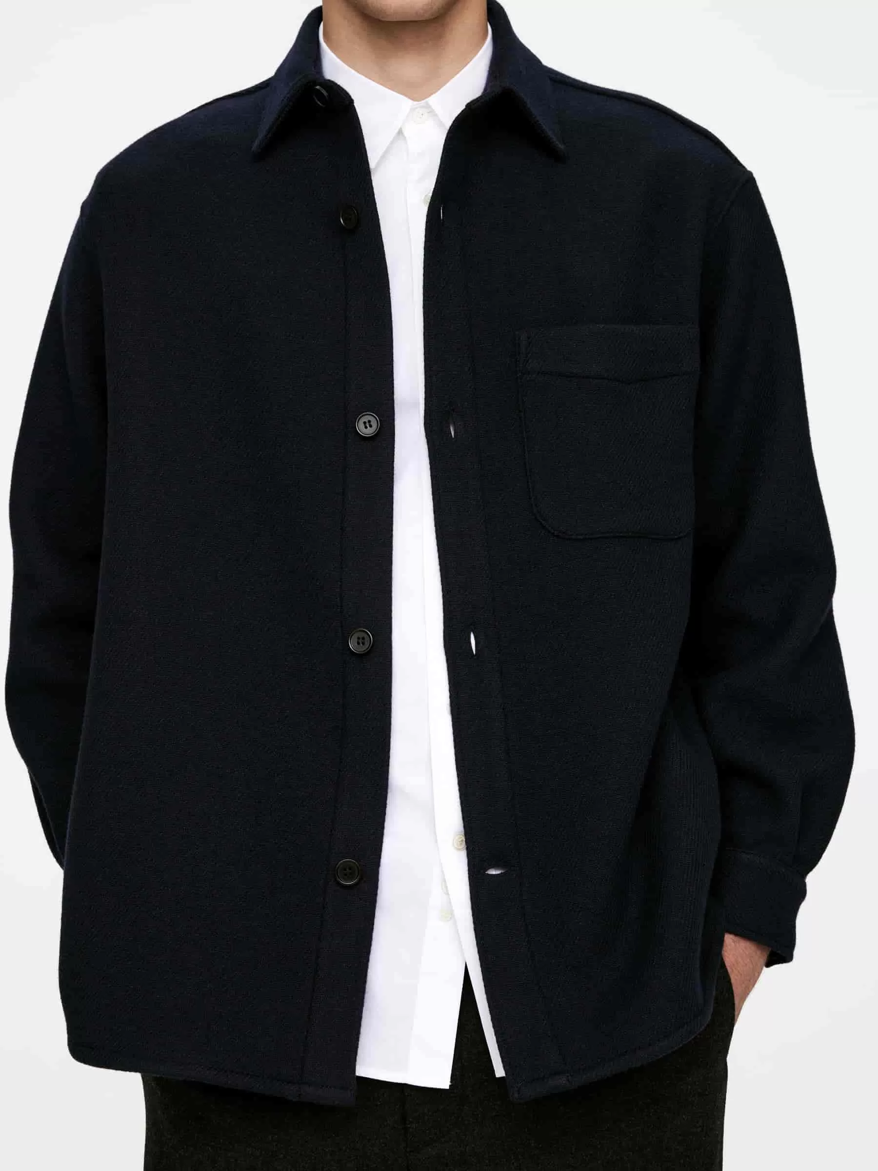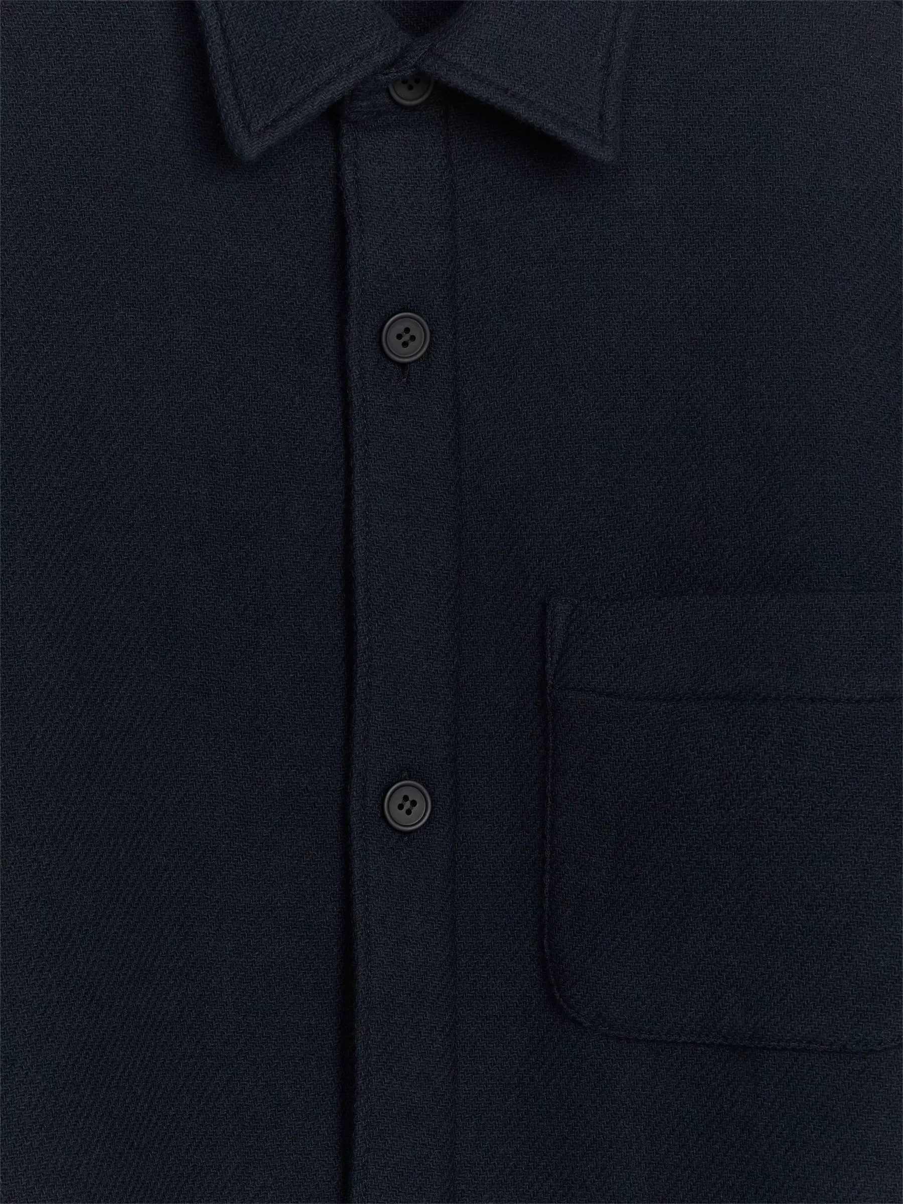 Hemd aus einer Wollmischung genäht. Ein locker sitzender Stil mit normalem Kragen, einer Knopfleiste vorne und einer einzelnen aufgesetzten Tasche auf der Brust. Rückenpasse mit Kellerfalte darunter. Geknöpfte Manschetten. Geschwungener Saum.
