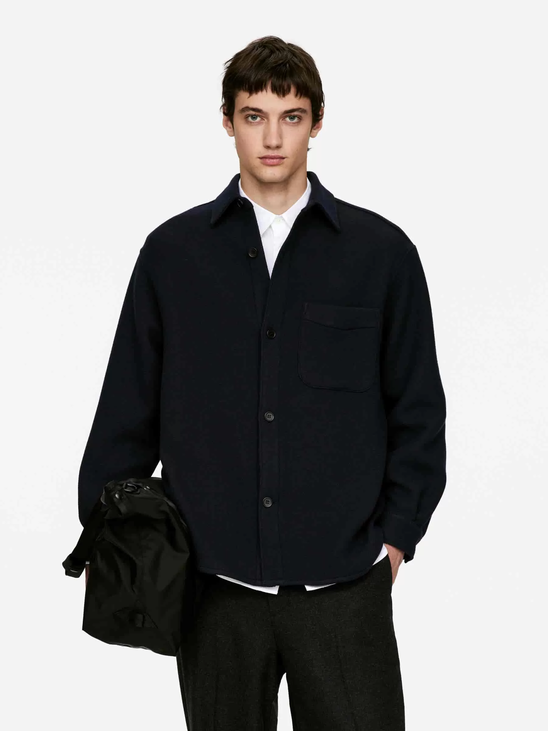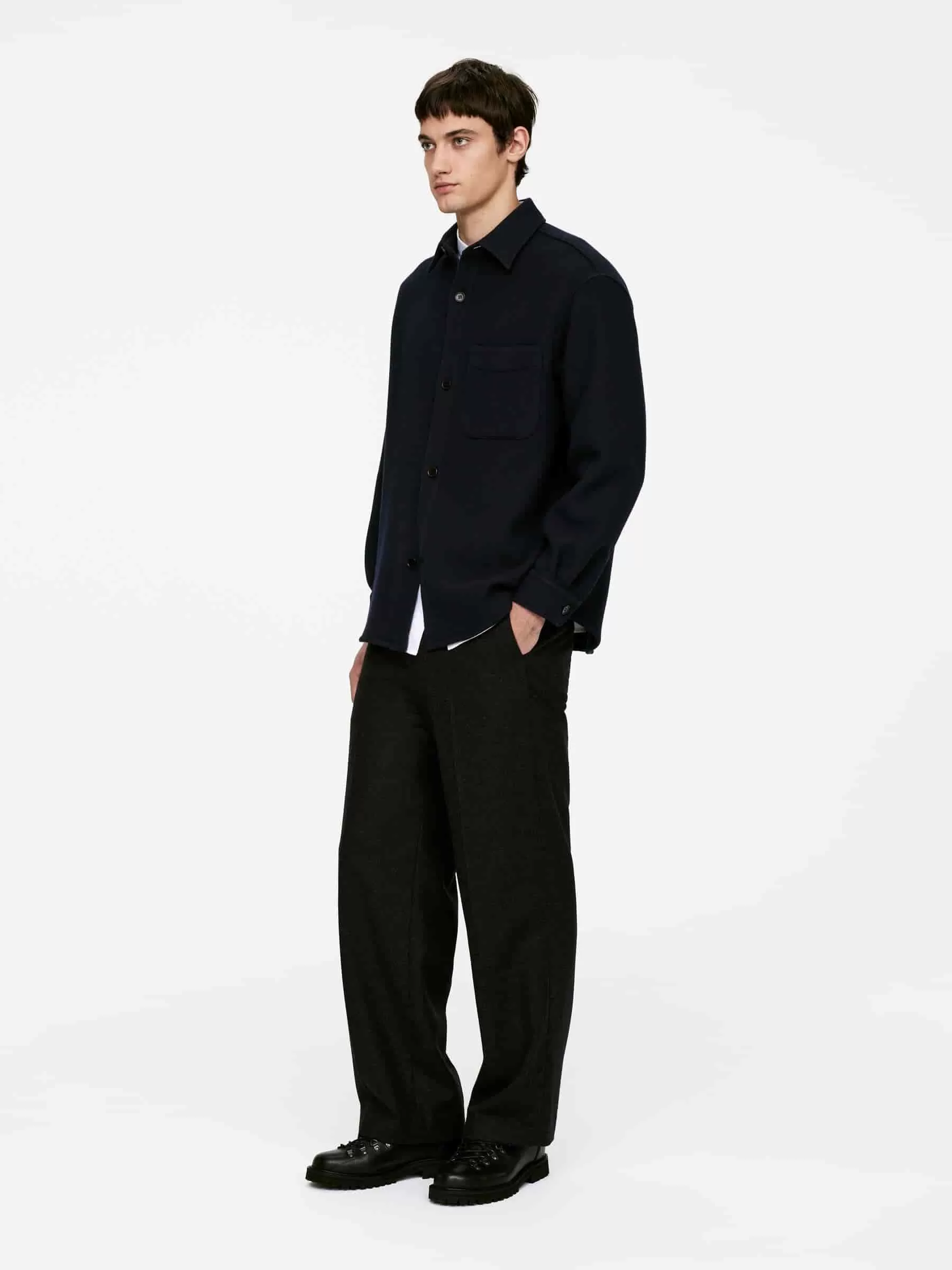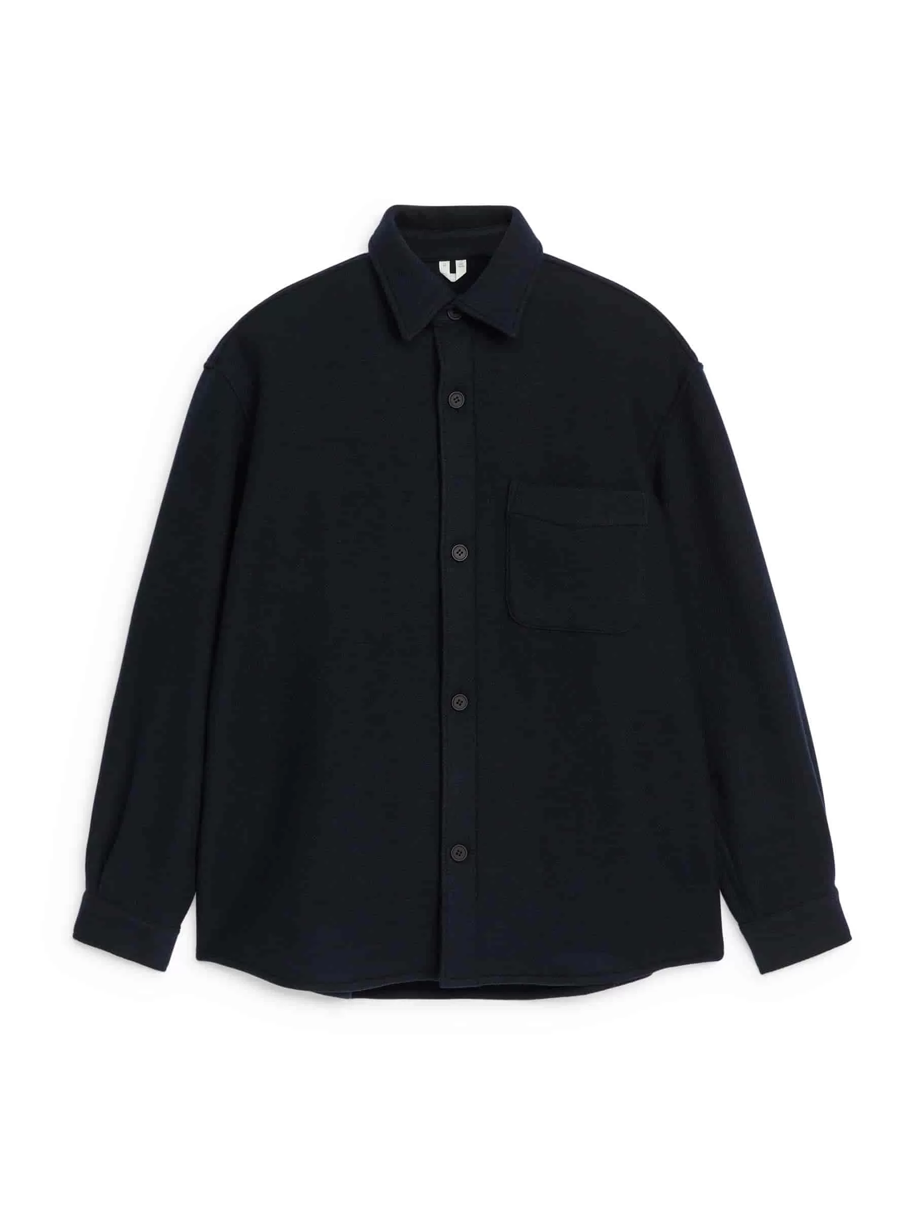 Hemd aus einer Wollmischung genäht. Ein locker sitzender Stil mit normalem Kragen, einer Knopfleiste vorne und einer einzelnen aufgesetzten Tasche auf der Brust. Rückenpasse mit Kellerfalte darunter. Geknöpfte Manschetten. Geschwungener Saum.