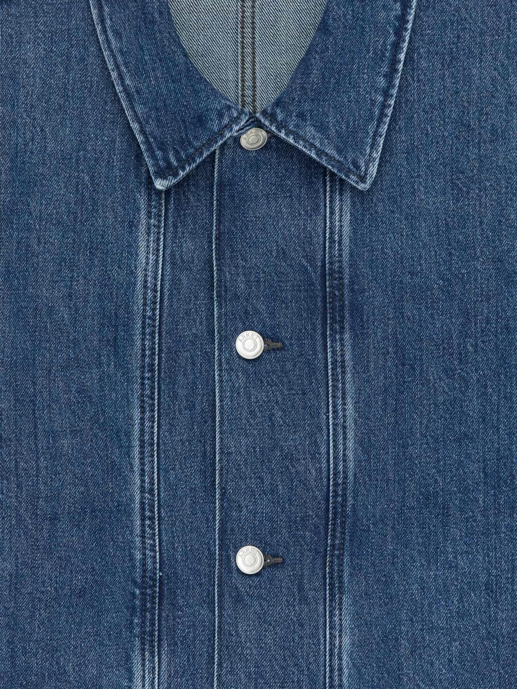 Gerade geschnittenes Jeans-Overshirt mit normalem Kragen, Knopfleiste vorne und zwei großen aufgesetzten Taschen. Kleine aufgesetzte Tasche innen.