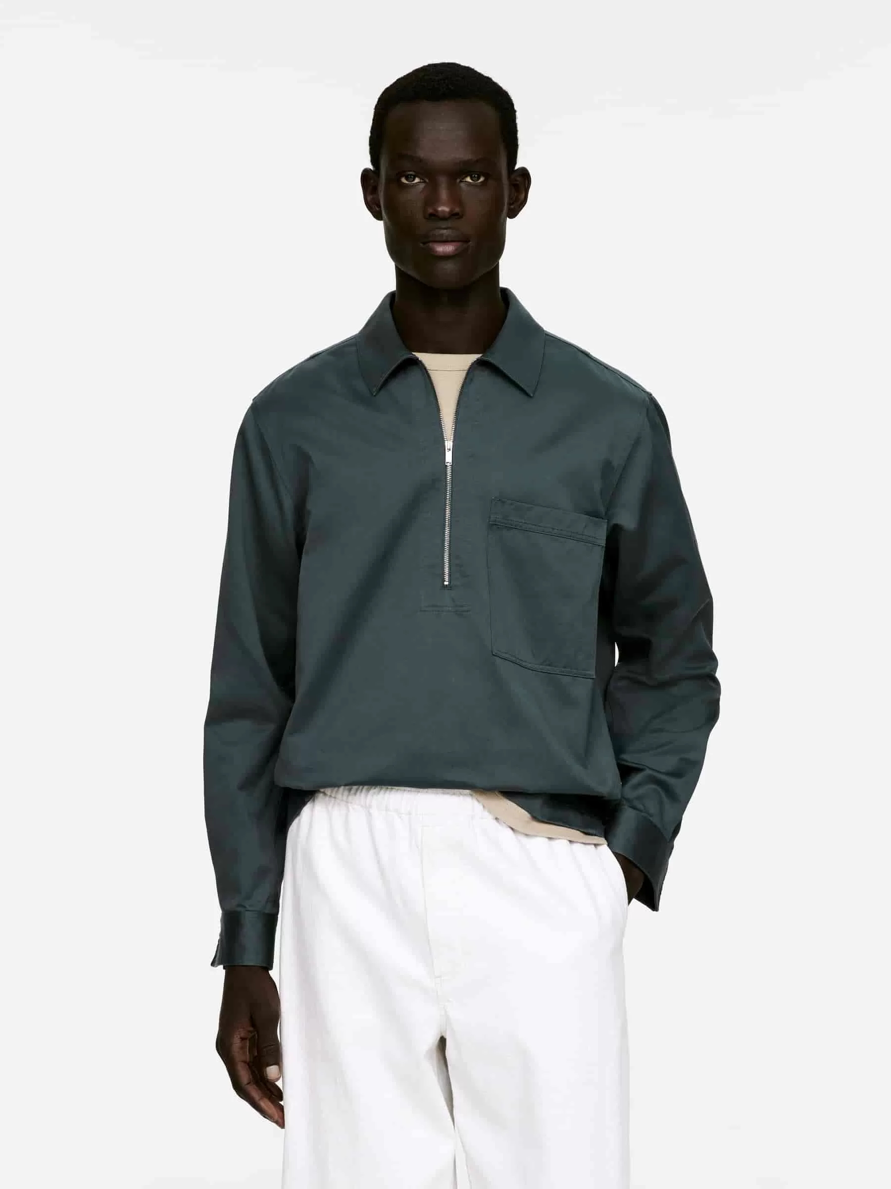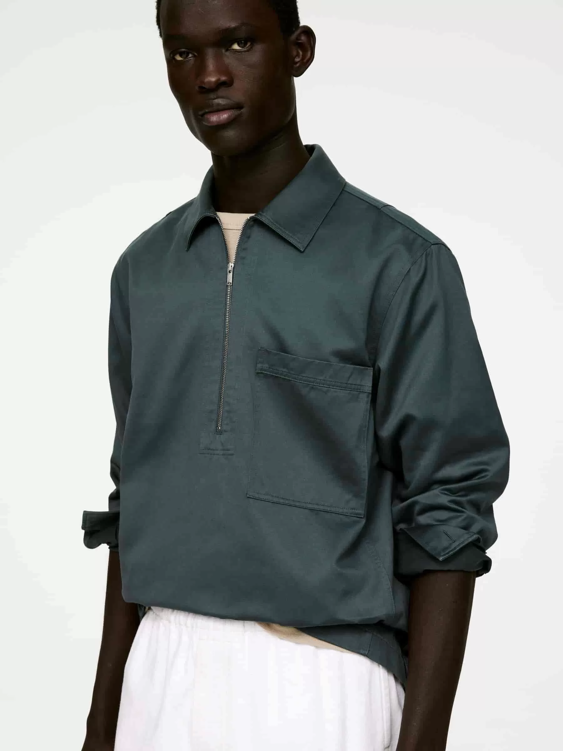 Pop-Over-Hemd aus einer Baumwoll-Leinen-Mischung. Ein locker sitzender Stil mit Kragen und halber Reißverschlussöffnung. Eine einzelne aufgesetzte Tasche auf der Brust. Rückenpasse mit Steppnähten. Geknöpfte Manschetten.