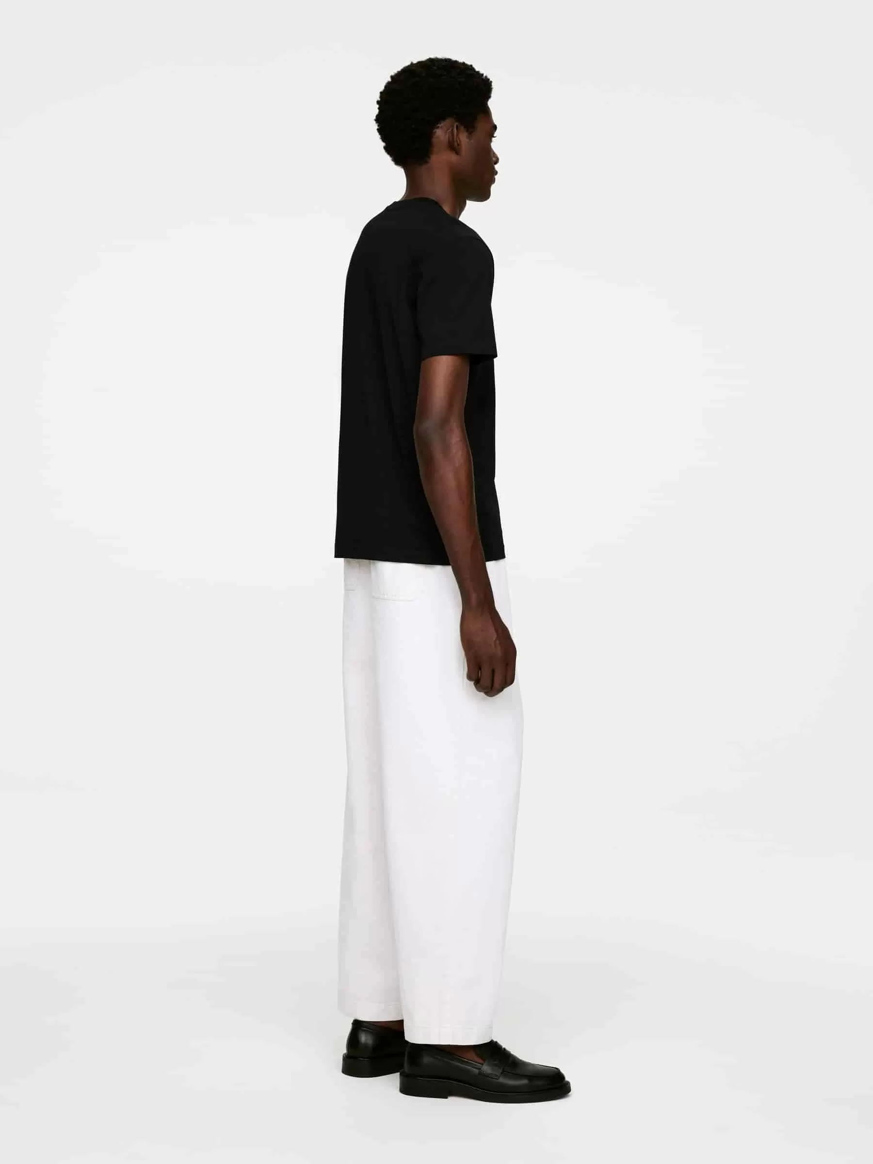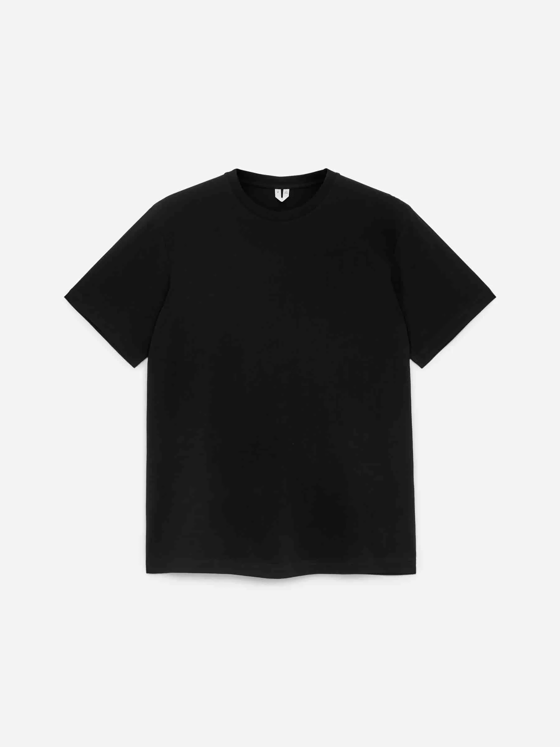 Klassischer T-Shirt-Schnitt mit Rundhalsausschnitt für eine normale Passform. Es besteht aus 170 GSM Single Jersey, was darauf hinweist, dass es das leichteste der Standard-T-Shirts von ARKET ist.