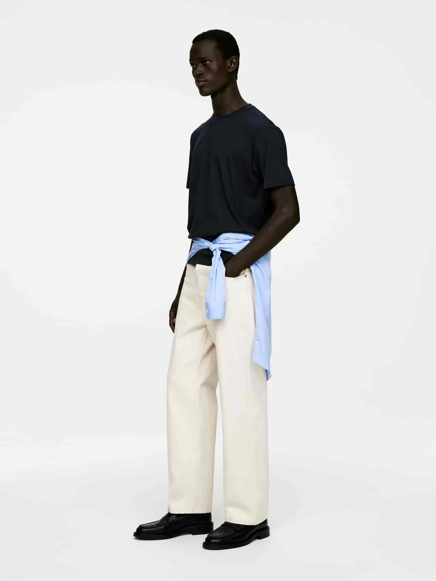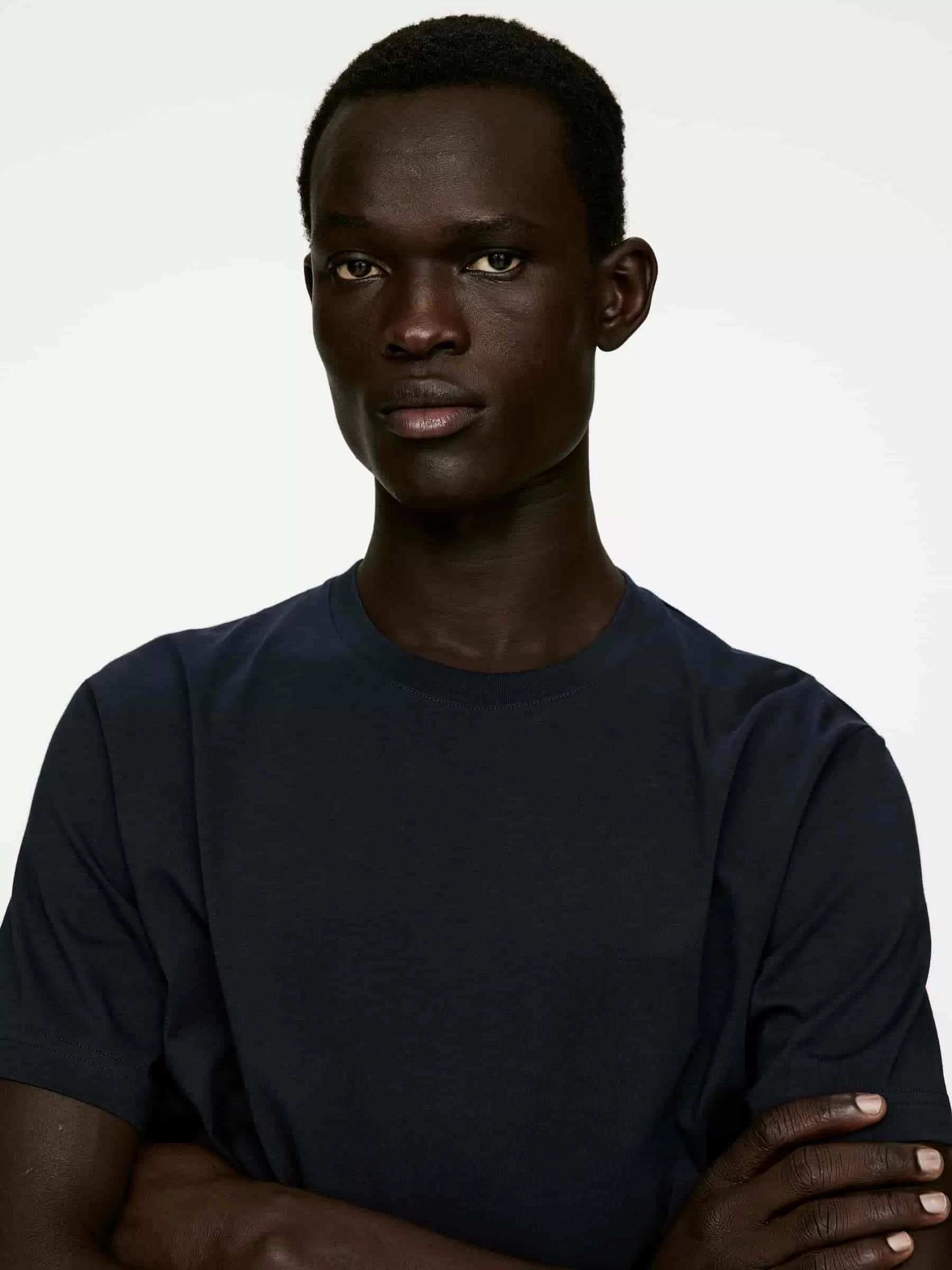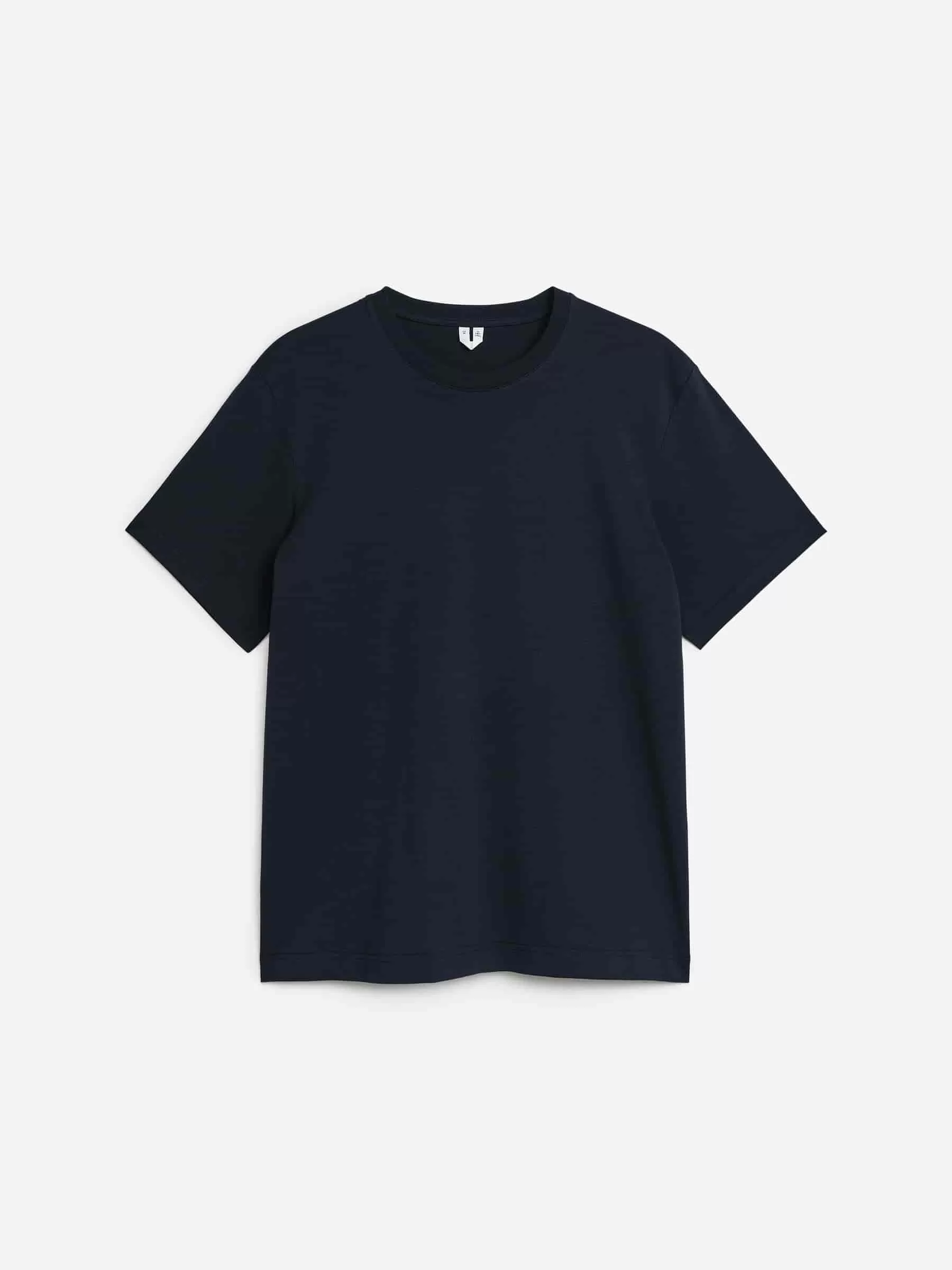 Klassischer T-Shirt-Schnitt mit Rundhalsausschnitt für eine normale Passform. Es besteht aus 170 GSM Single Jersey, was darauf hinweist, dass es das leichteste der Standard-T-Shirts von ARKET ist.