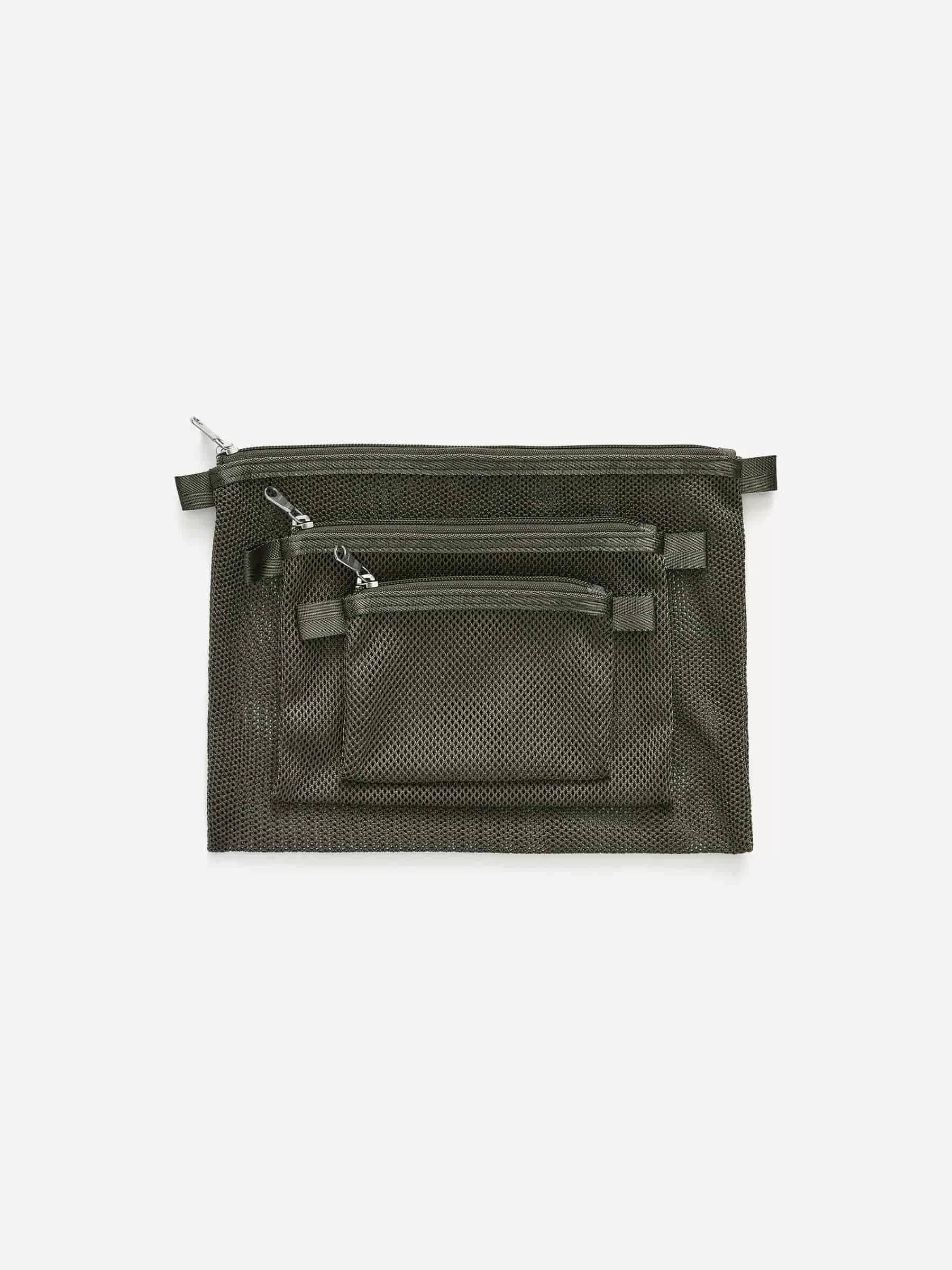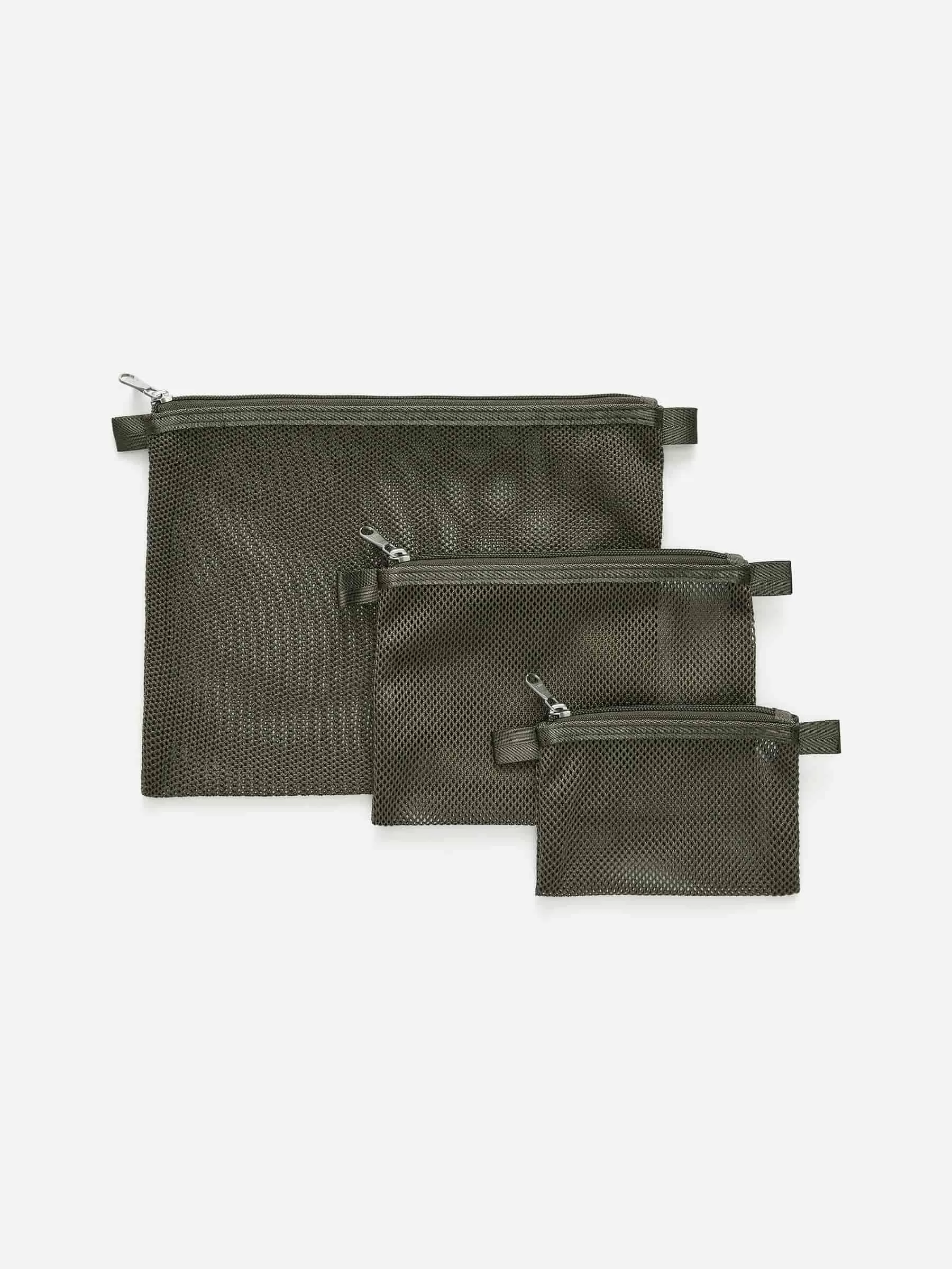 Ein Set aus drei leichten Reißverschlusstaschen zum einfachen Verpacken und Organisieren von Reiseutensilien. Strapazierfähiges, durchsichtiges Netzgewebe aus recyceltem Polyester. Ideal sowohl für Reisen als auch für den täglichen Gebrauch. Größe 15,5 x 10,5 cm (klein), 22 x 15,5 cm (mittel), 31 x 22 cm (groß).