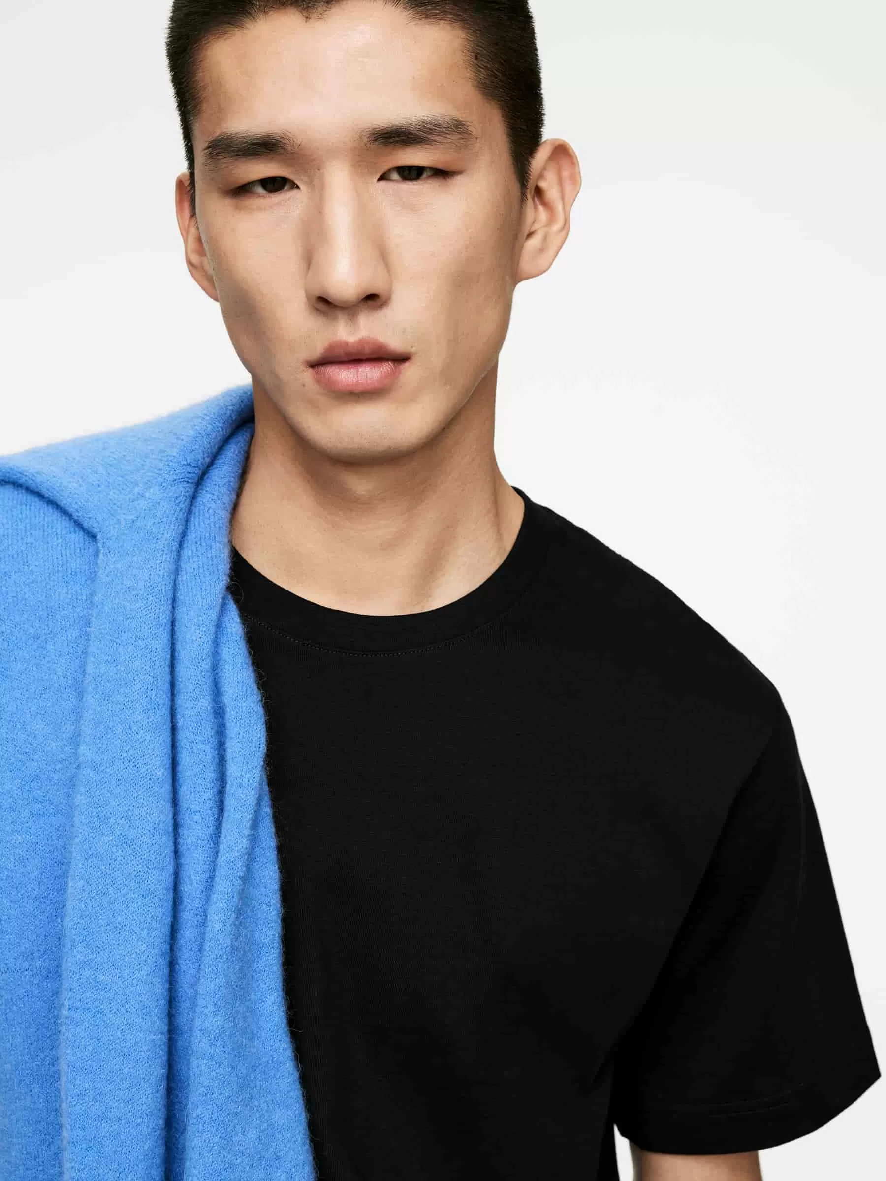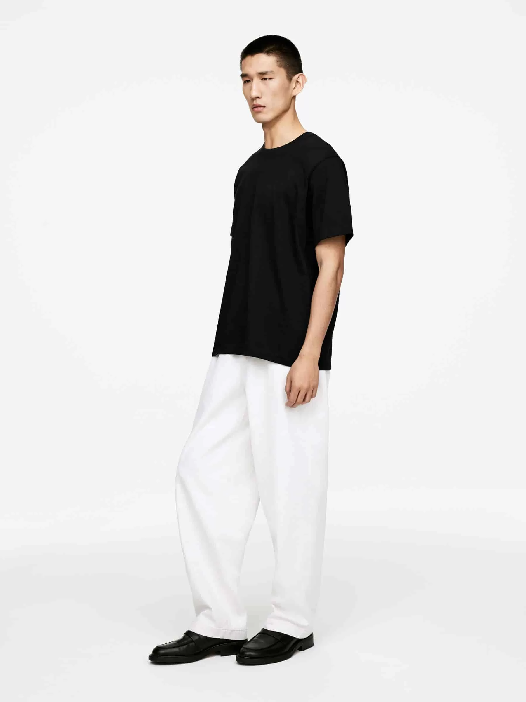 Klassischer T-Shirt-Schnitt mit Rundhalsausschnitt für eine normale Passform. Es besteht aus 220 GSM Single Jersey, was darauf hinweist, dass es sich um die mittelschwere Version der Standard-T-Shirts von ARKET handelt.