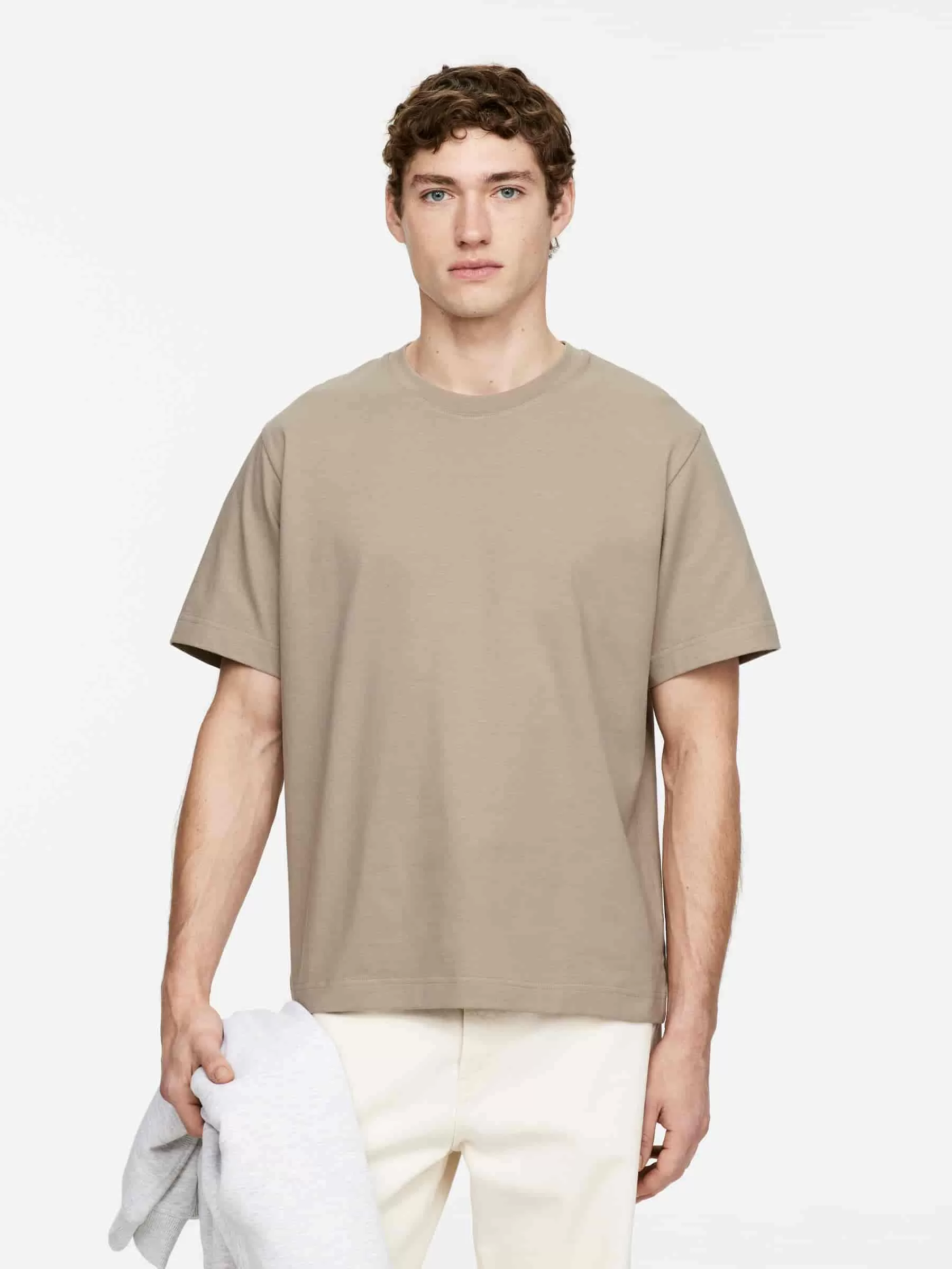 Klassischer T-Shirt-Schnitt mit Rundhalsausschnitt für eine normale Passform. Es besteht aus 220 GSM Single Jersey, was darauf hinweist, dass es sich um die mittelschwere Version der Standard-T-Shirts von ARKET handelt.