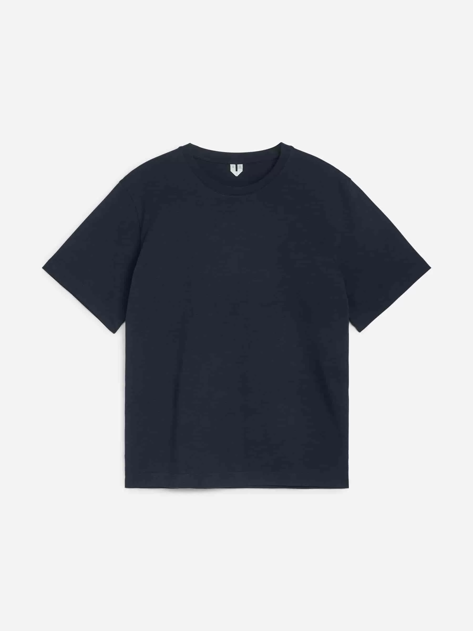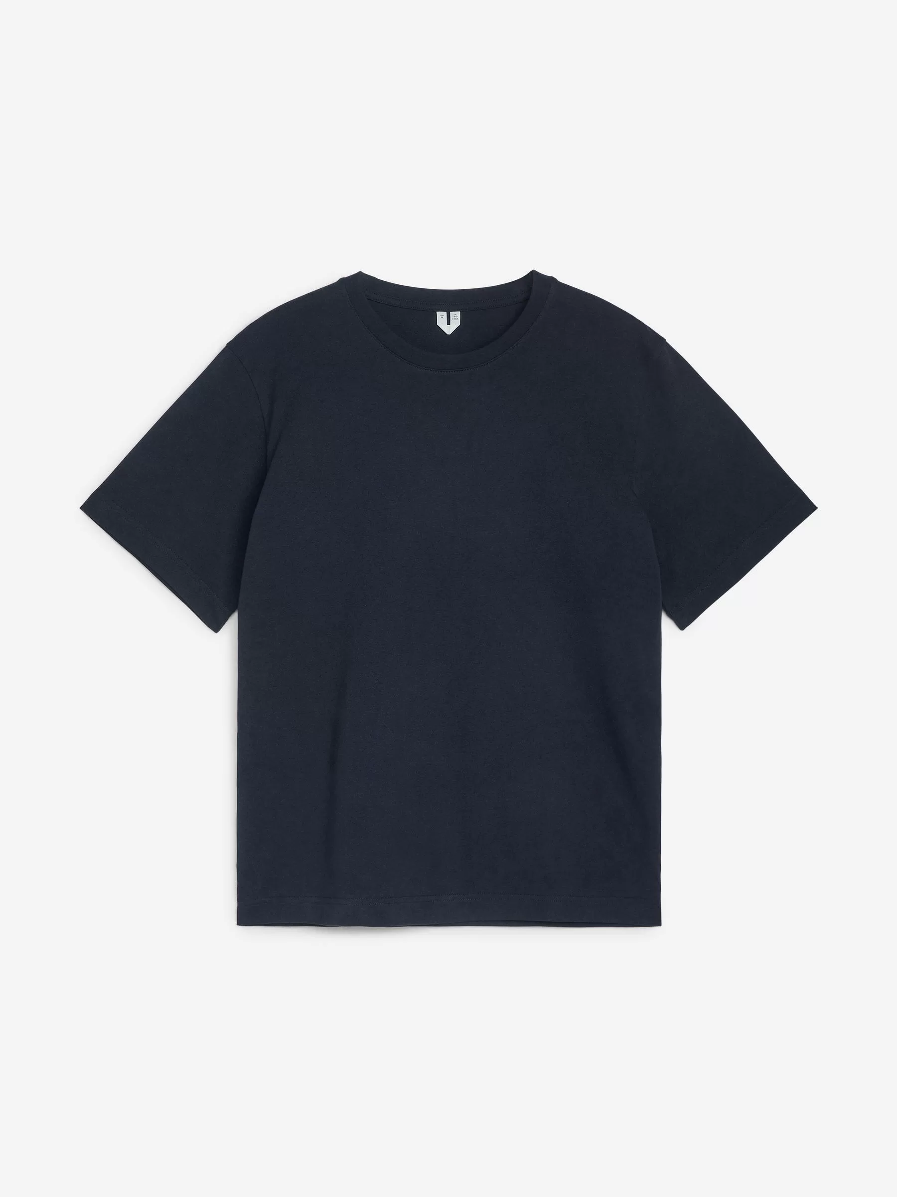 Klassischer T-Shirt-Schnitt mit Rundhalsausschnitt für eine normale Passform. Es besteht aus 220 GSM Single Jersey, was darauf hinweist, dass es sich um die mittelschwere Version der Standard-T-Shirts von ARKET handelt.