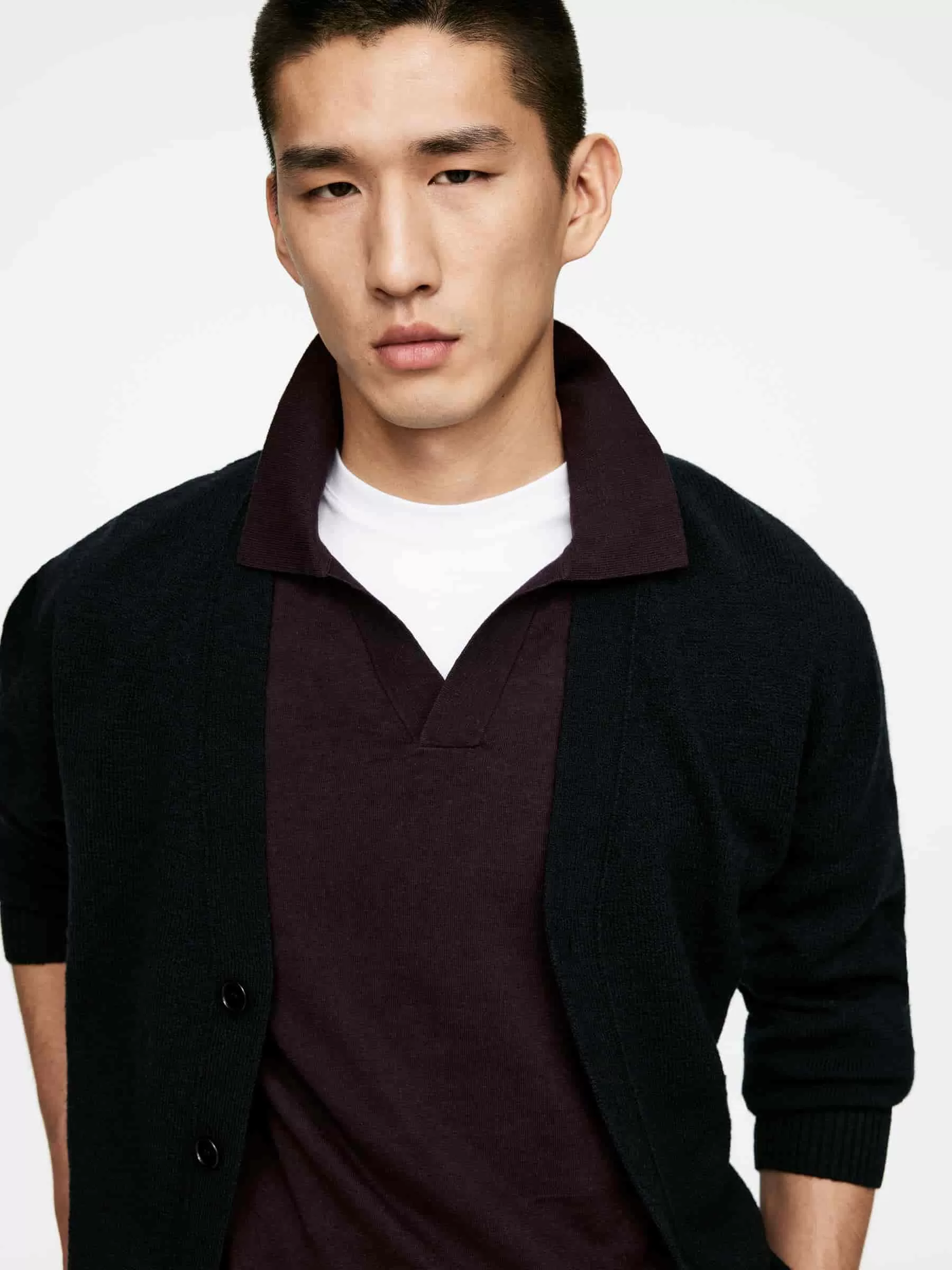 Die Mischung aus Leinen und Baumwolle verleiht diesem Feinstrick-Poloshirt einen weichen, kühlenden Tragekomfort. Ein lässiger Kurzarmstil mit Rippstrickkragen und V-Ausschnitt. Normale Passform.