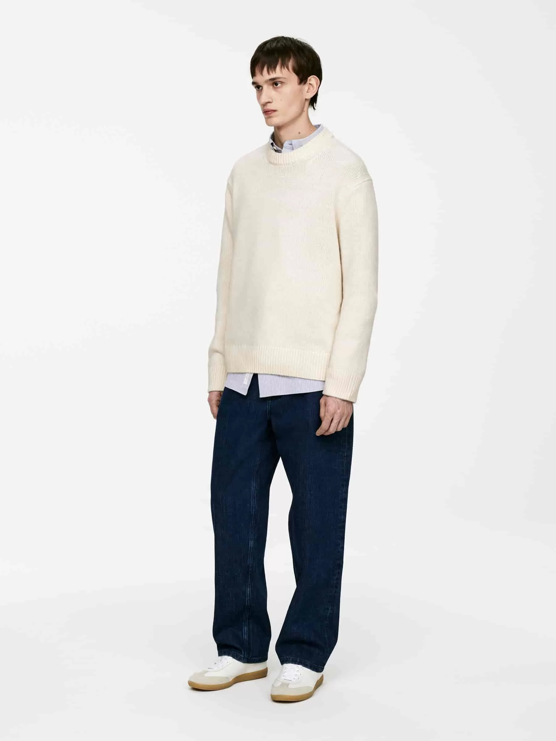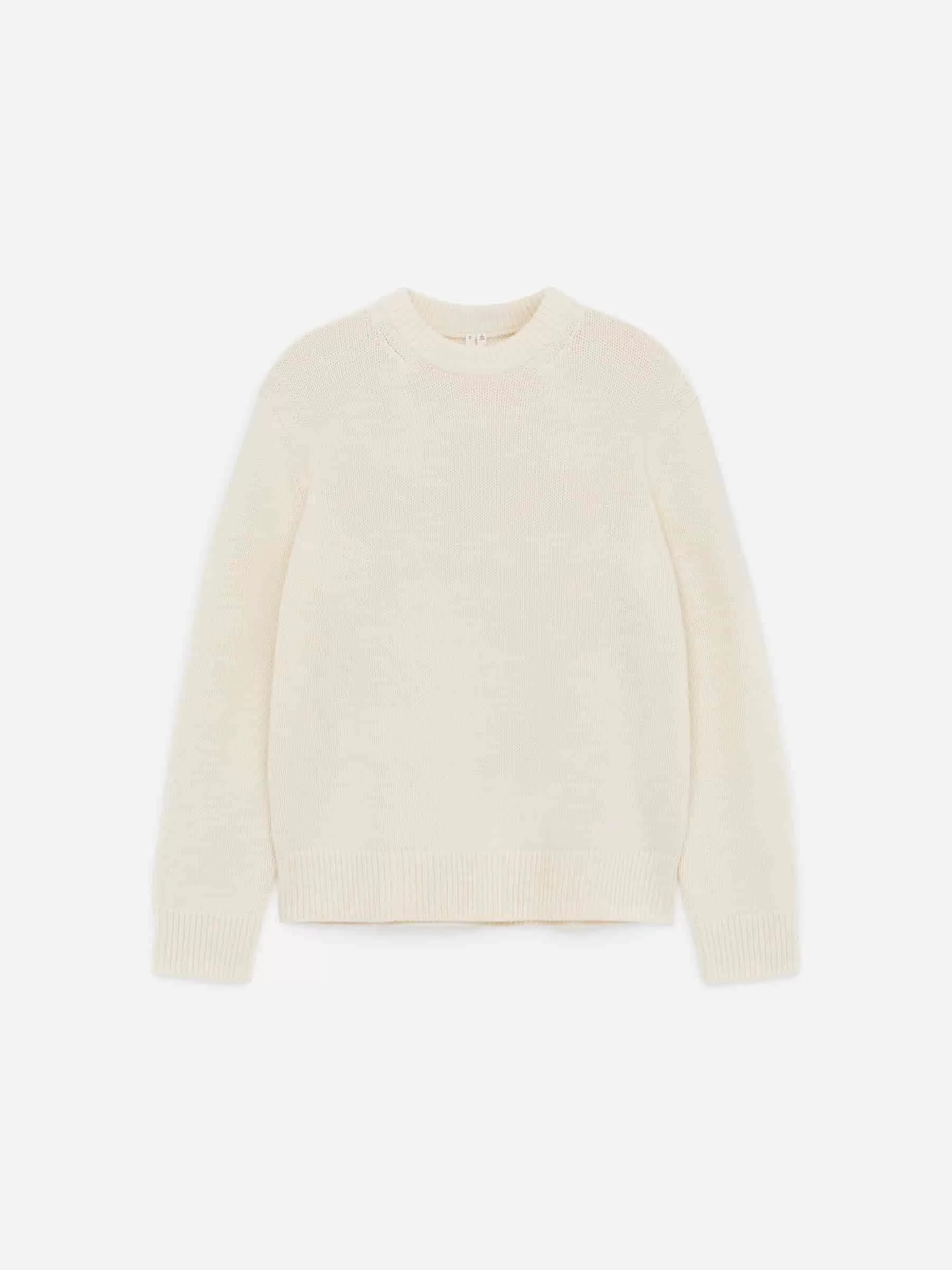 Klobiger Pullover aus Glattstrick mit übergroßer Passform und kastenförmiger Silhouette. Hergestellt aus weicher Wolle mit Nylonzusatz für ein leichtes Tragegefühl. Ein Rundhalsausschnitt mit Rippstrickbesätzen.