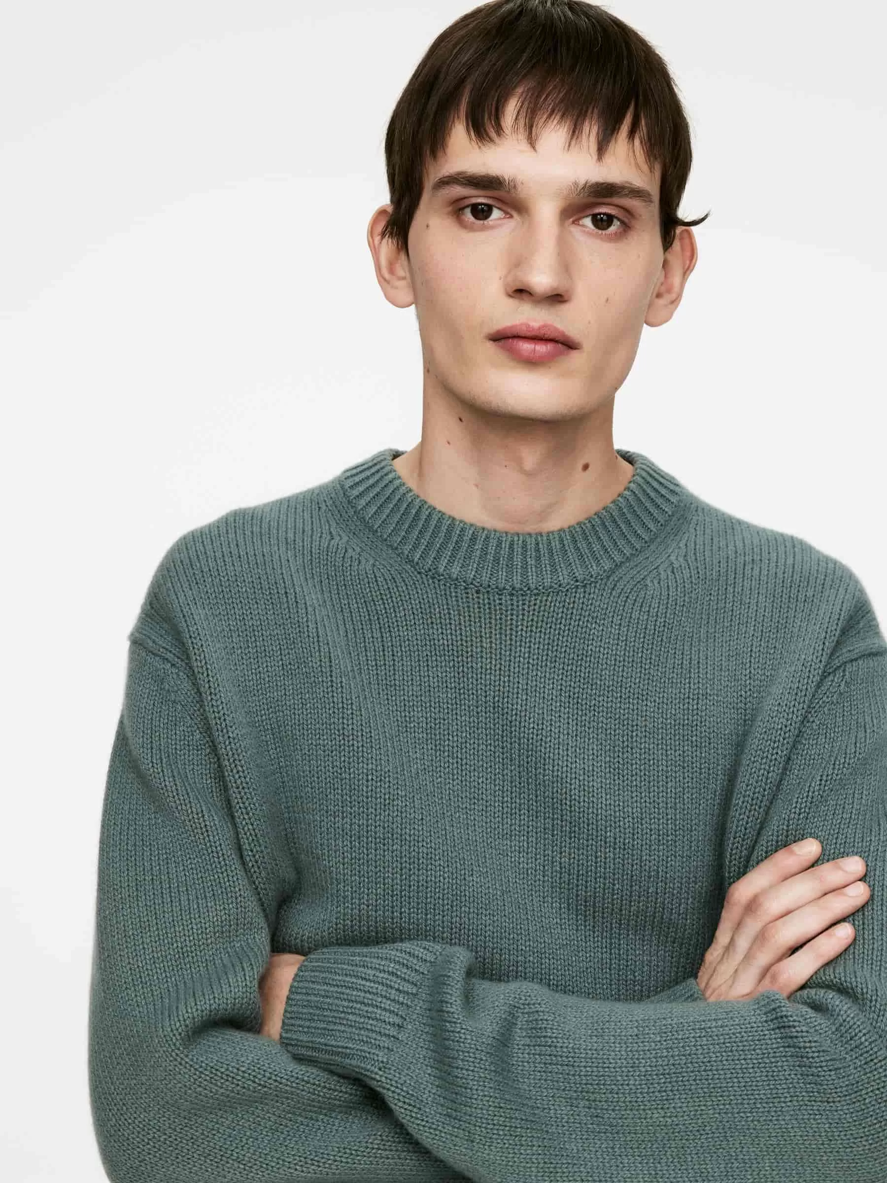 Klobiger Pullover aus Glattstrick mit übergroßer Passform und kastenförmiger Silhouette. Hergestellt aus weicher Wolle mit Nylonzusatz für ein leichtes Tragegefühl. Ein Rundhalsausschnitt mit Rippstrickbesätzen.