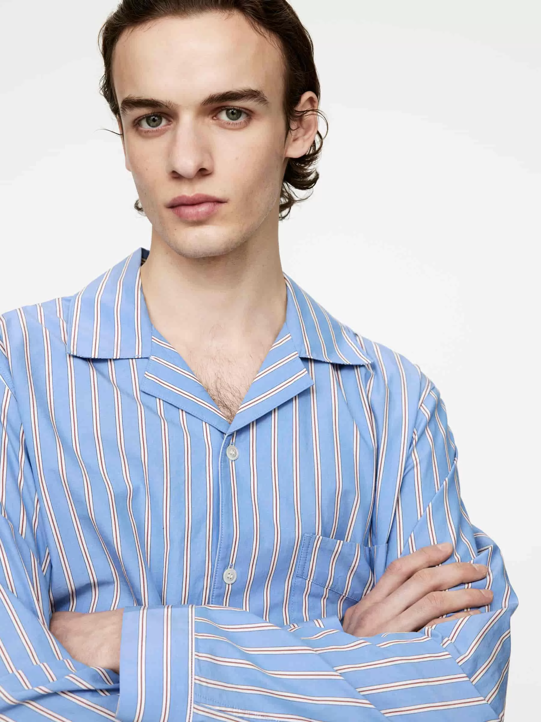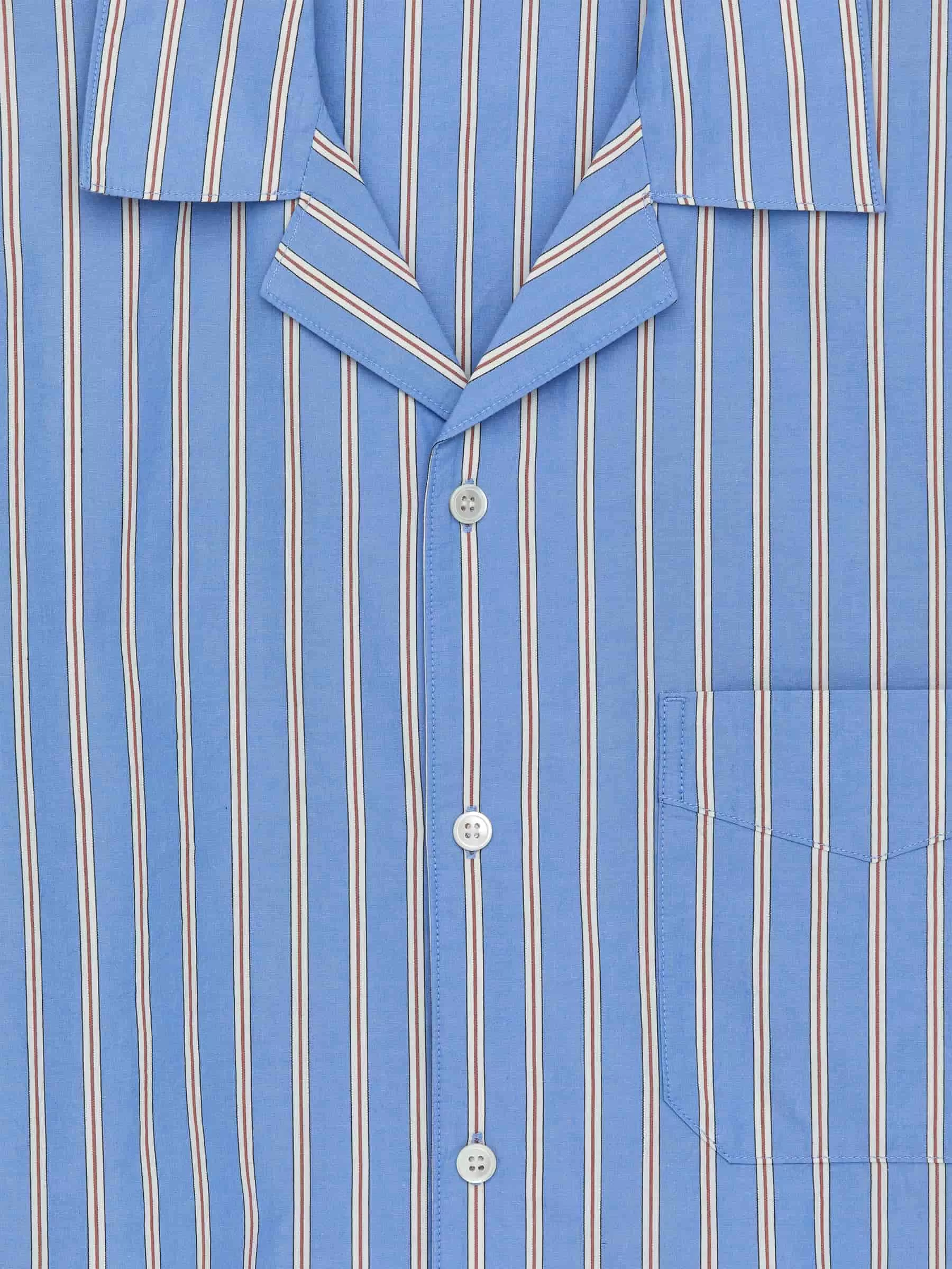 Pyjamahemd aus knackiger Baumwollpopeline. Ein gerade geschnittener Stil mit einer Brusttasche. Vordere Knopfleiste mit Perlmuttknöpfen, was bedeutet, dass dieses Produkt Details tierischen Ursprungs enthält.
