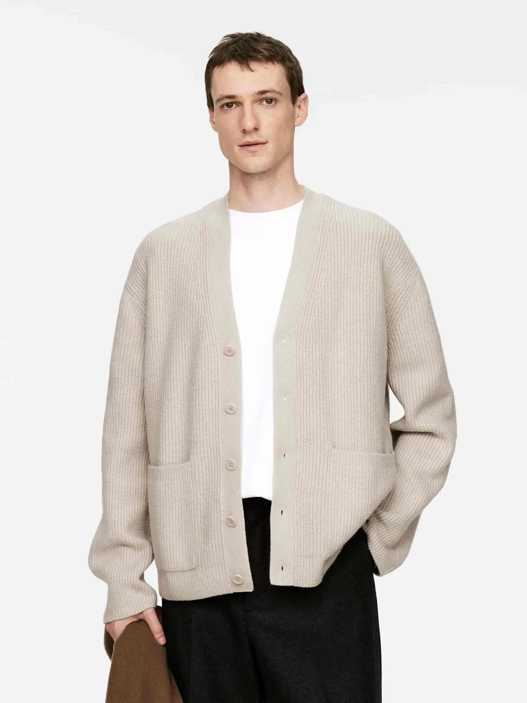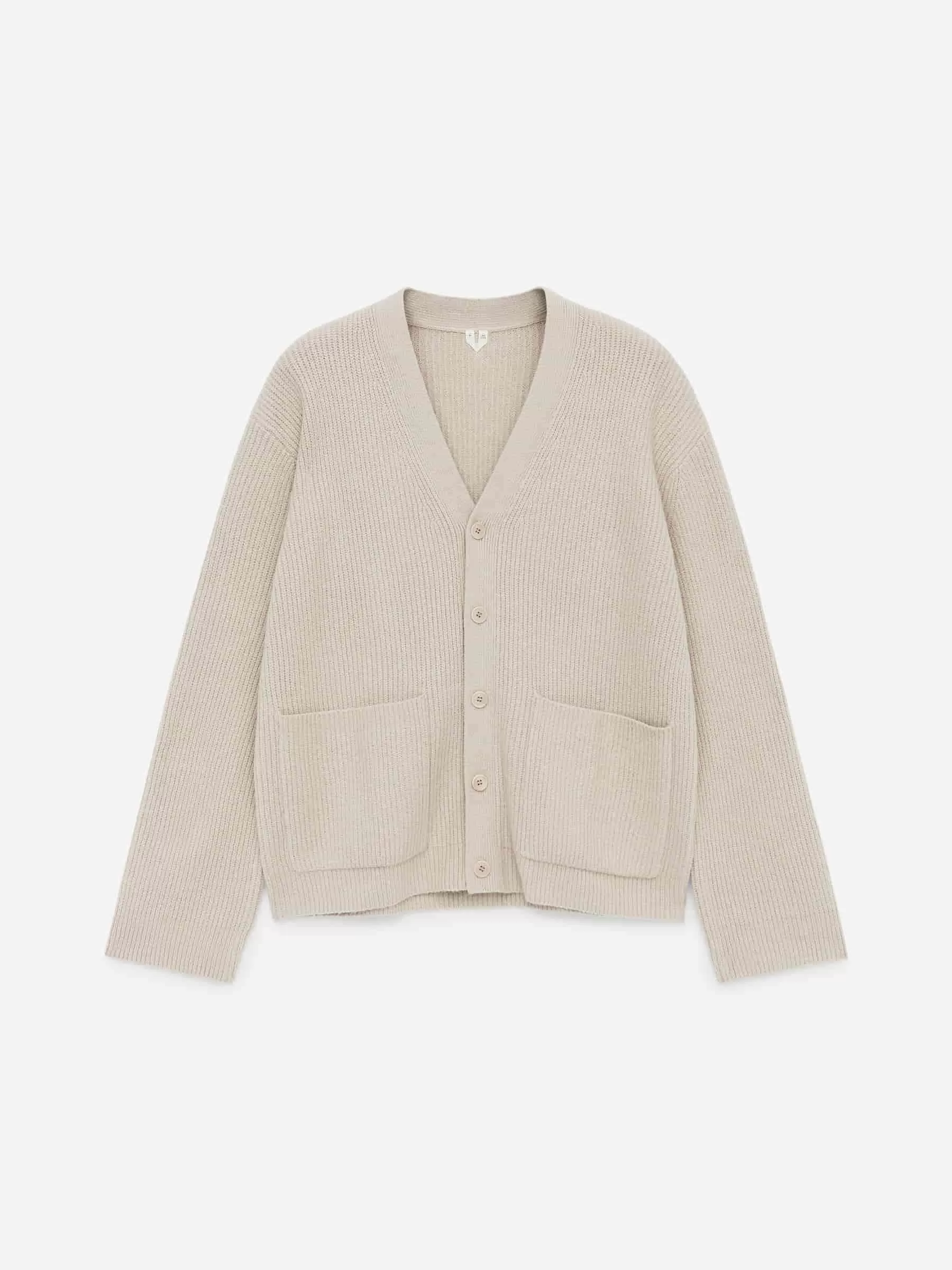 Strickjacke mit V-Ausschnitt aus einer Baumwollmischung. Dieser Stil hat eine gerade Passform mit überschnittenen Schultern. Detailliert mit zwei aufgesetzten Taschen vorne.