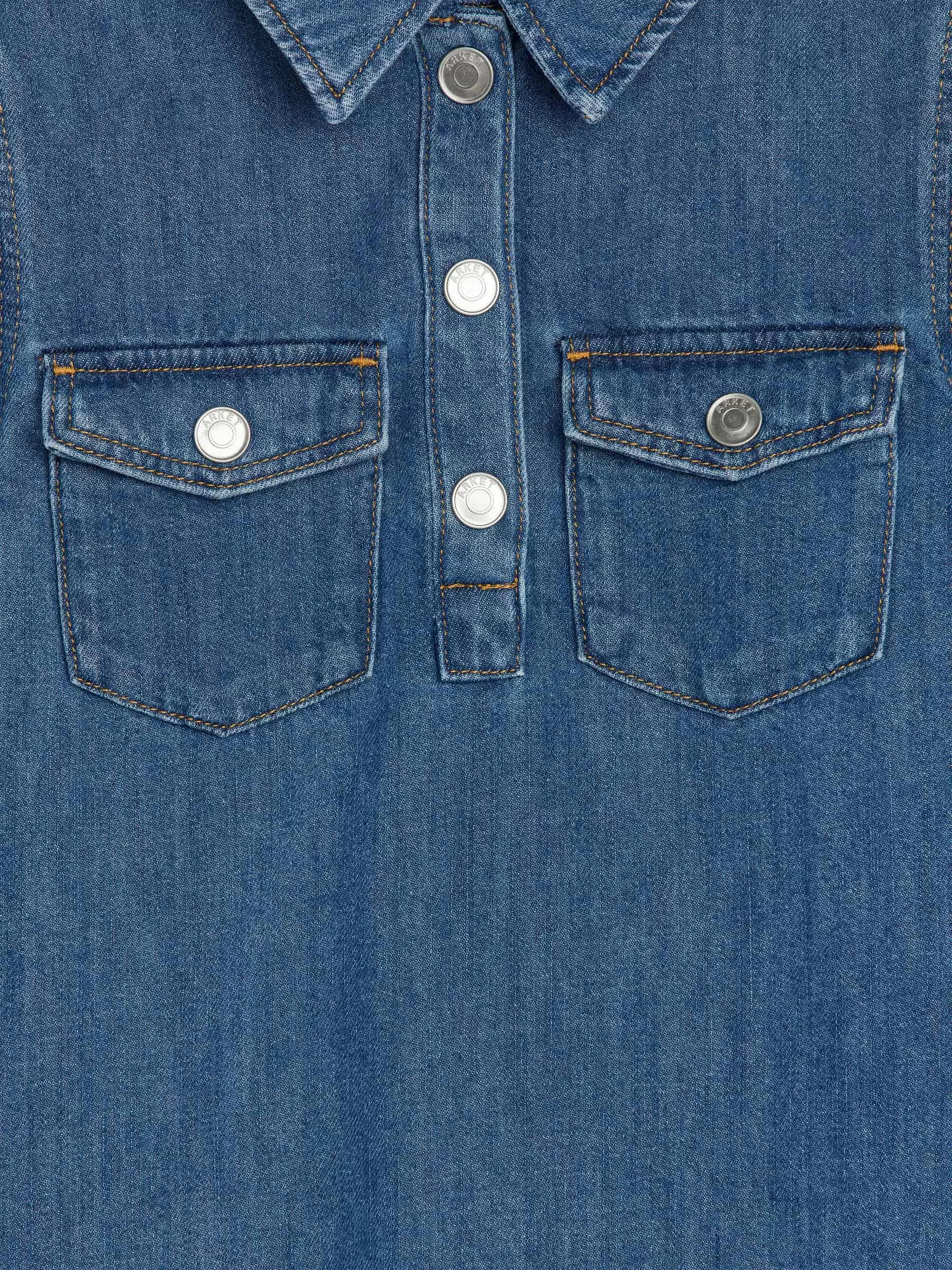 Langärmliges Jeanskleid aus einer Baumwollmischung. Hemdkragen und halbe Knopfleiste mit Druckknöpfen. Taschen mit Druckknöpfen vorne.