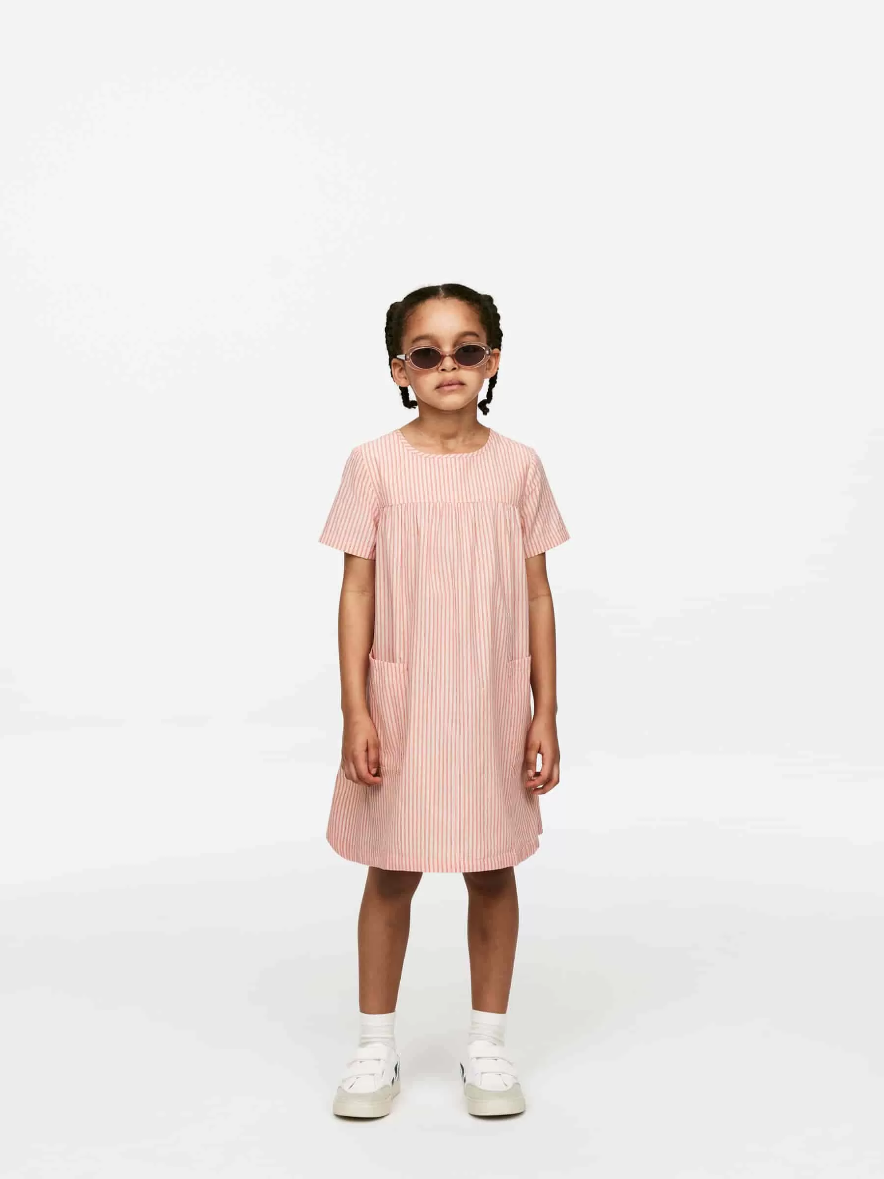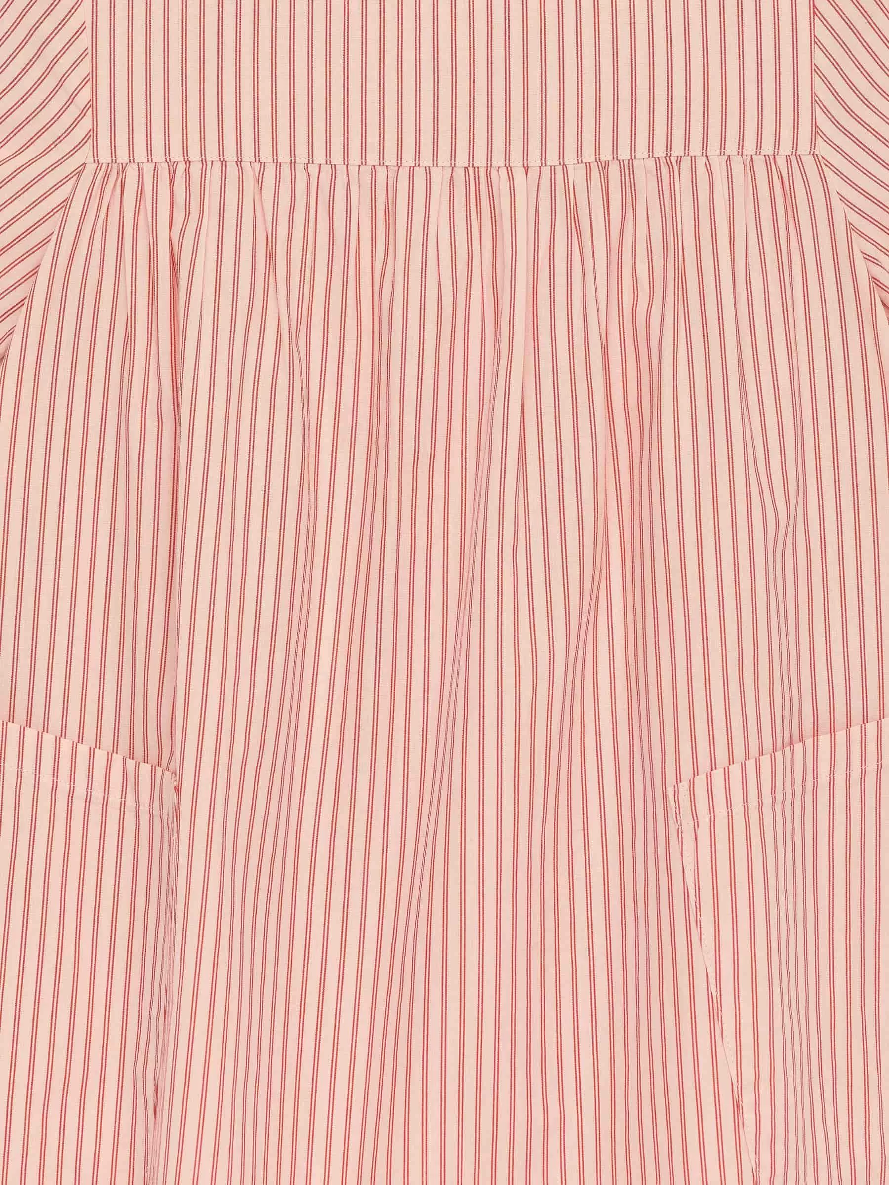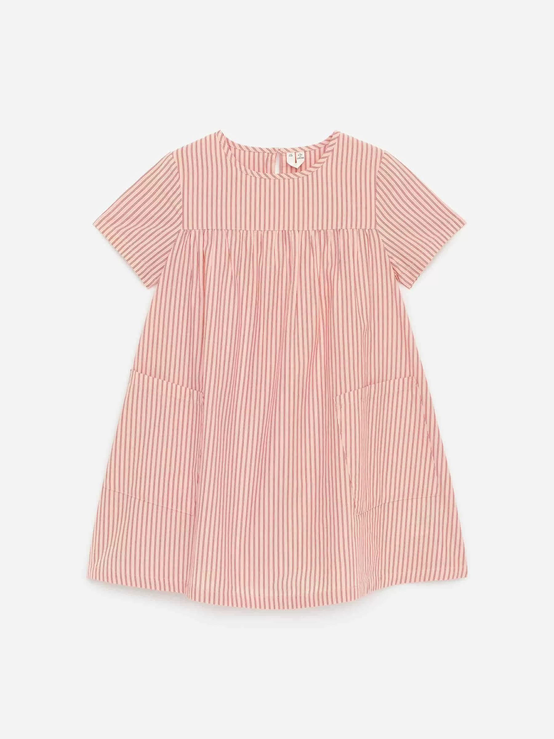 Dieses Sommerkleid ist aus einem weichen Popeline-Stoff aus Baumwolle gefertigt. Die kurzen Ärmel und die voluminöse Silhouette verleihen diesem Kleid ein luftiges Tragegefühl. Es hat oben sowohl vorne als auch hinten eine Passe und darunter Falten. Detailliert mit zwei aufgesetzten Taschen vorne und einer Schlüssellochöffnung mit Knopfverschluss hinten am Hals. Ungefüttert.