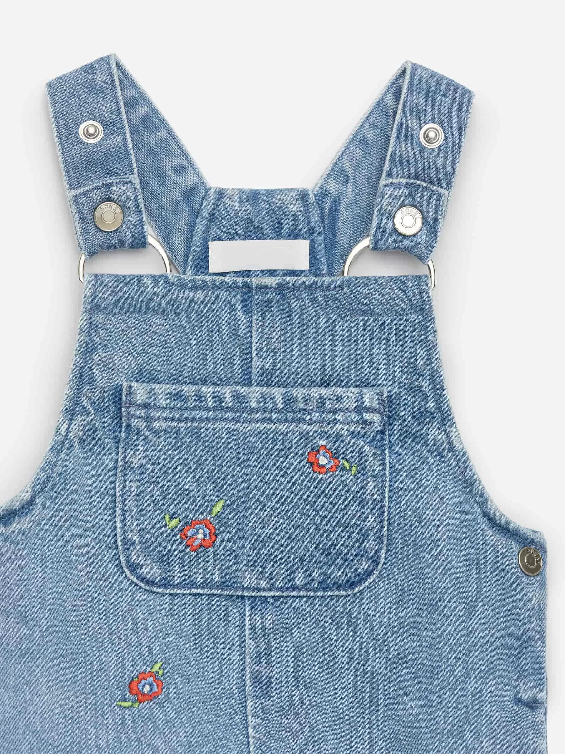Jeans-Latzhose mit gestickten Details. Ausgestattet mit einer Brusttasche, einer Gesäßtasche und Druckknöpfen im Schritt für alle Größen außer 86 und 92. Verstellbare Schultergurte.