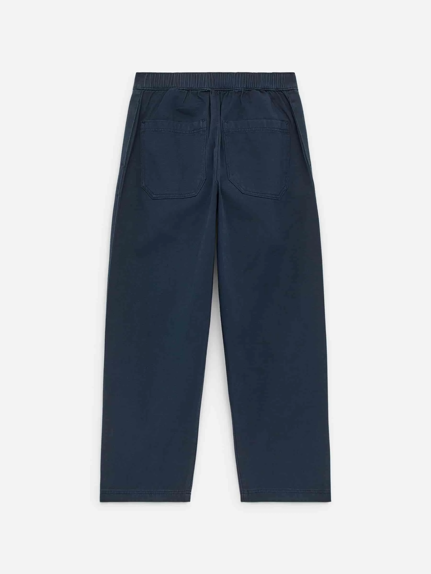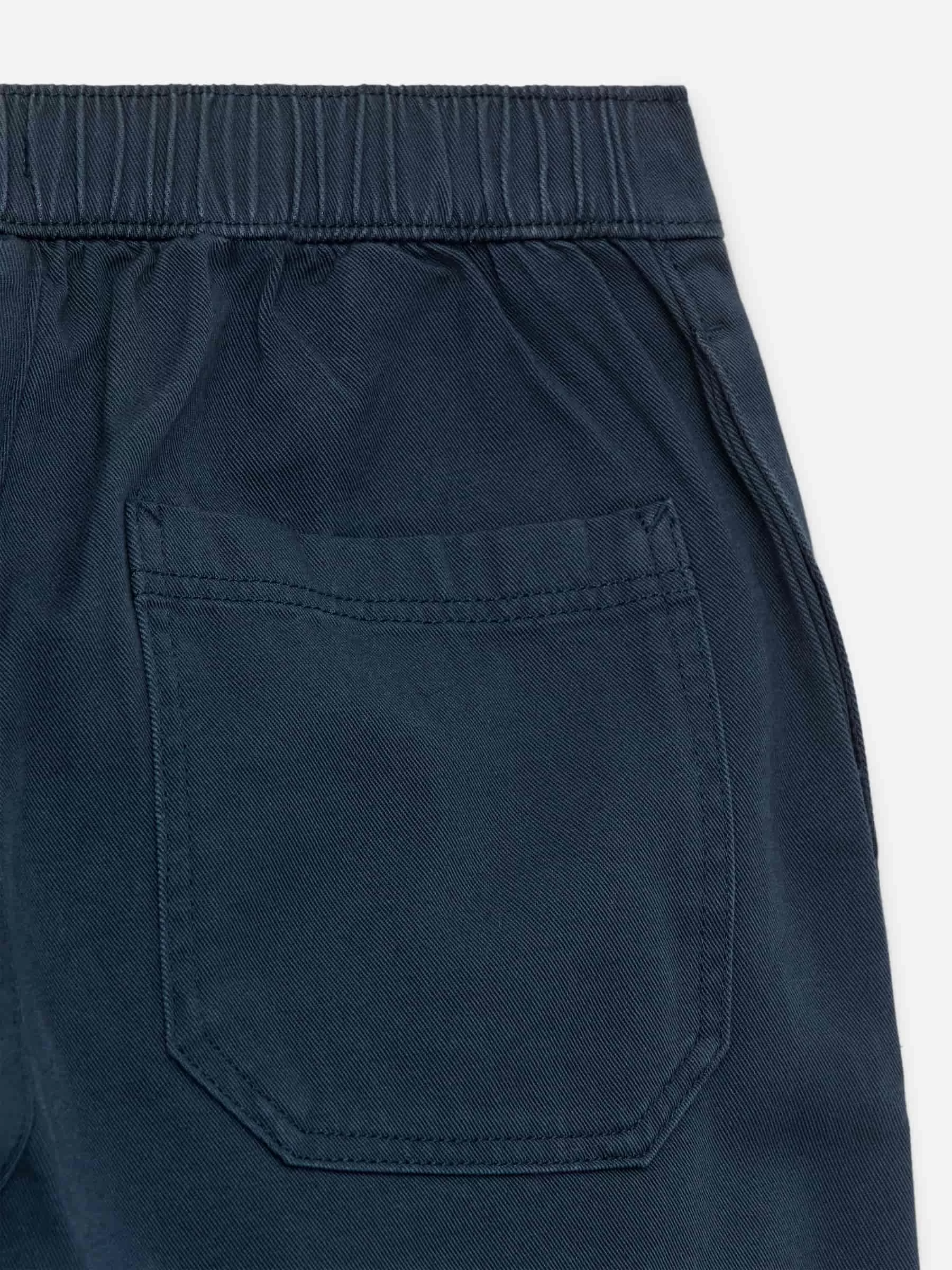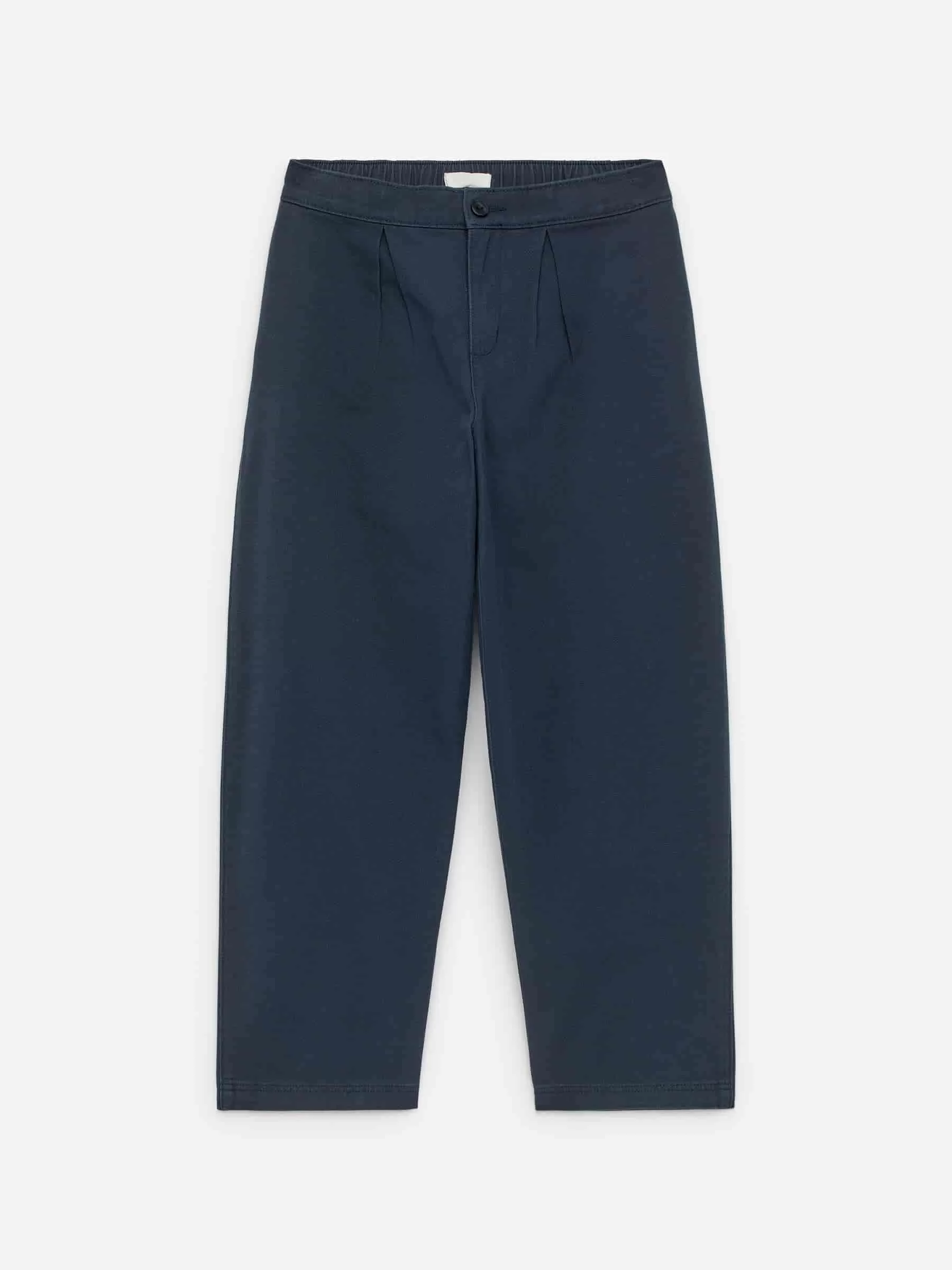 Hose mit Falten vorne, verstellbarem Gummizug in der Taille sowie Reißverschluss und Knopfverschluss. Taschen an den Seitennähten und aufgesetzte Gesäßtaschen.