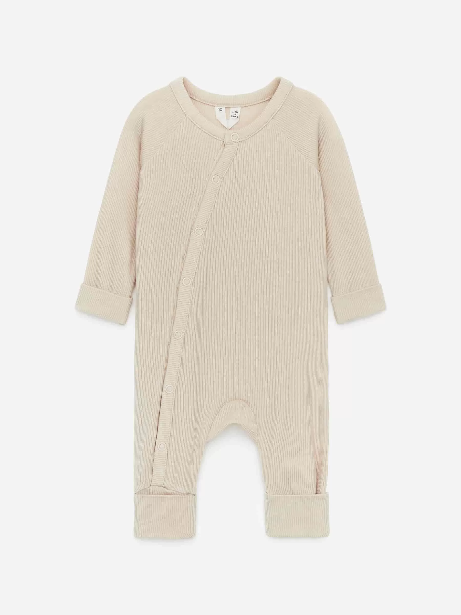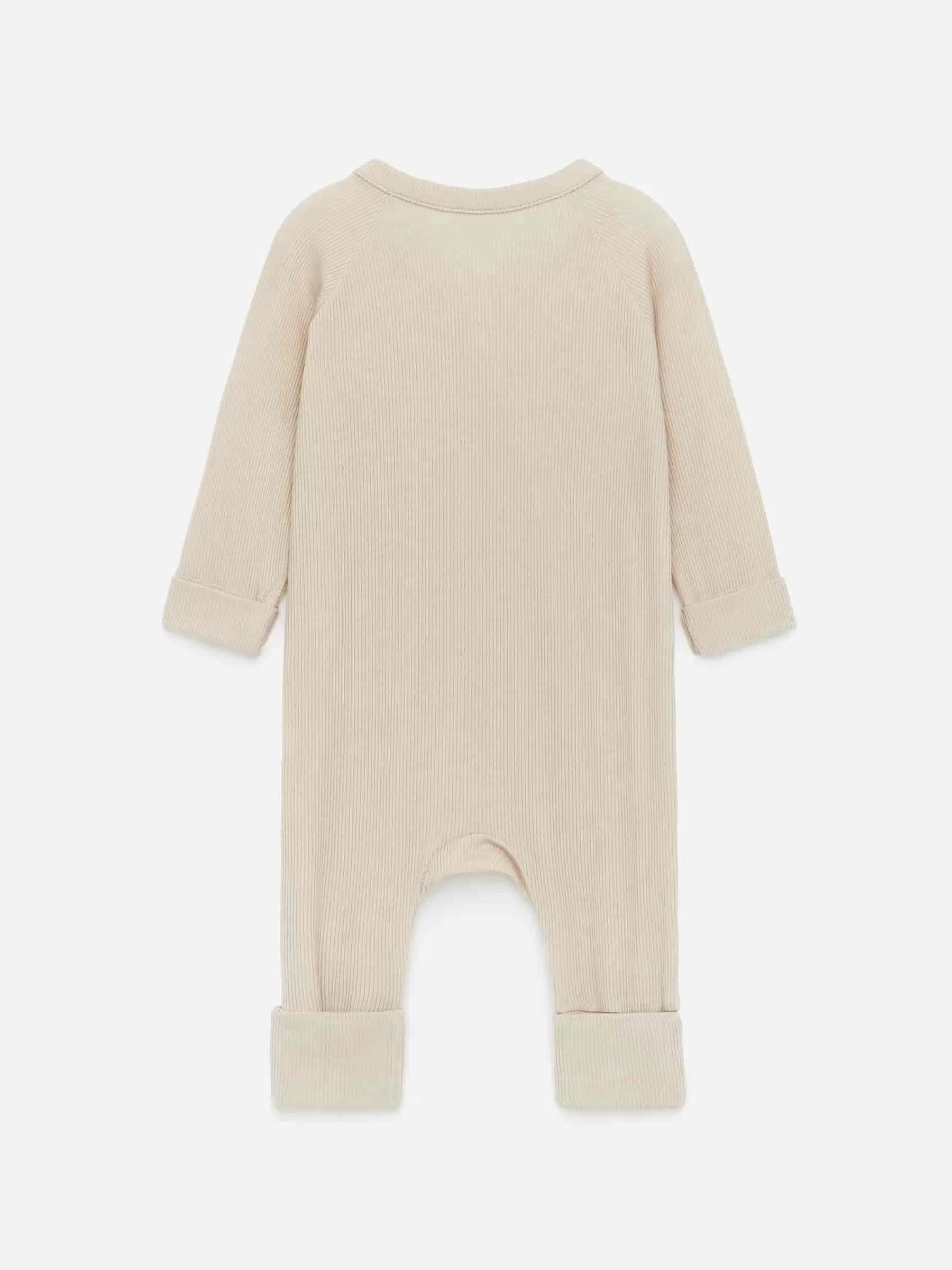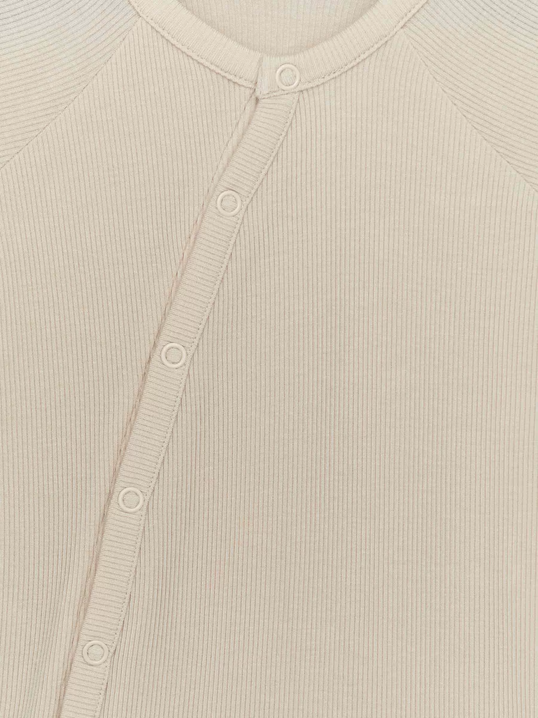Langarm-Pyjama für das Neugeborene. Hergestellt aus einem ultraweichen und leichten Rippjersey aus Lyocell und Elasthan für Dehnbarkeit. Die Manschetten sind über Hände und Füße faltbar. Diagonal angeordnete Druckknöpfe vorne zum einfachen An- und Ausziehen.