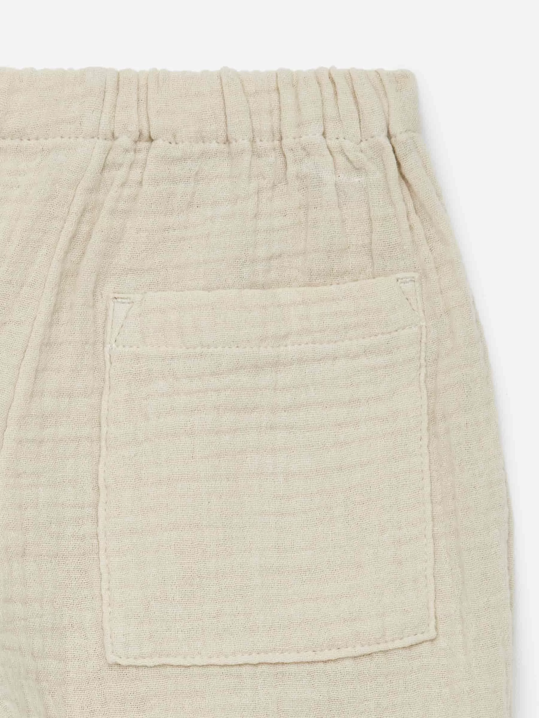 Locker geschnittene Hose aus weichem Musselingewebe aus Baumwolle. Ausgestattet mit einem verstellbaren Bund und einer einzelnen Gesäßtasche.