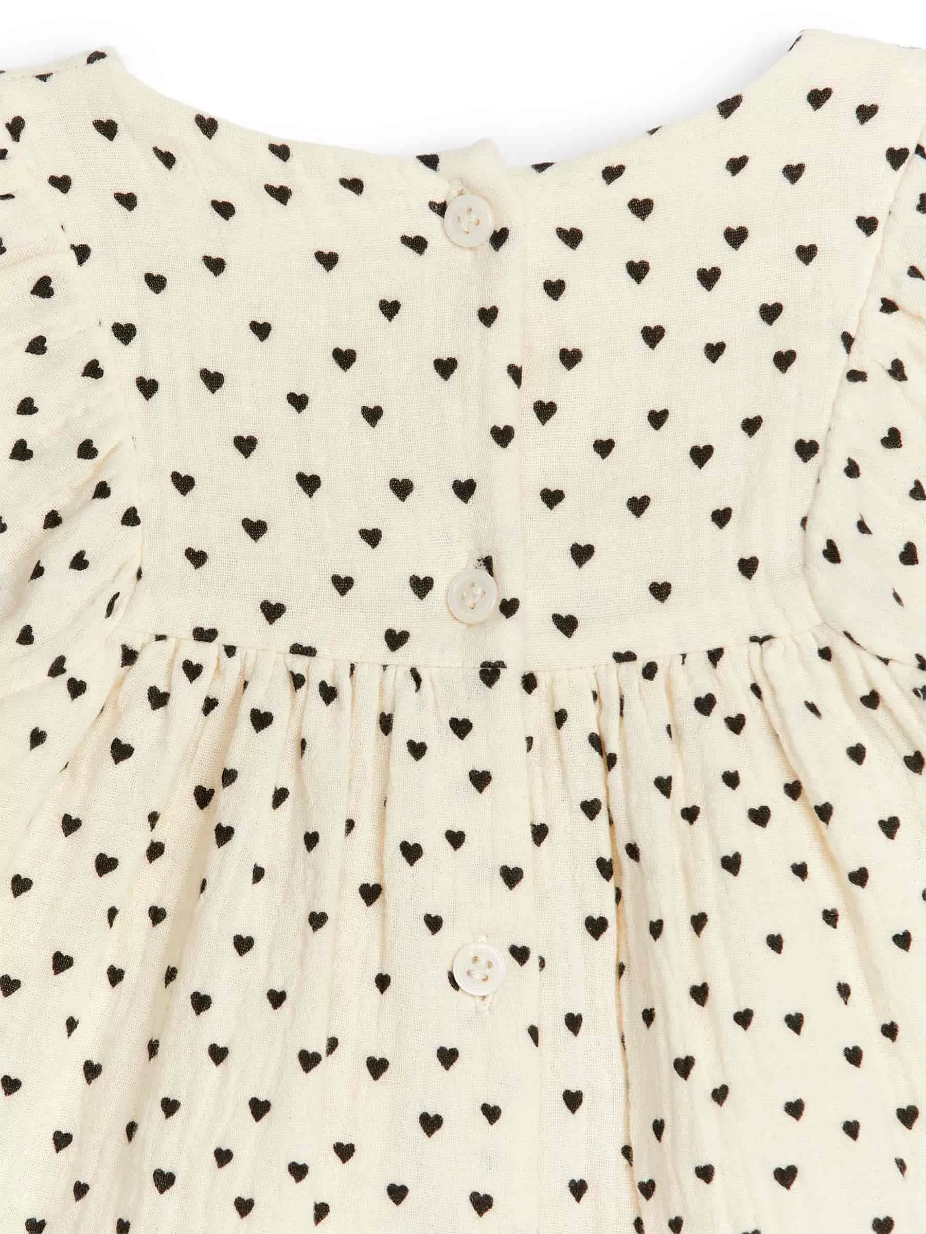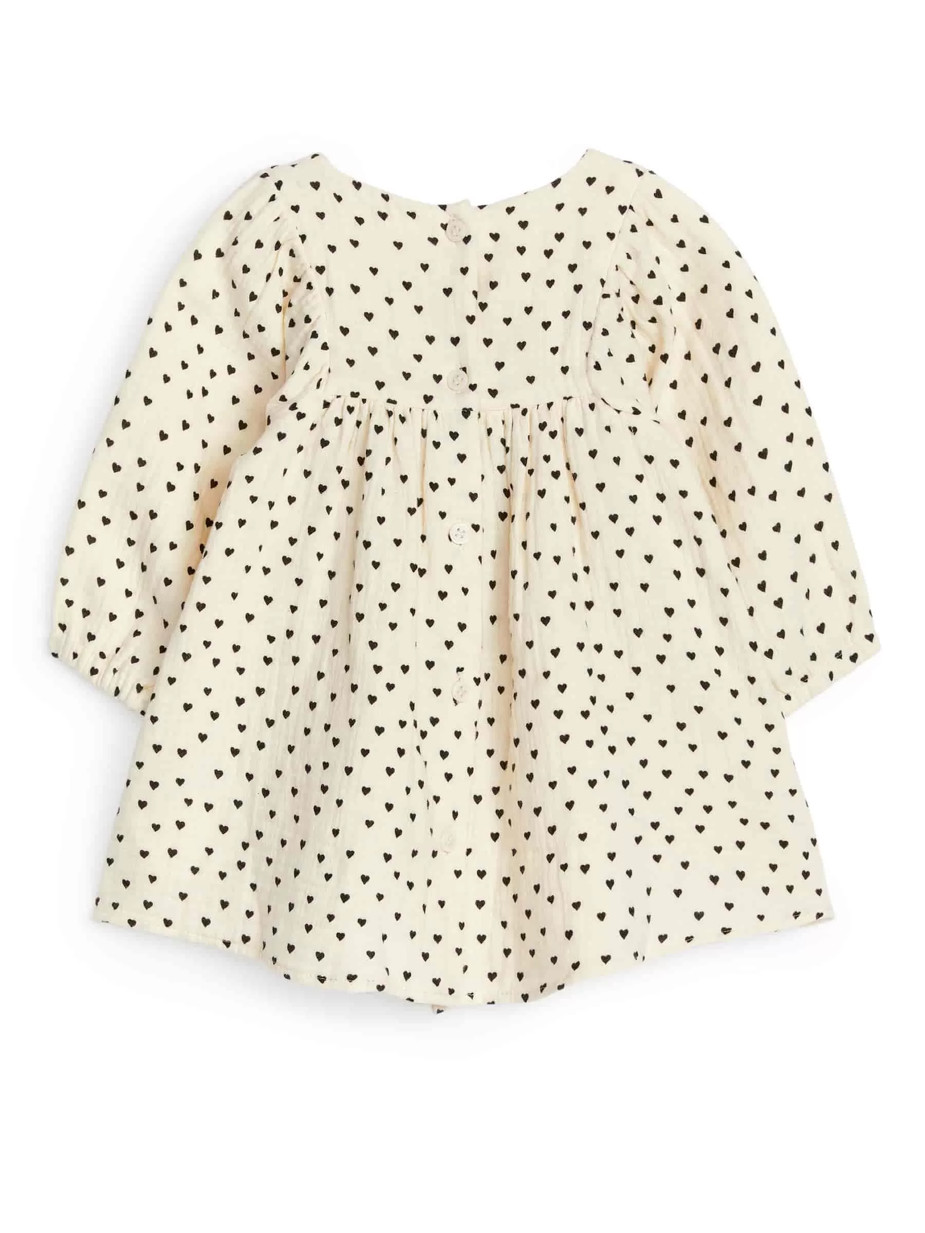Langärmliges Kleid aus weichem Baumwoll-Musselin mit fühlbarer Textur. Ein übergroßes Modell mit Knopfverschluss in der Mitte des Rückens und Puffärmeln mit Gummizügen an den Enden.