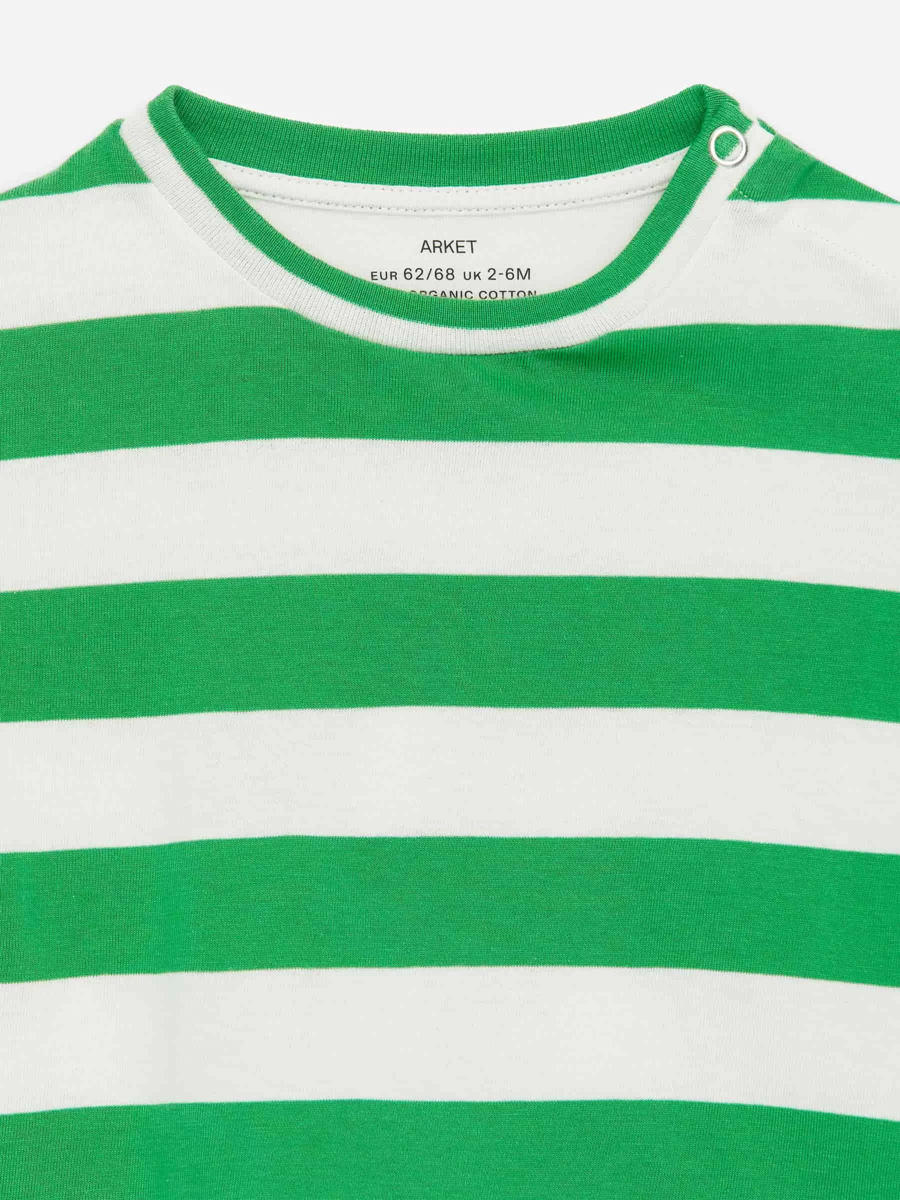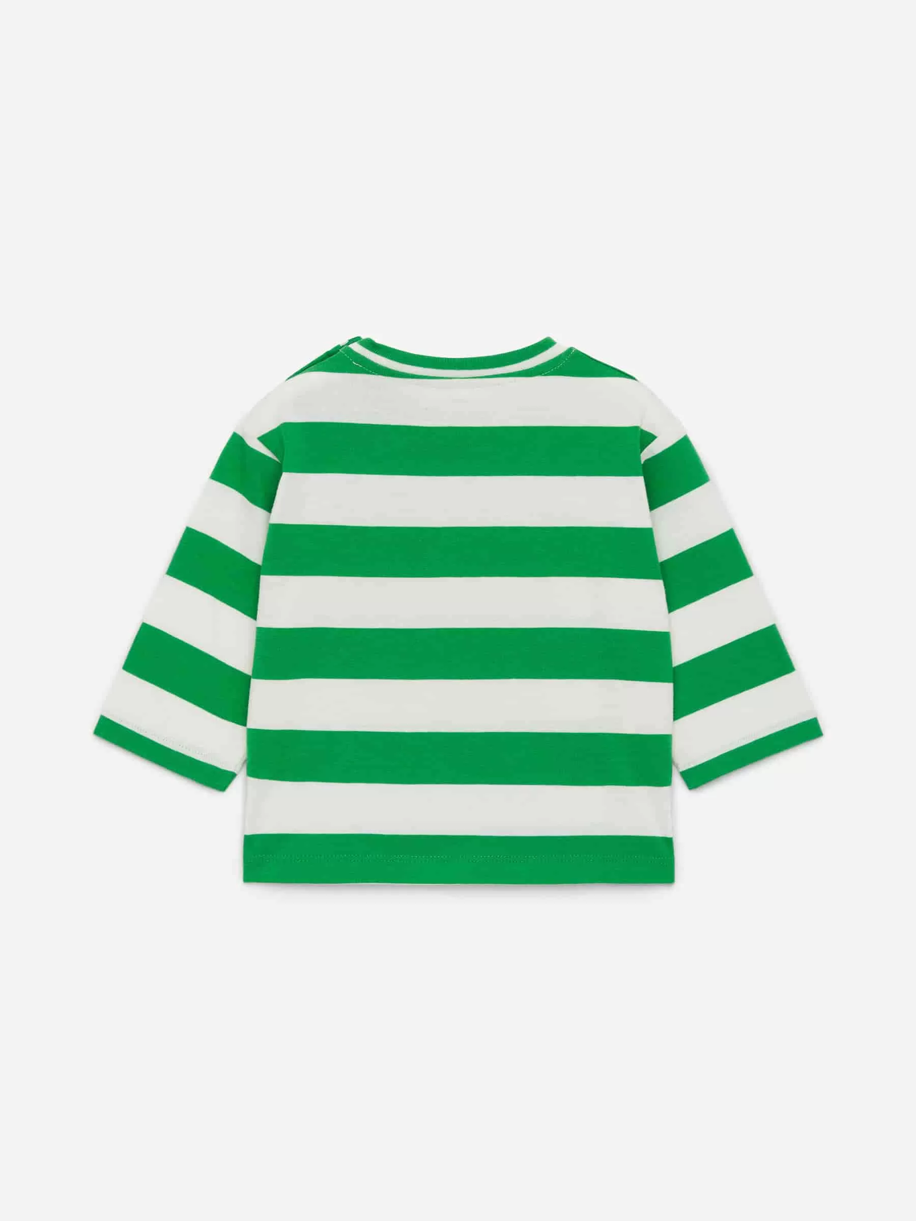 Langarmshirt aus weichem Baumwoll-Single-Jersey genäht. Ein Rundhalsausschnitt mit Druckknöpfen an der linken Schulter zum einfachen Anziehen. Kleine Schlitze an den Seitennähten.
