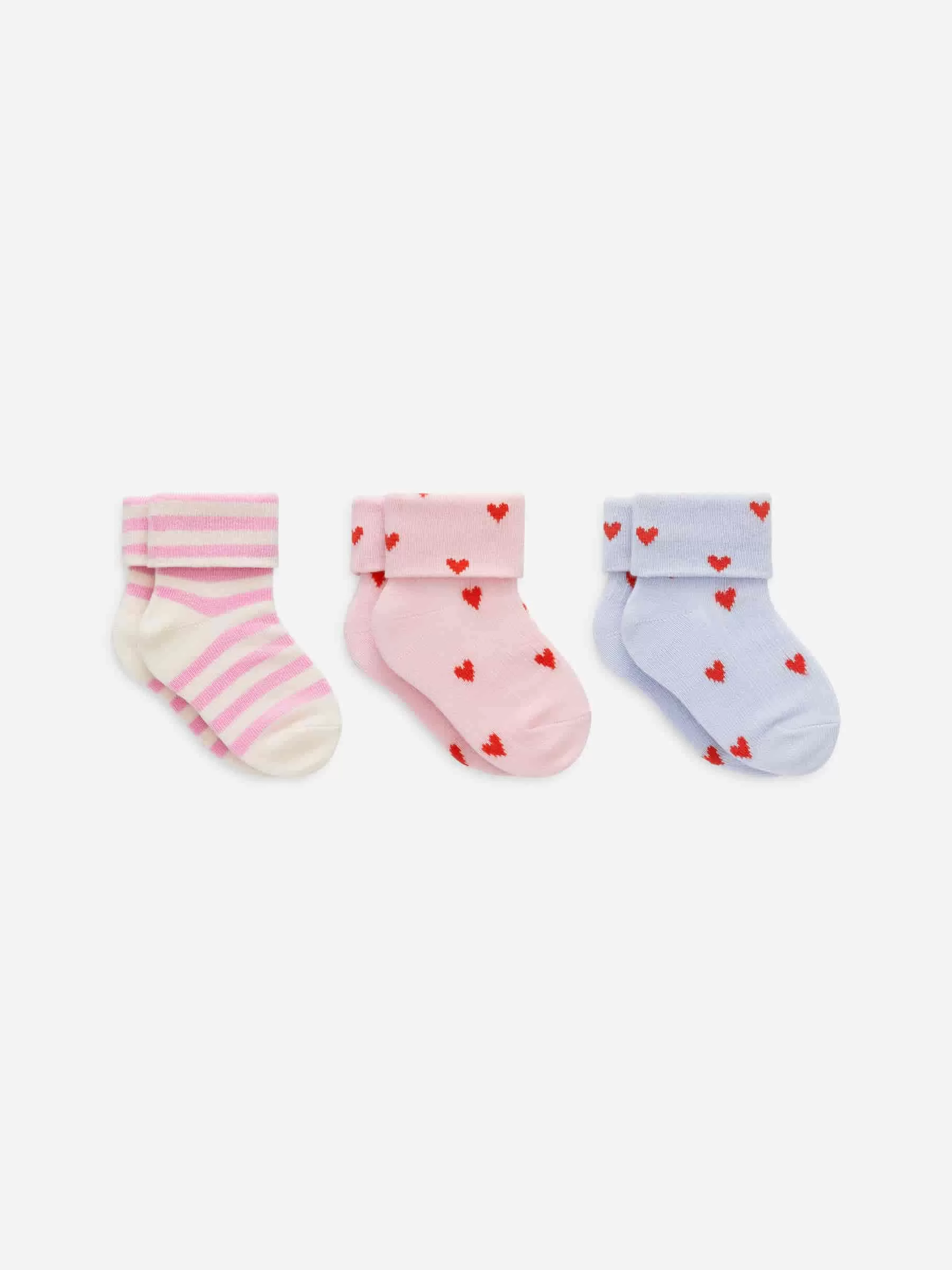 Rippengestrickte Babysocken aus einer Baumwollmischung. Gerippte, gefaltete Oberseite für einen Stay-up-Effekt. Verstärkte Spitze und Ferse. Verkauft im Set mit drei Paaren.