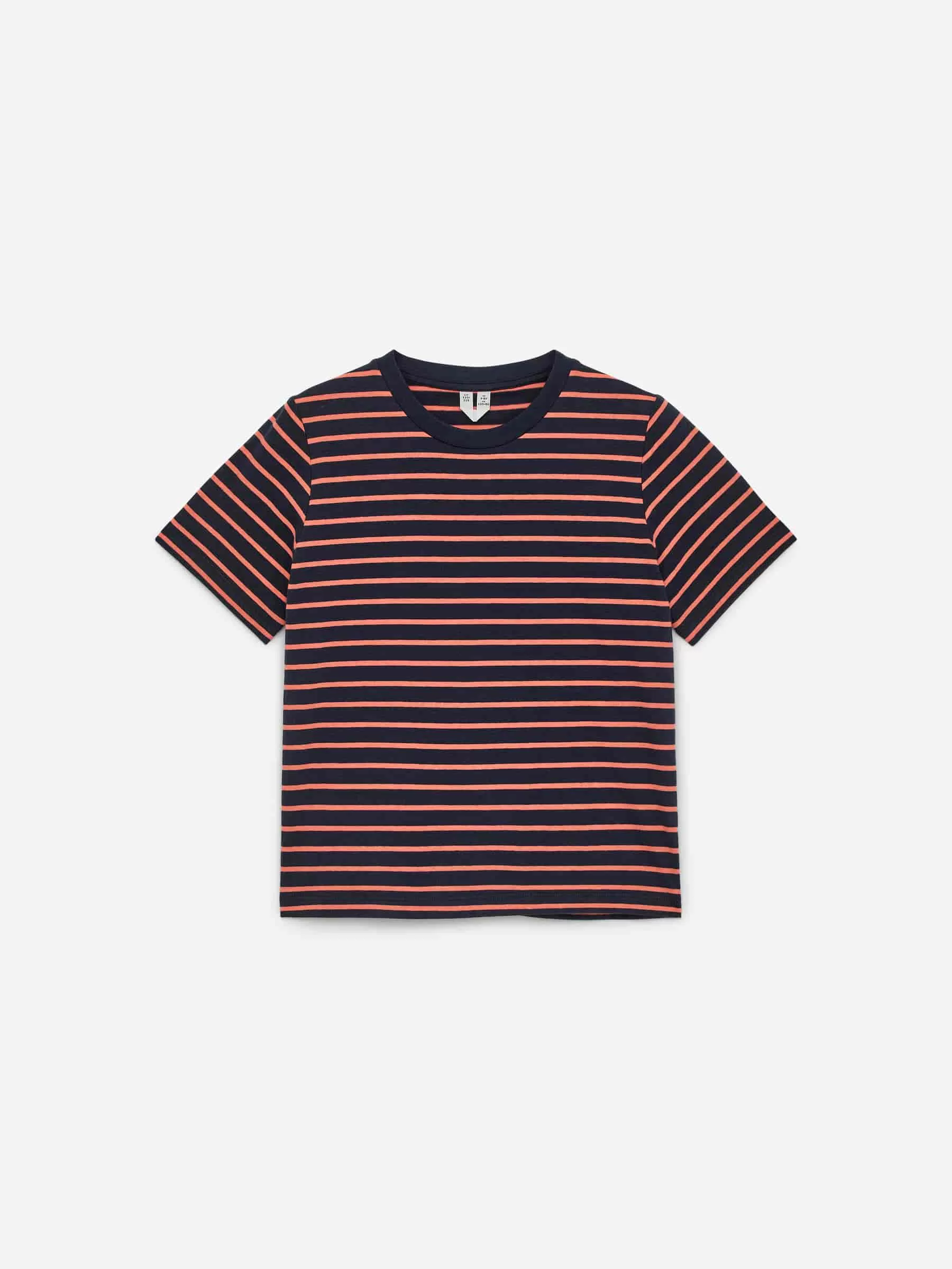 Kastenförmiges T-Shirt aus glattem Baumwolljersey. Es verfügt über ein garngefärbtes Streifenmuster und ist mit einem gerippten Rand am Rundhalsausschnitt versehen.