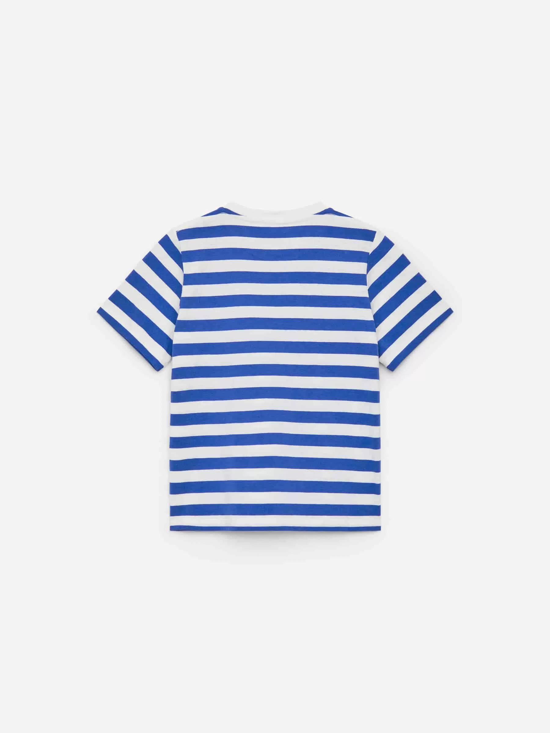 Kastenförmiges T-Shirt aus glattem Baumwolljersey. Es verfügt über ein garngefärbtes Streifenmuster und ist mit einem gerippten Rand am Rundhalsausschnitt versehen.