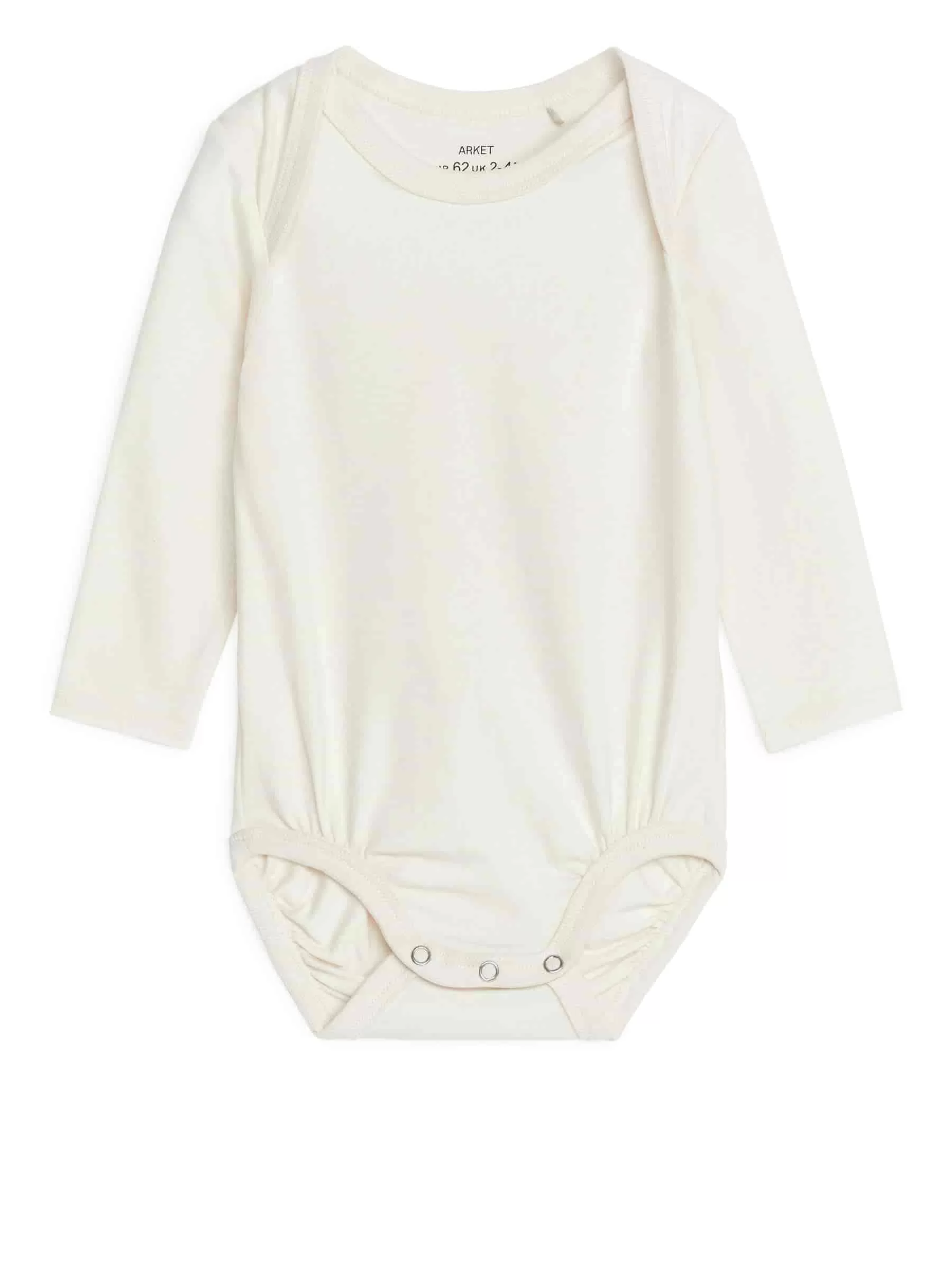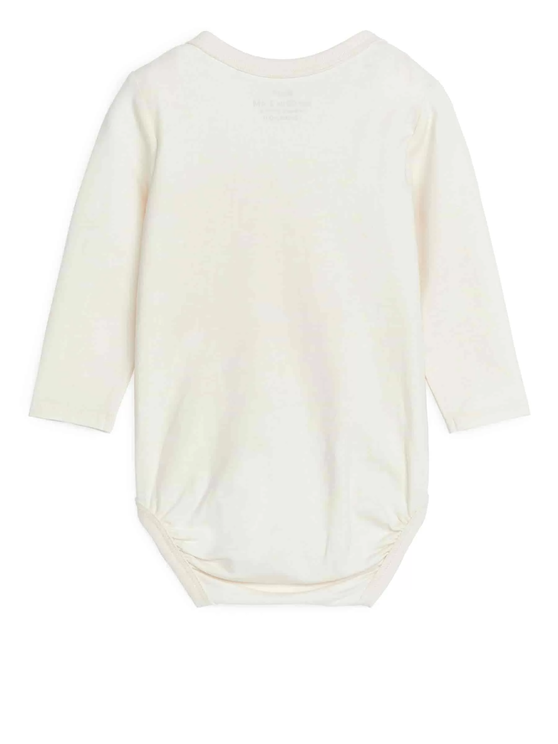 Body für das Neugeborene. Hergestellt aus einem ultraweichen, dehnbaren Baumwolljersey mit gebürsteter Oberfläche für ein pfirsichartiges Tragegefühl. Mit einem Umschlagausschnitt und Druckknöpfen im Schritt zum einfachen Anziehen.